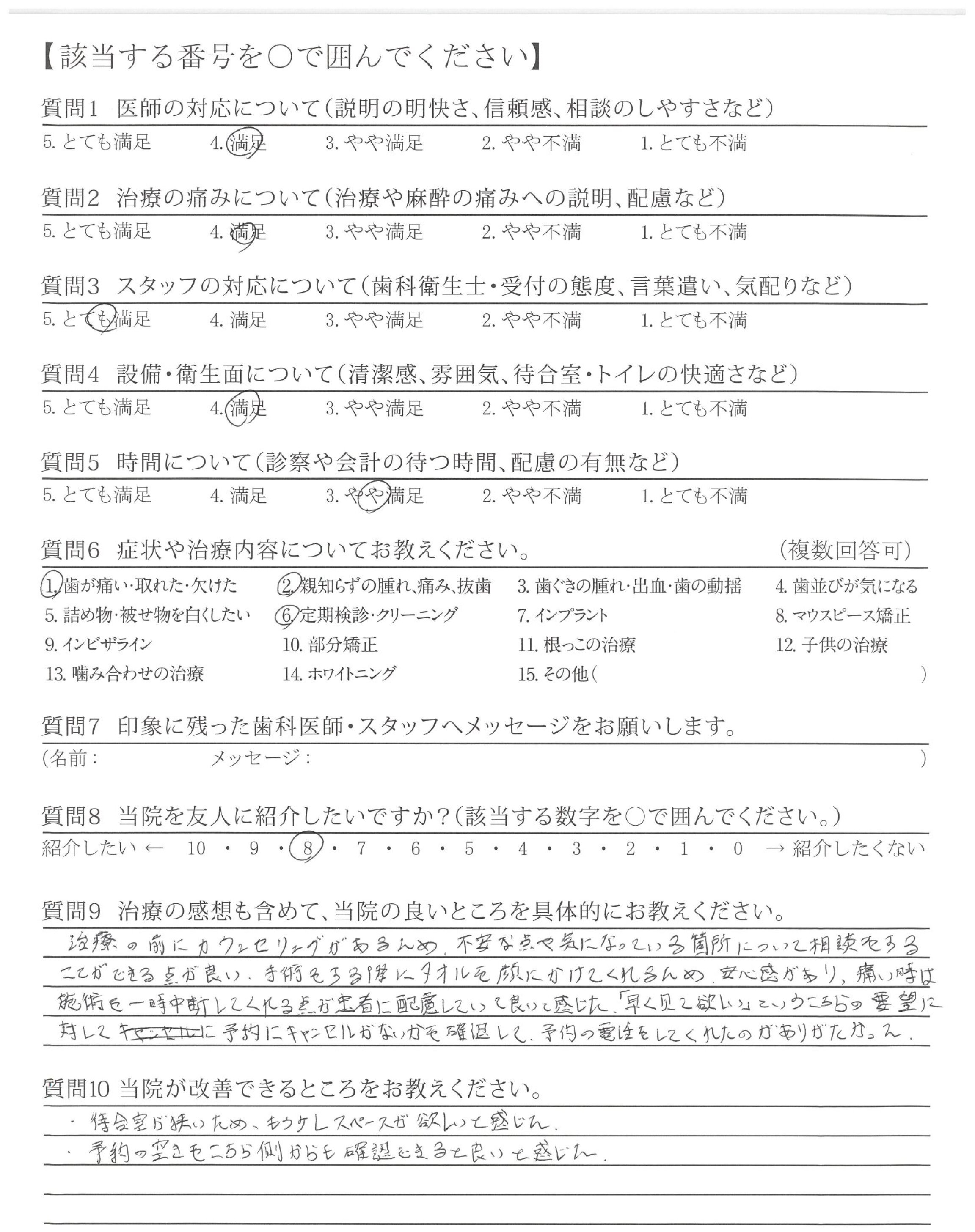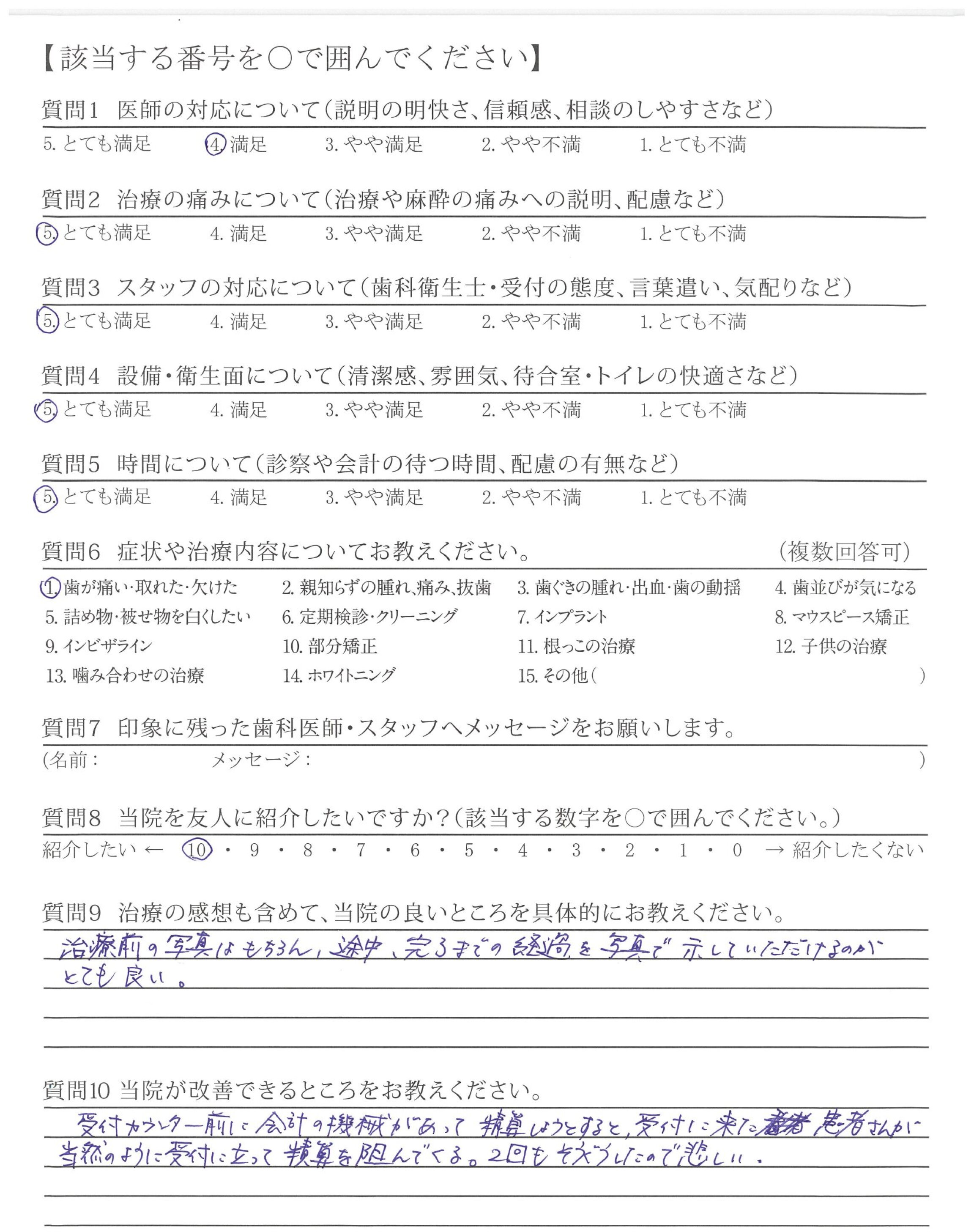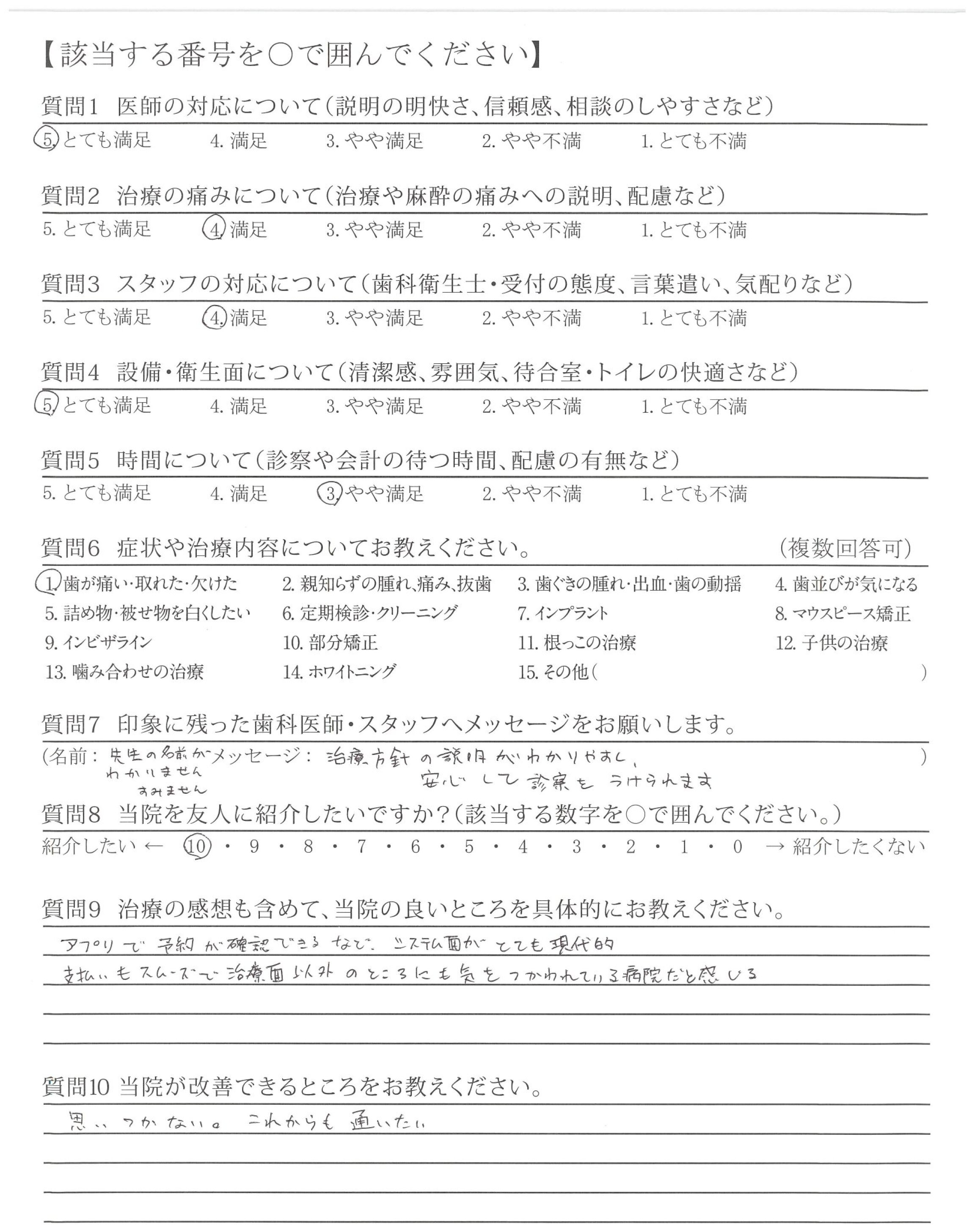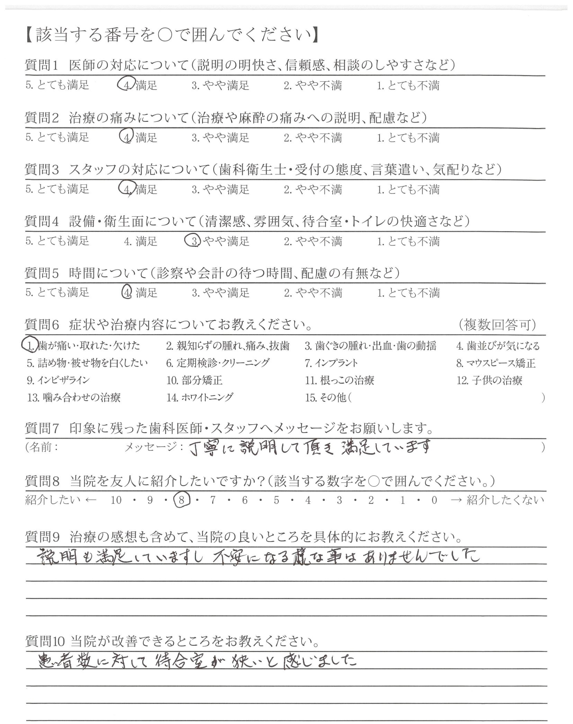 治療に関して、様々な不安に思うところがありましたが、一つ一つに丁寧にお答えいただき、安心して受けることができました。また、今後の生活も配慮してくださって治療内容をご説明していただいたため、現在も、不自由なく、過ごすことができています。