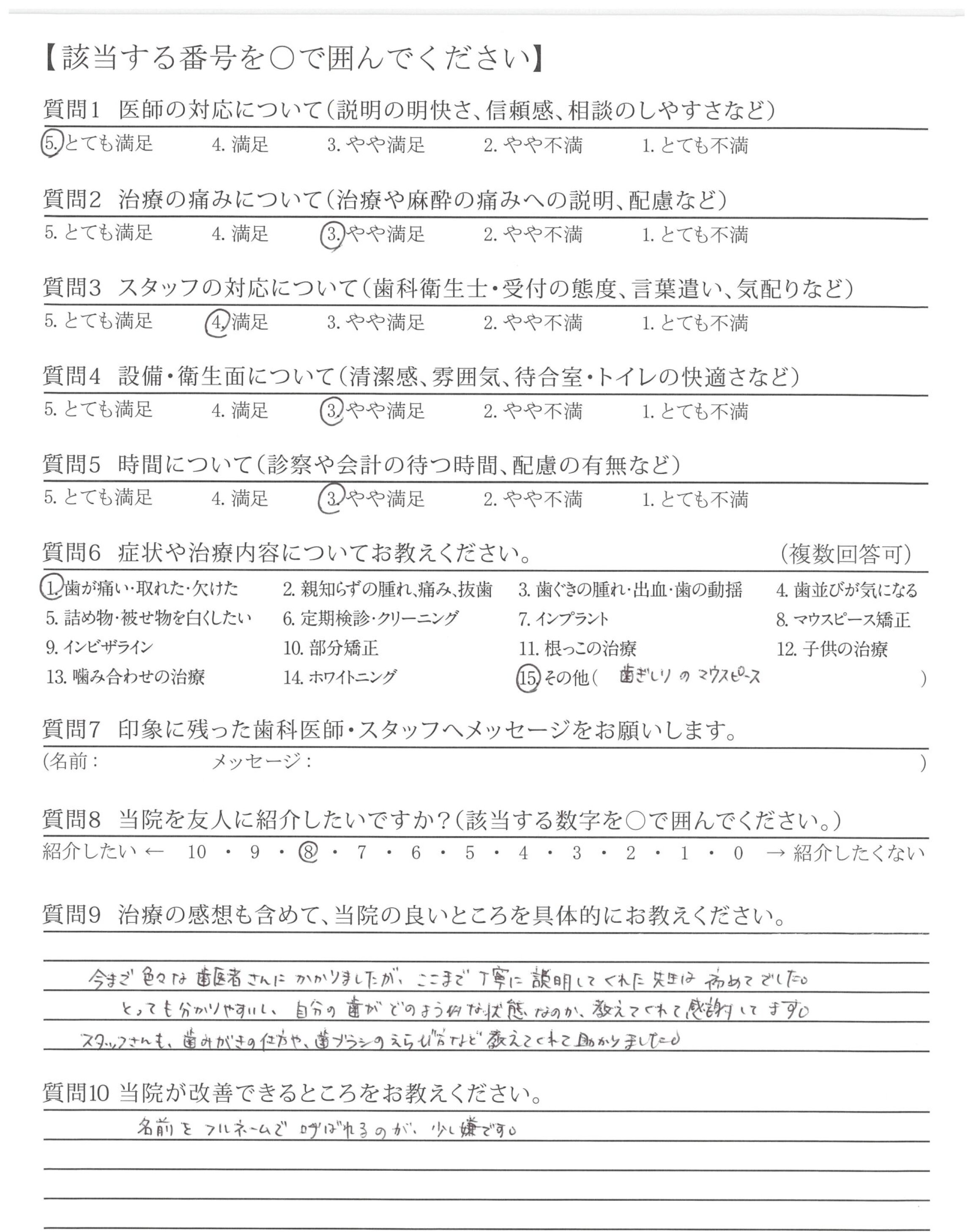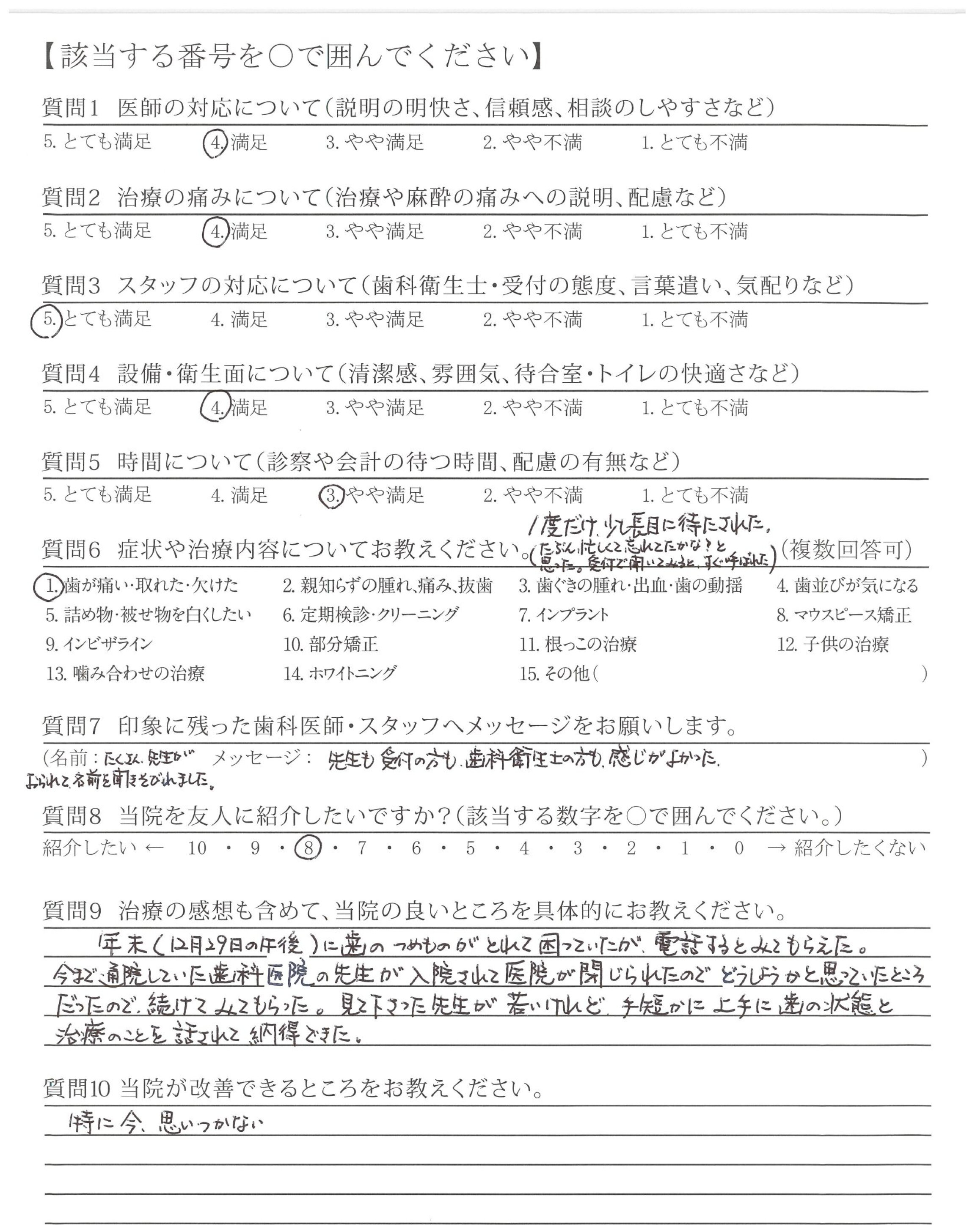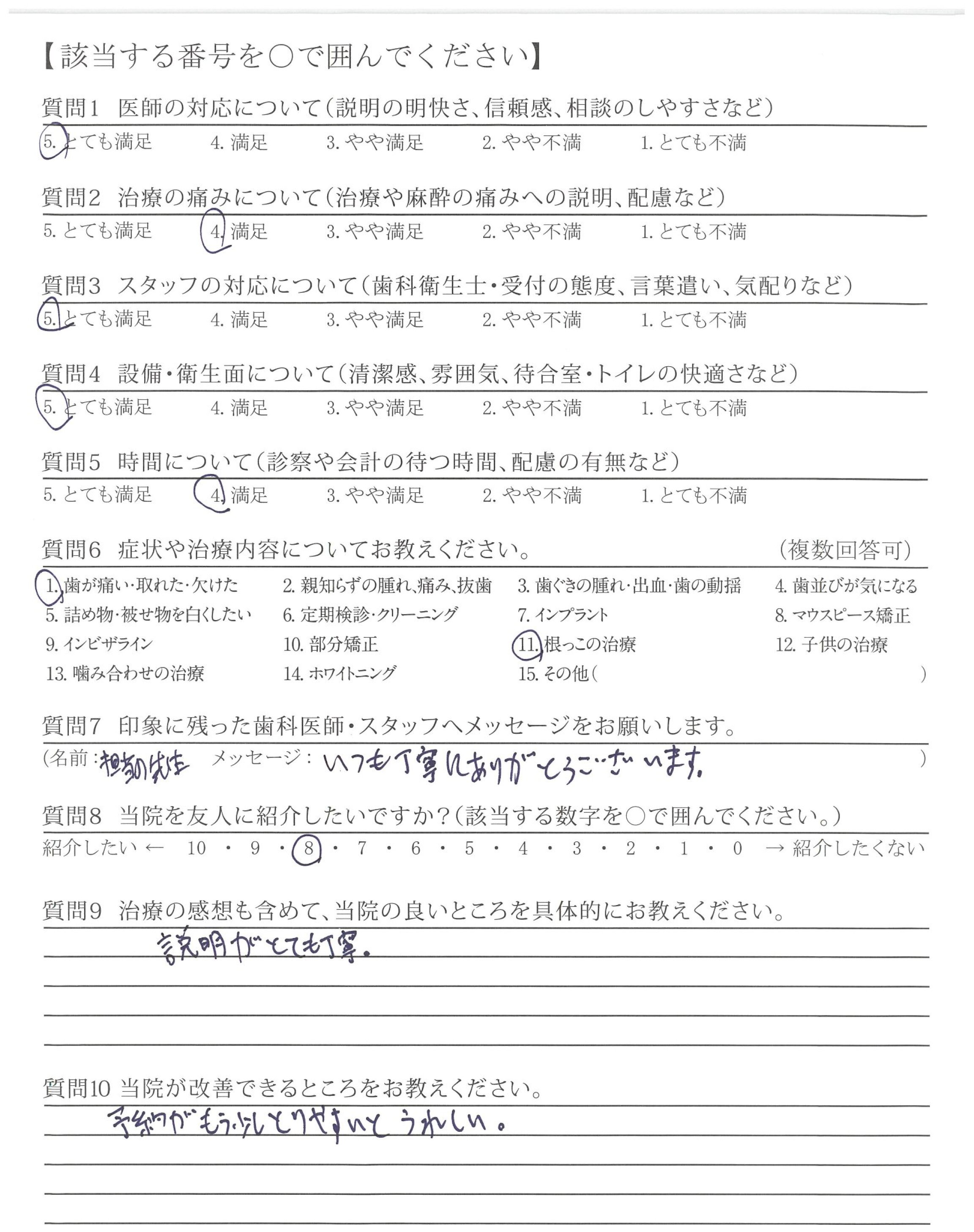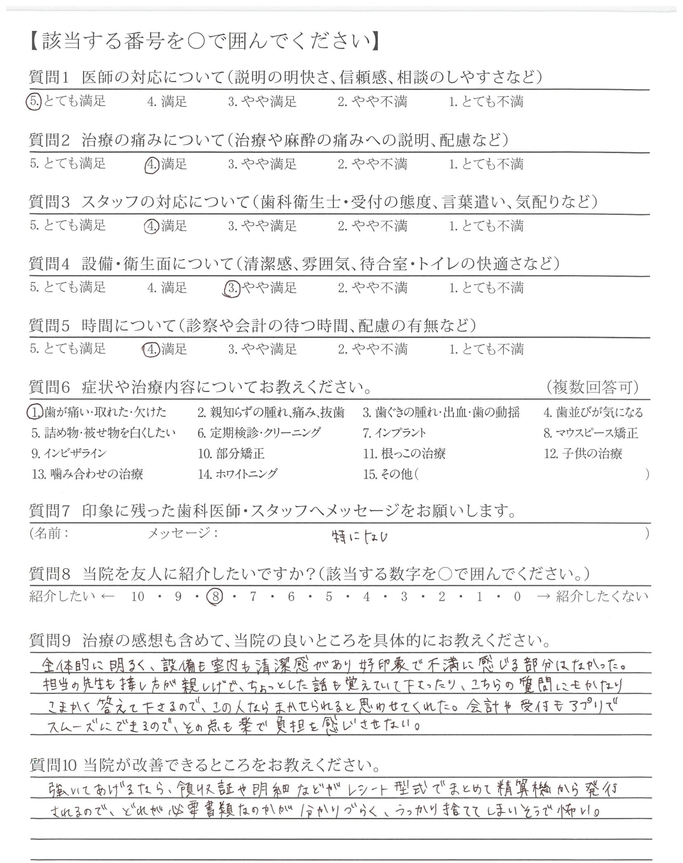 治療に関して、様々な不安に思うところがありましたが、一つ一つに丁寧にお答えいただき、安心して受けることができました。また、今後の生活も配慮してくださって治療内容をご説明していただいたため、現在も、不自由なく、過ごすことができています。