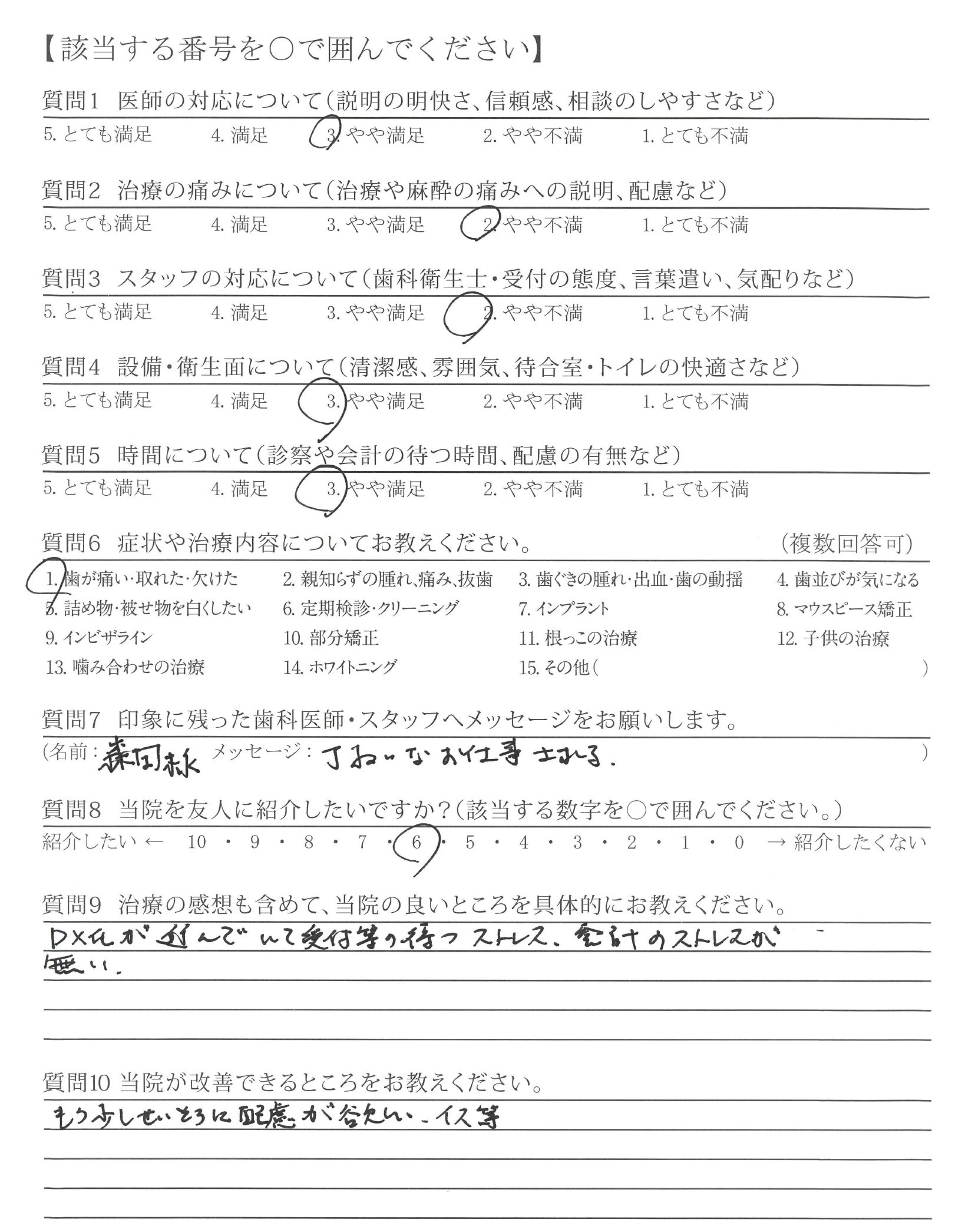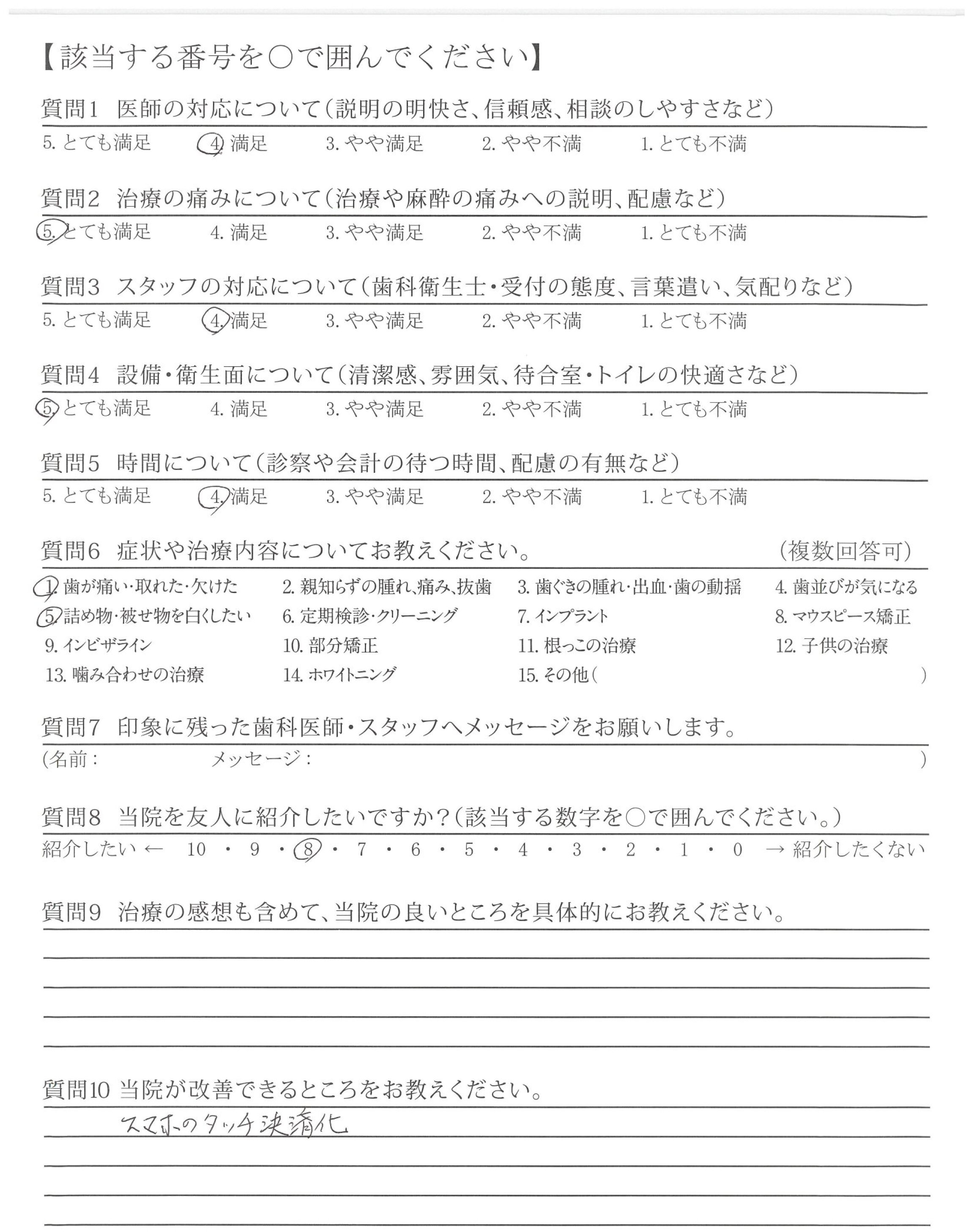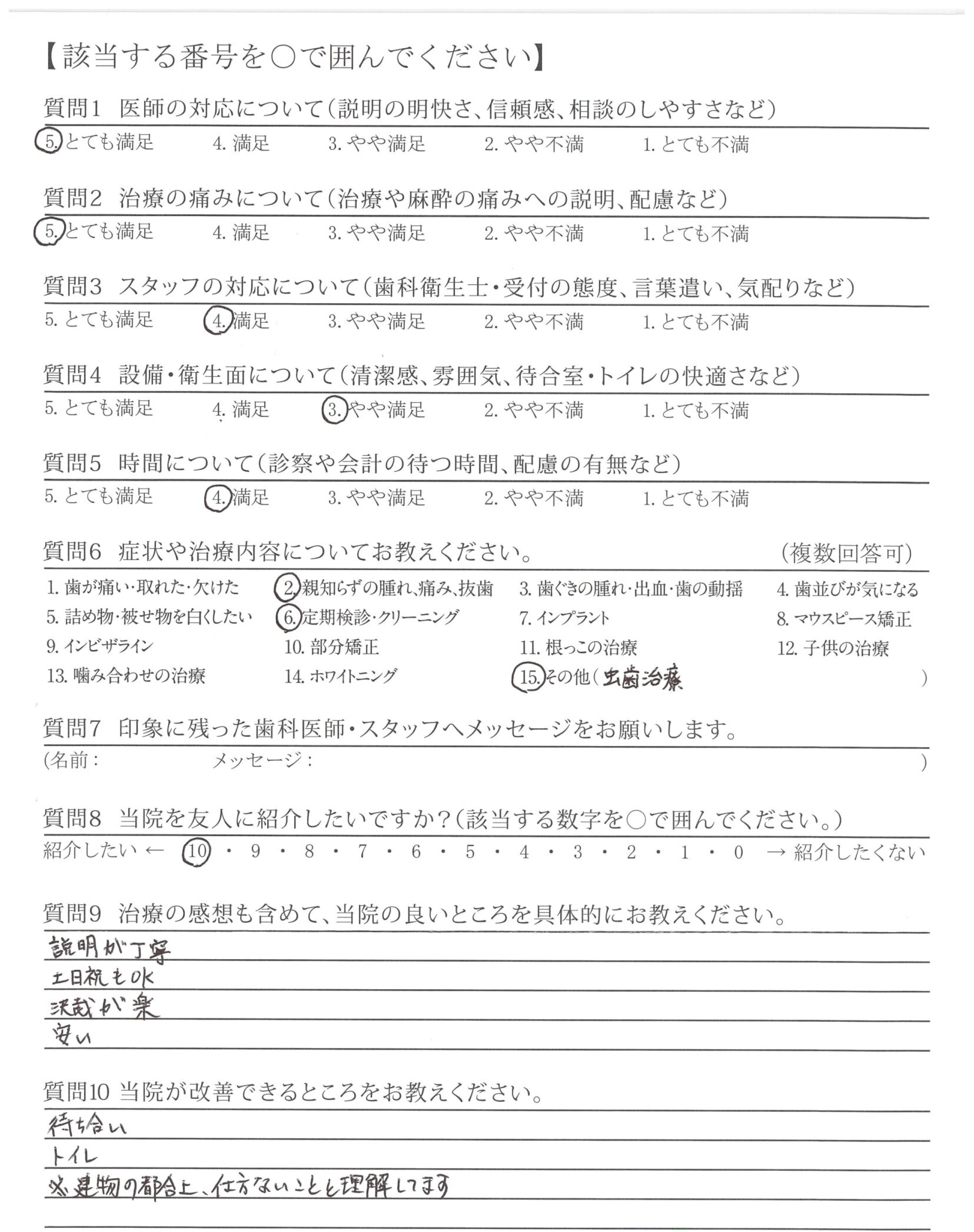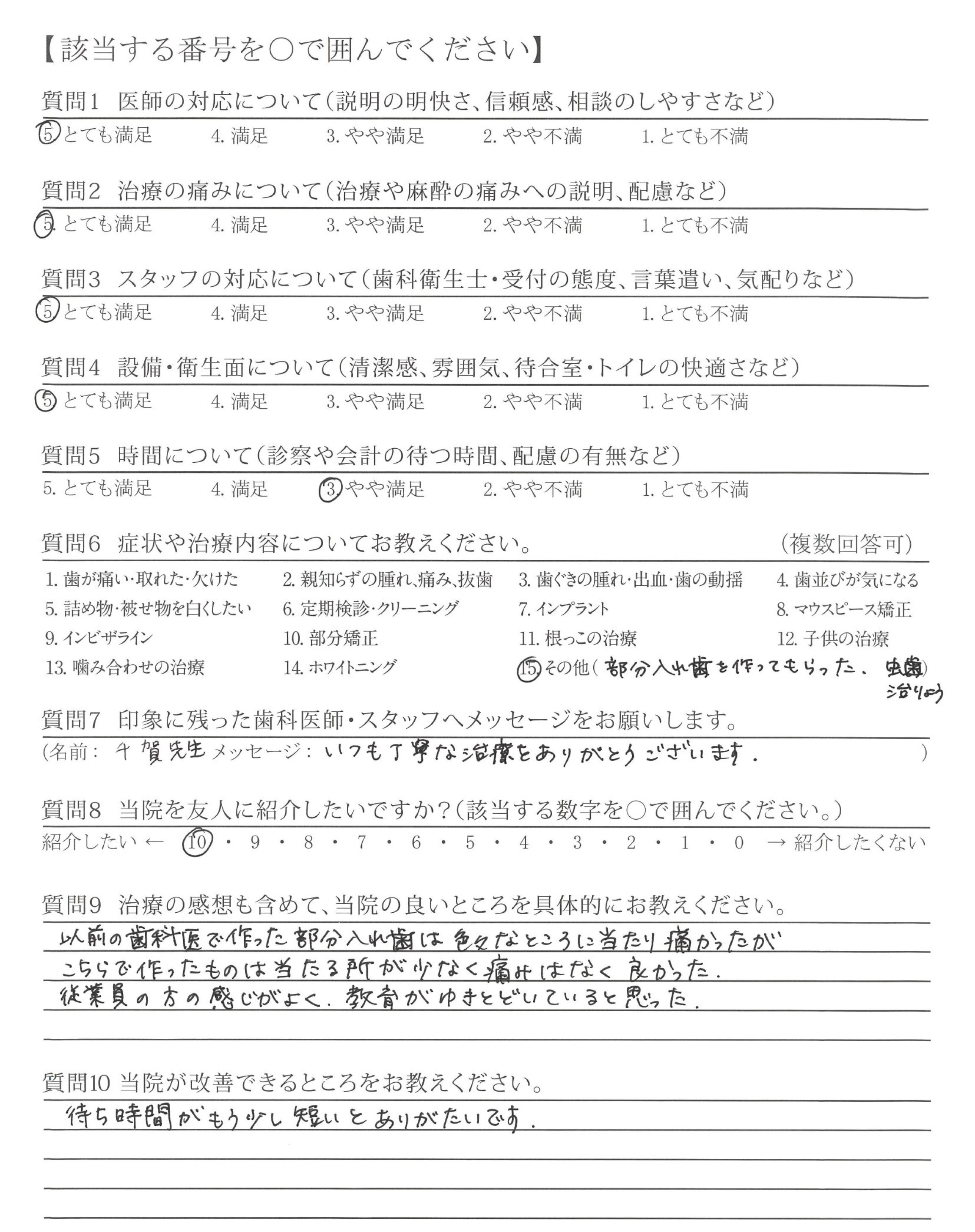 治療に関して、様々な不安に思うところがありましたが、一つ一つに丁寧にお答えいただき、安心して受けることができました。また、今後の生活も配慮してくださって治療内容をご説明していただいたため、現在も、不自由なく、過ごすことができています。