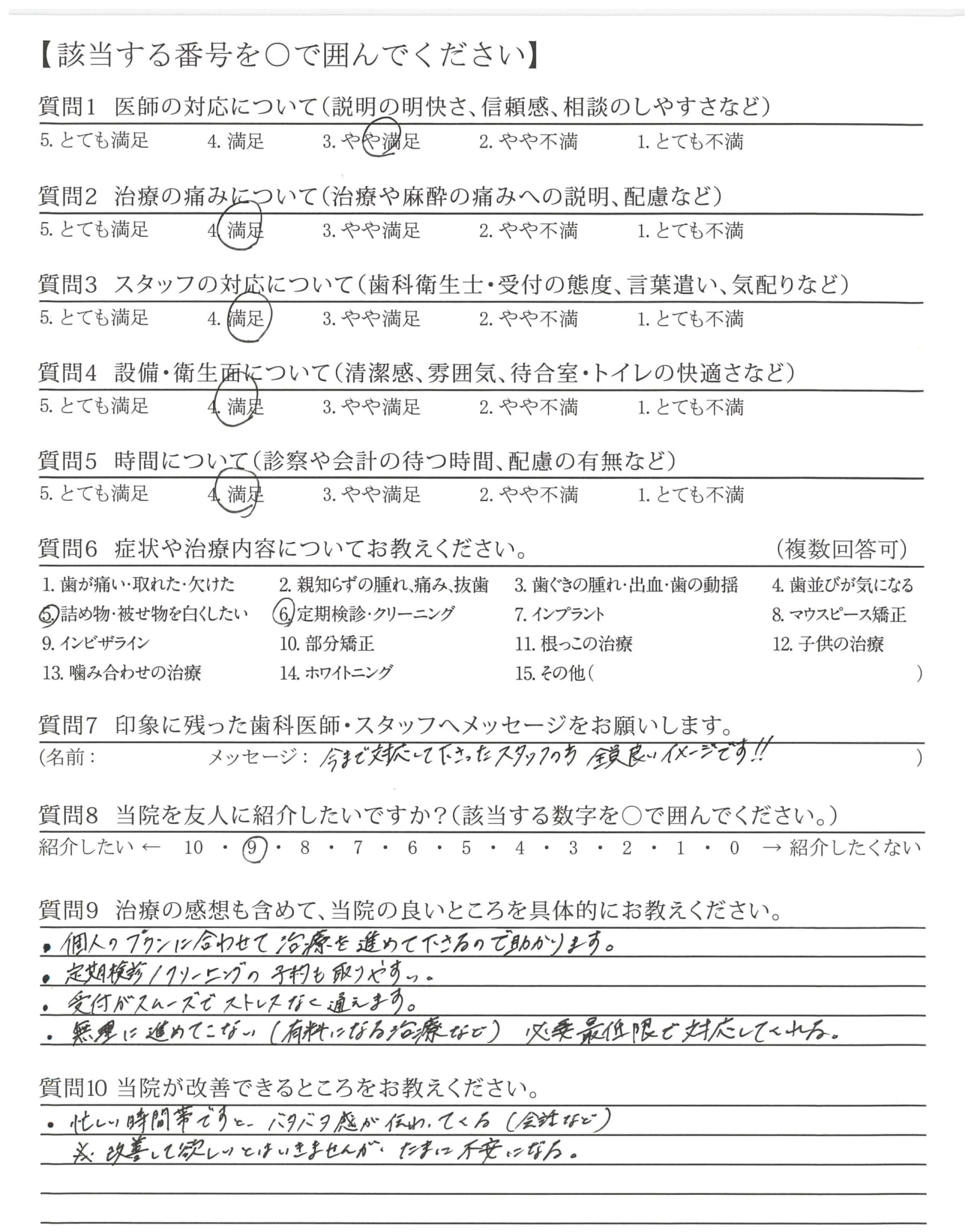 いつも痛みやかみ合わせ、細かいところまで気を配りながら、ていねいに治療を進めてくださり、ありがとうございます。安心して治療を受けられるので、ありがたいです。