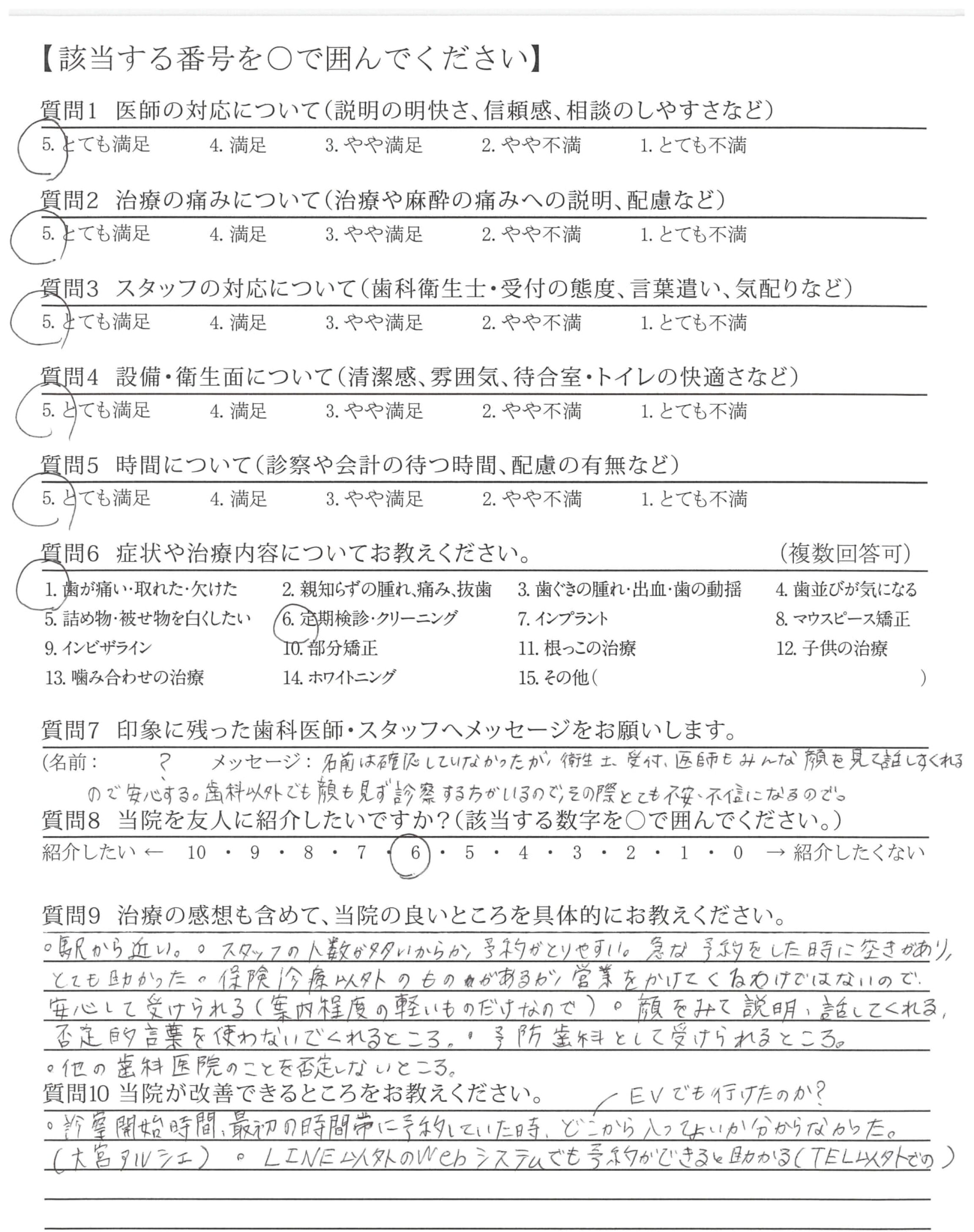 衛生士、受付、医師もみんな顔を見て話してくれるので安心する。歯科以外でも顔も見ず診察する方がいるので、その際とても不安、不信になるので。
