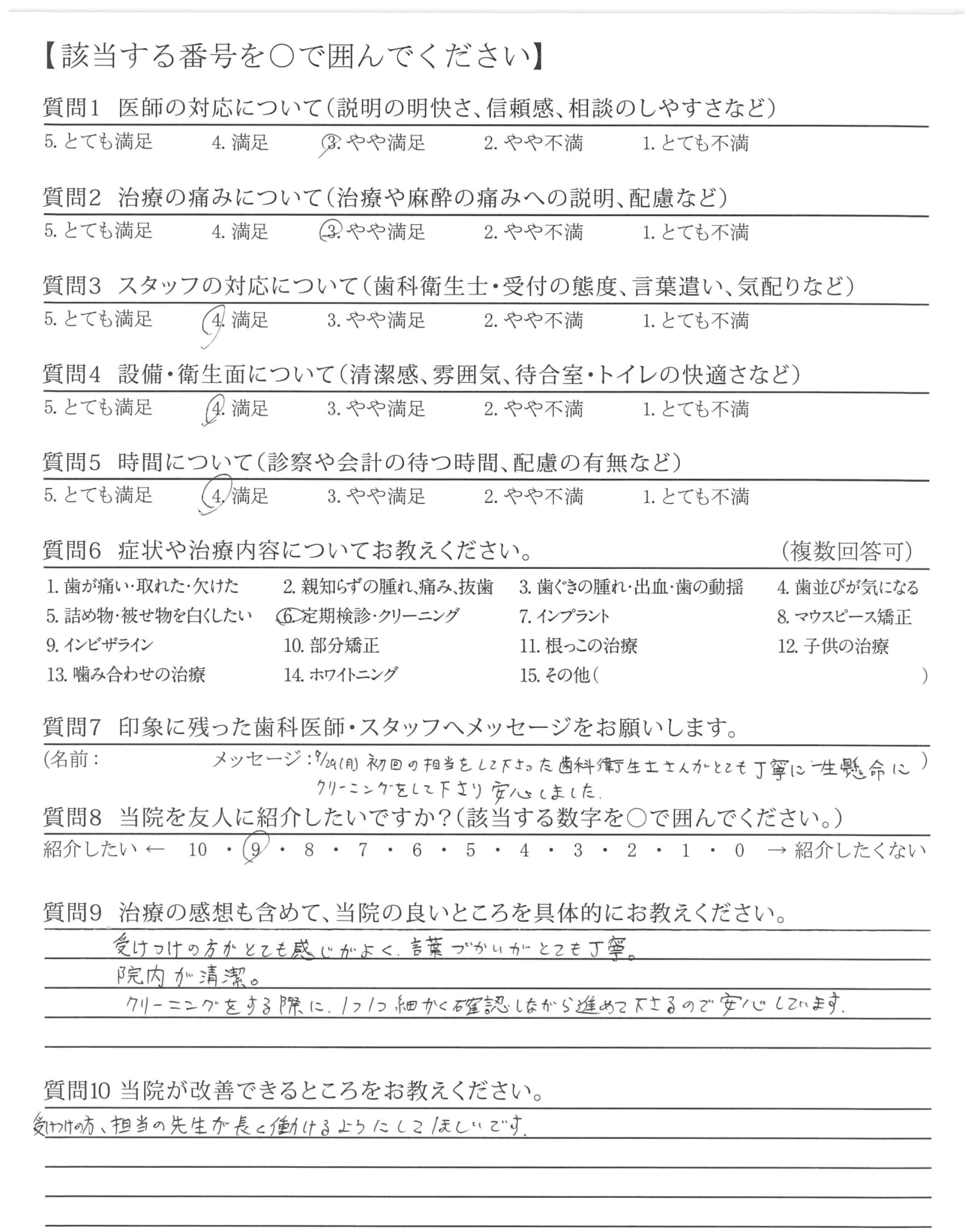 9/29(月)初回の担当をして下さった歯科衛生士さんがとても丁寧に一生懸命にクリーニングをして下さり安心しました。