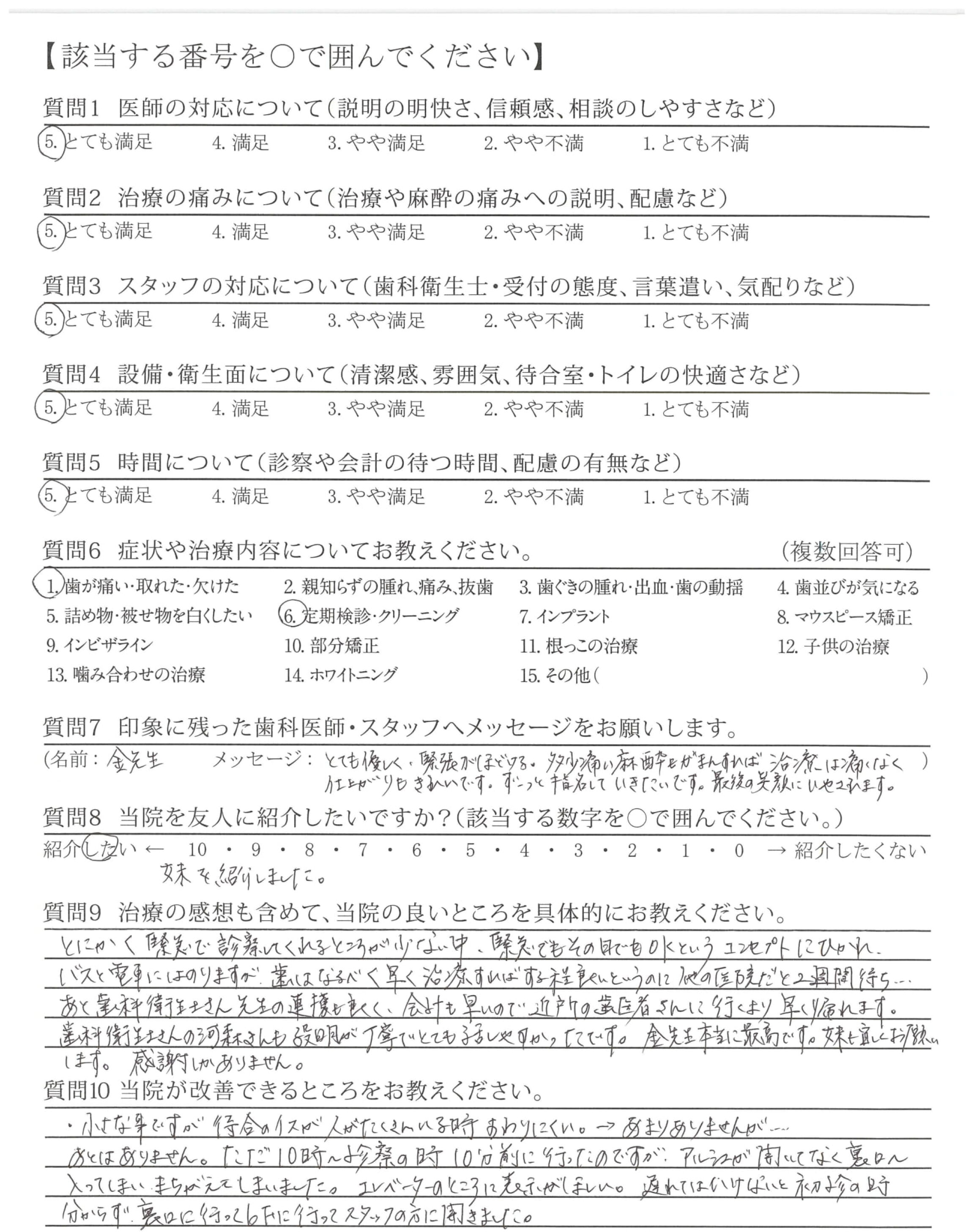 とても優しく、緊張がほどける。多少痛い麻酔をがまんすれば治療は痛くなく仕上がりもきれいです。ずーっと指名していきたいです。最後の笑顔にいやされます。
