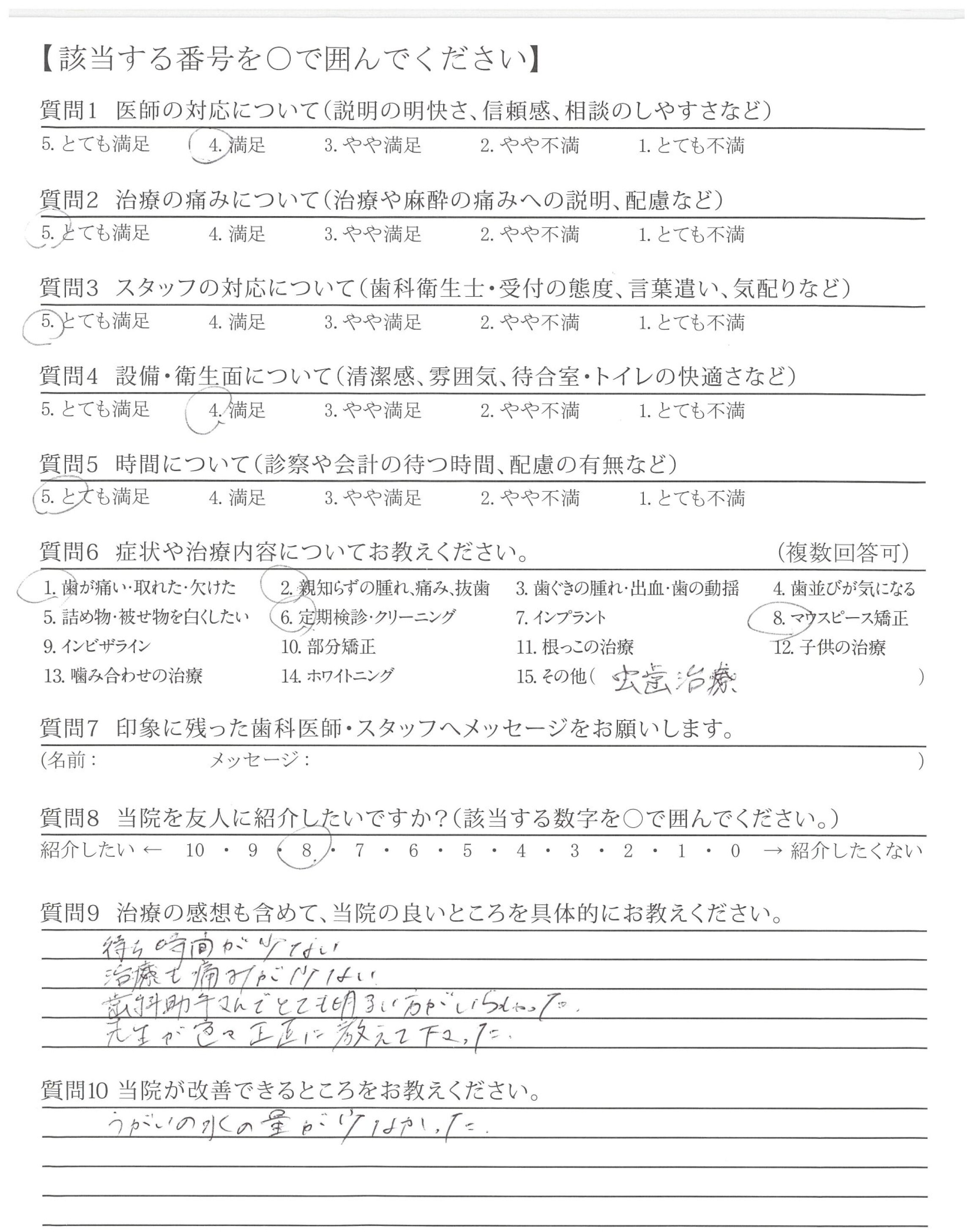 担当の先生も歯科助手さんも受け付けの方も優しく接っしてくださるので、歯医者に行くことが怖くなく、ドキドキすることもなくなりました。本当にありがとうございます