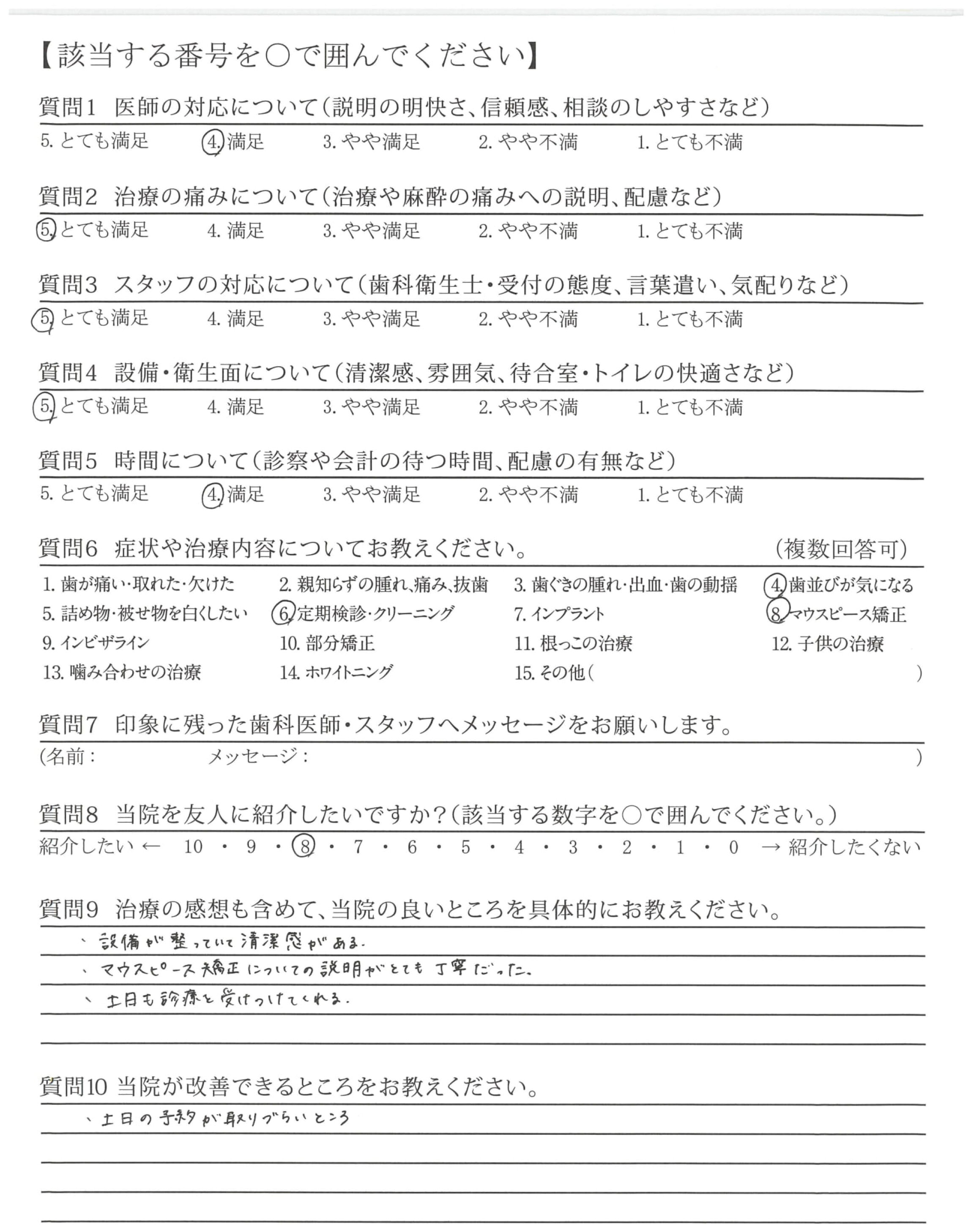 矯正相談でお世話になりましたが、わかりやすく丁寧に説明して頂きよかったです。親知らずも抜かずにできるということで安心しました。