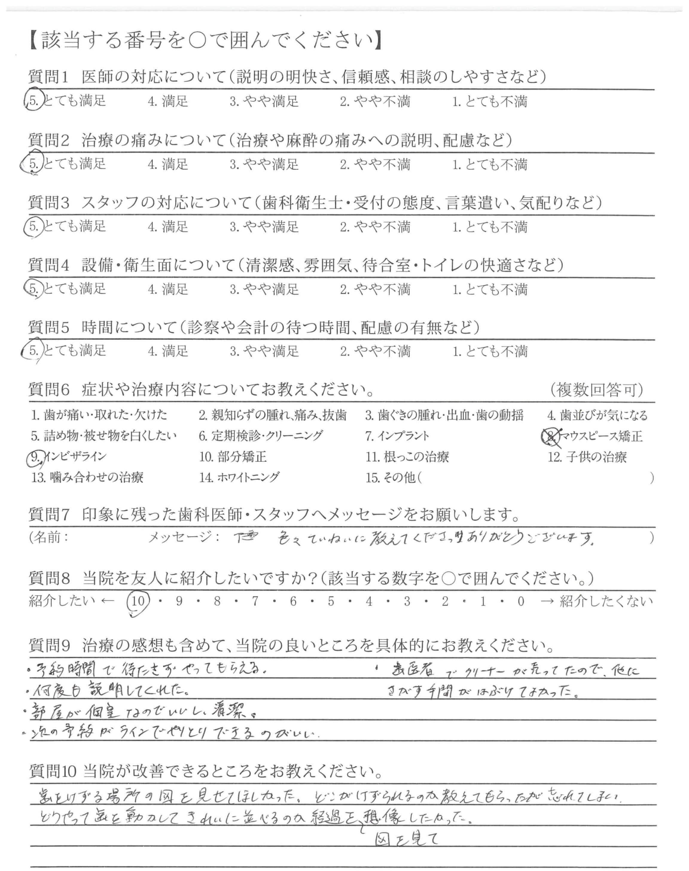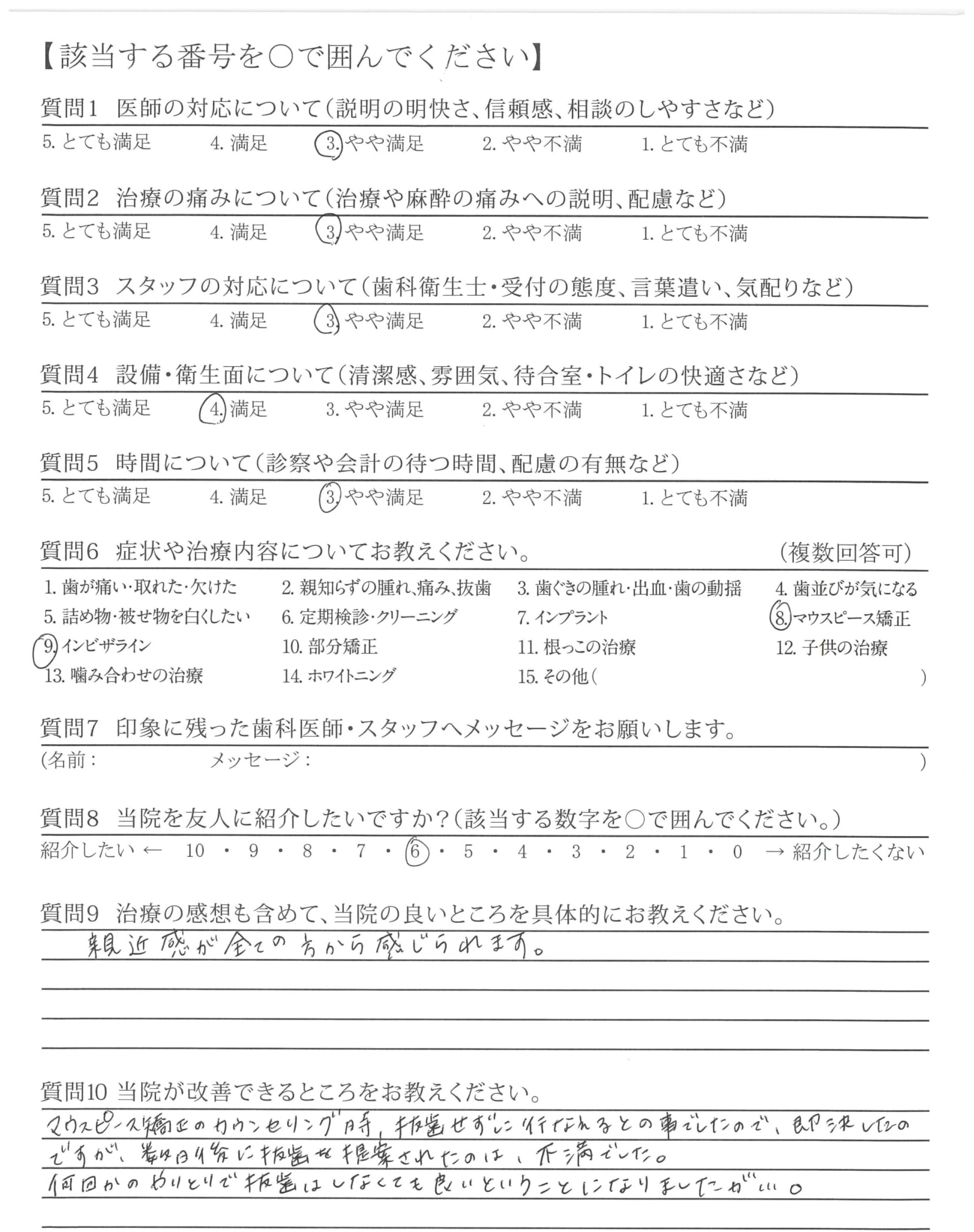 マウスピース矯正に不安があったのですが、丁寧に明るく説明していただいたので不安無く受けることができました。ありがとうございました。
