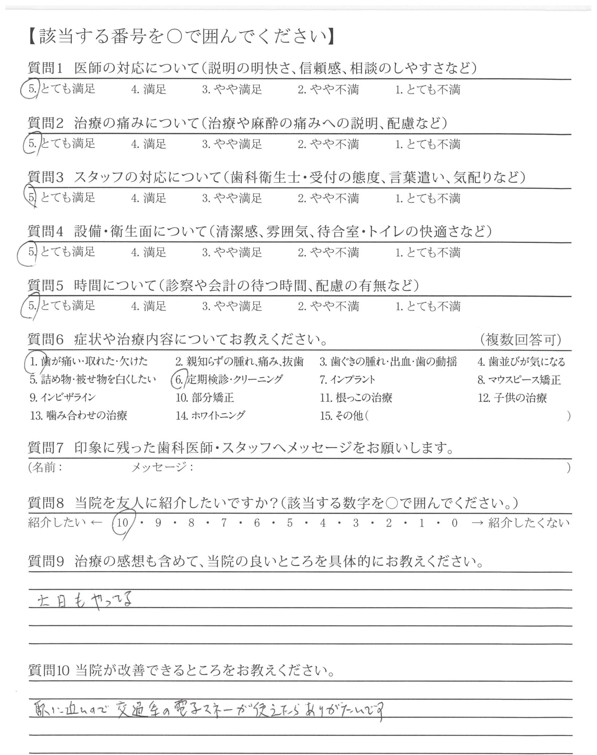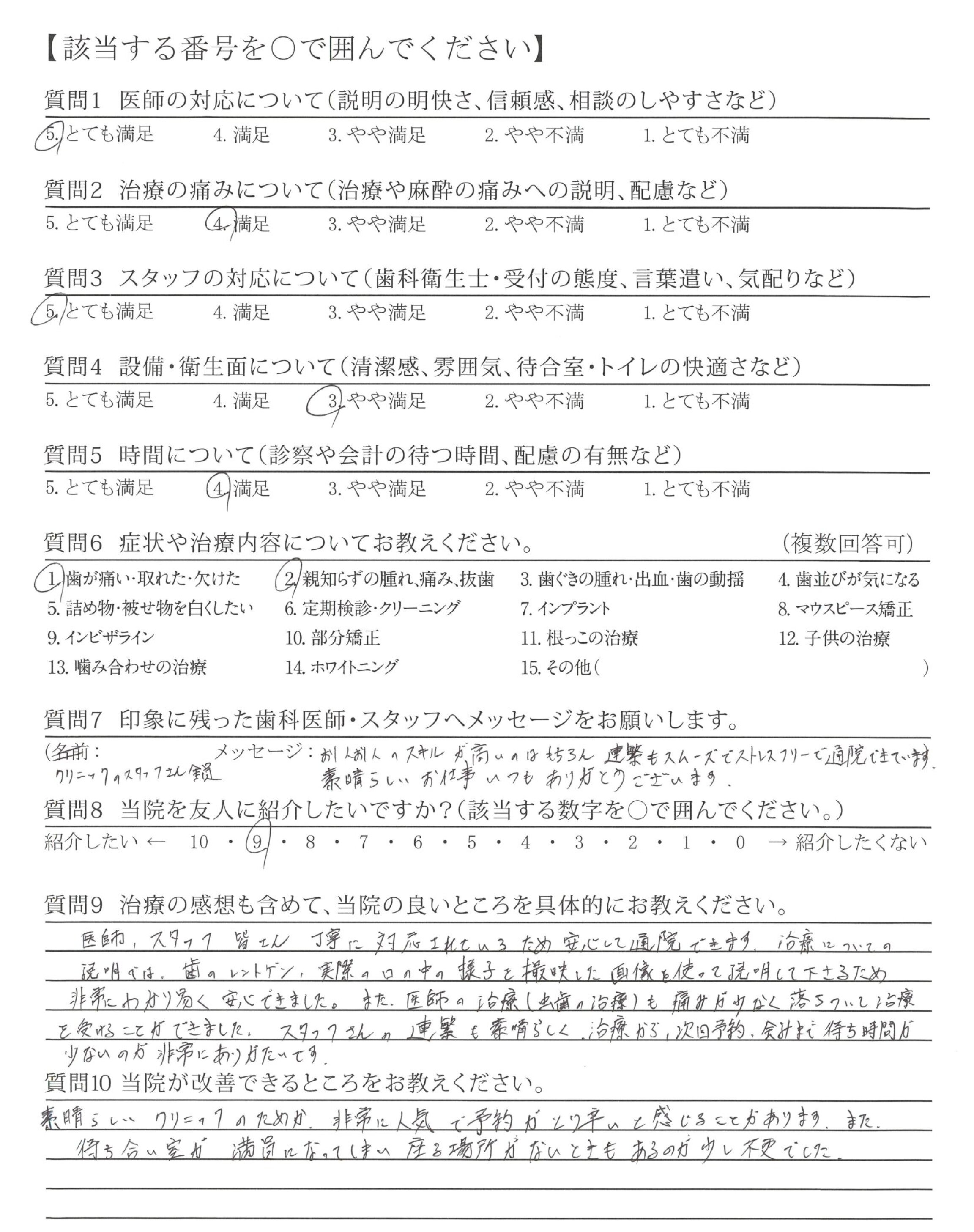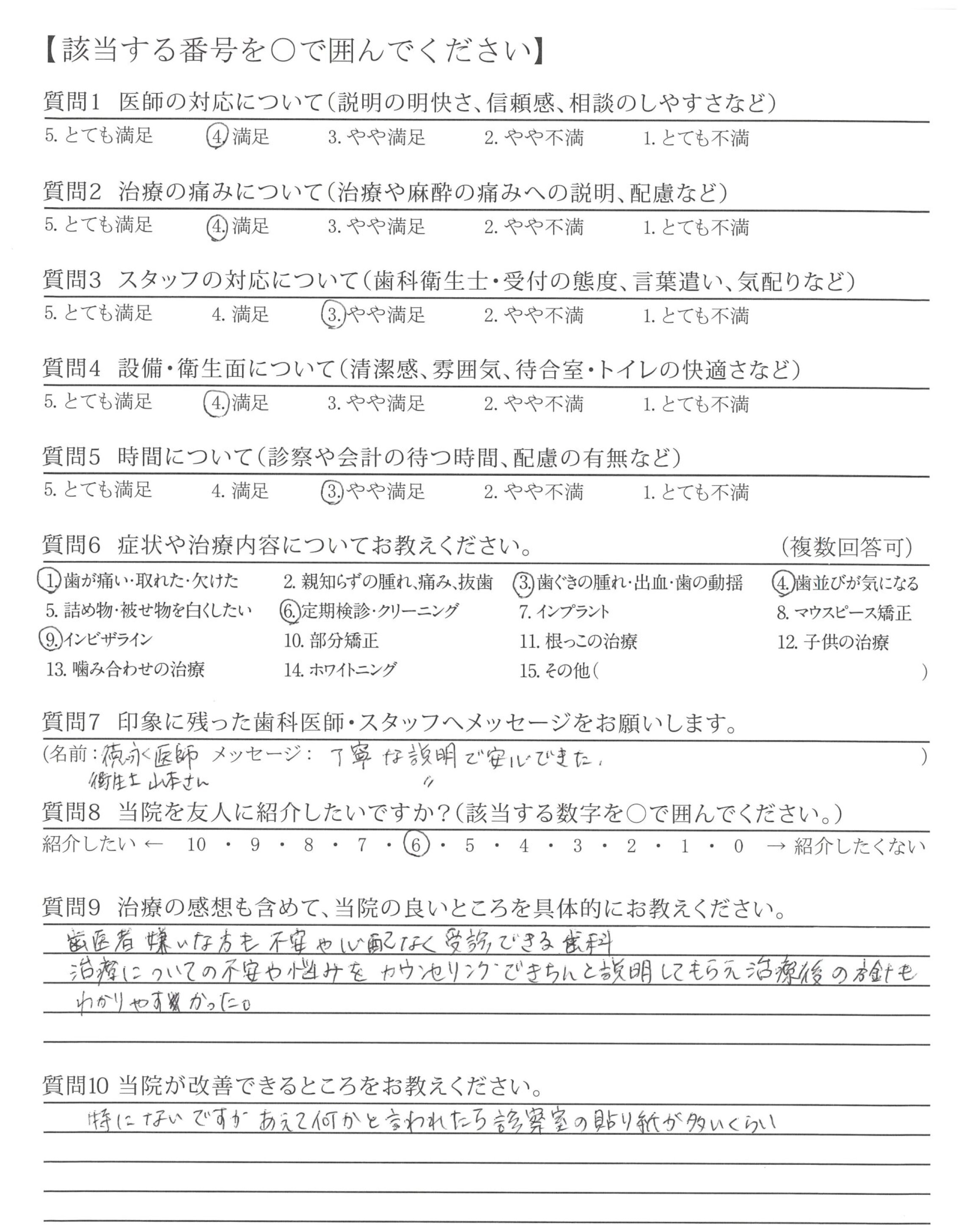 ・前に通っていた医院はDrがきまっていなく前回ちがうDrで治療も時間がかかったり、痛みがあったりしたので歯科にかかるのがこわくなってしまいましたが、Drやスタッフのみなさん優しく丁寧に対応して下さっていて通って良かったなと思います。