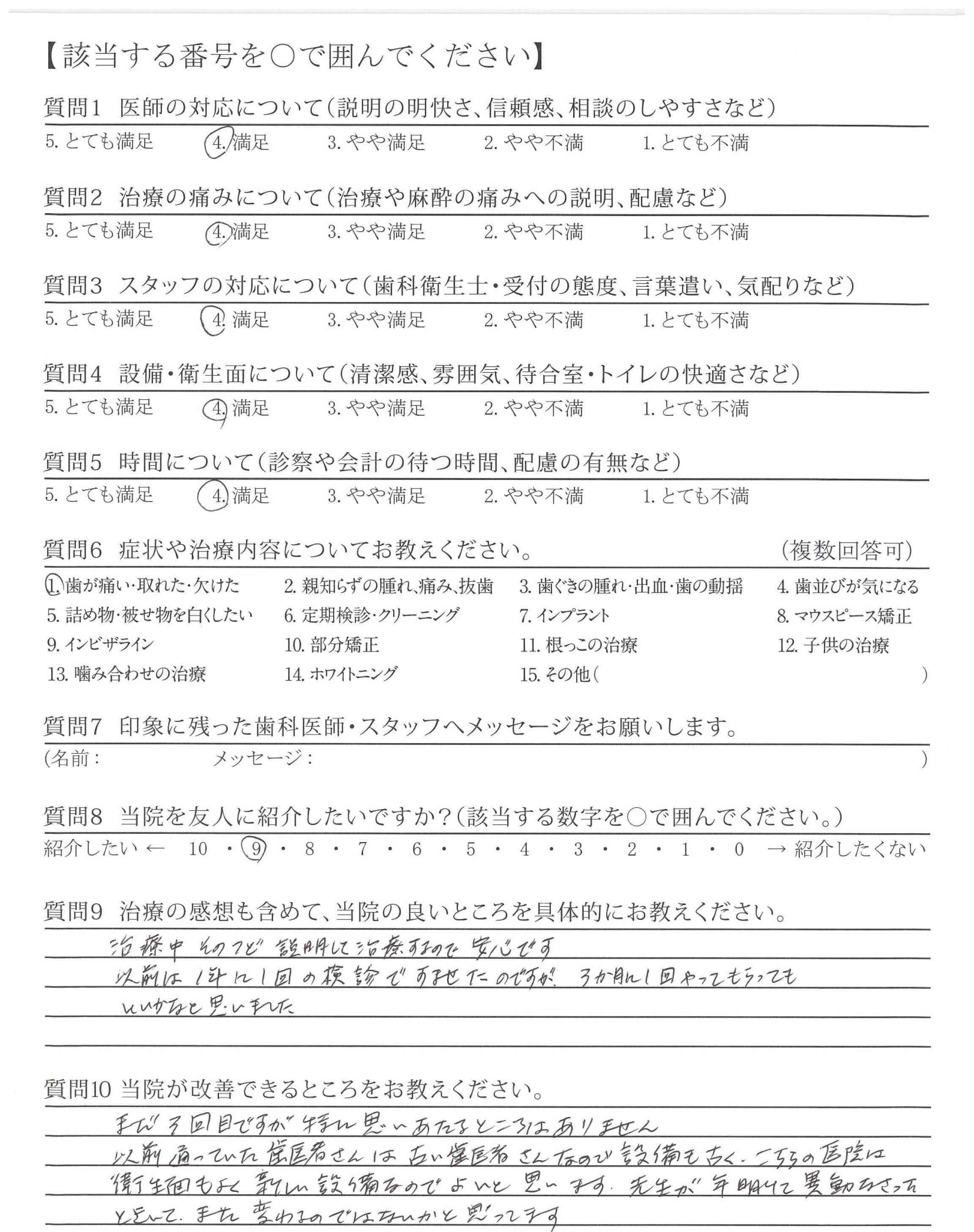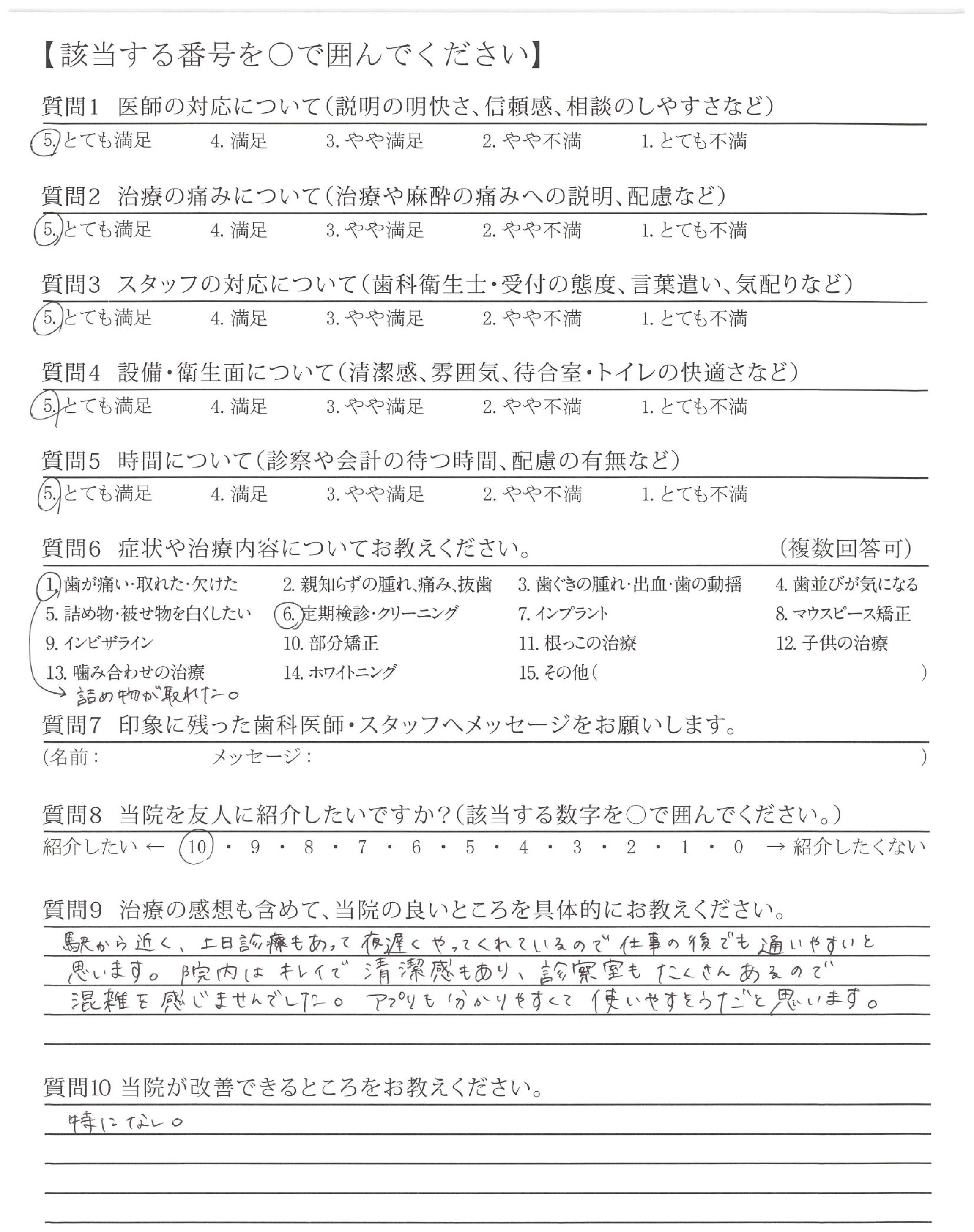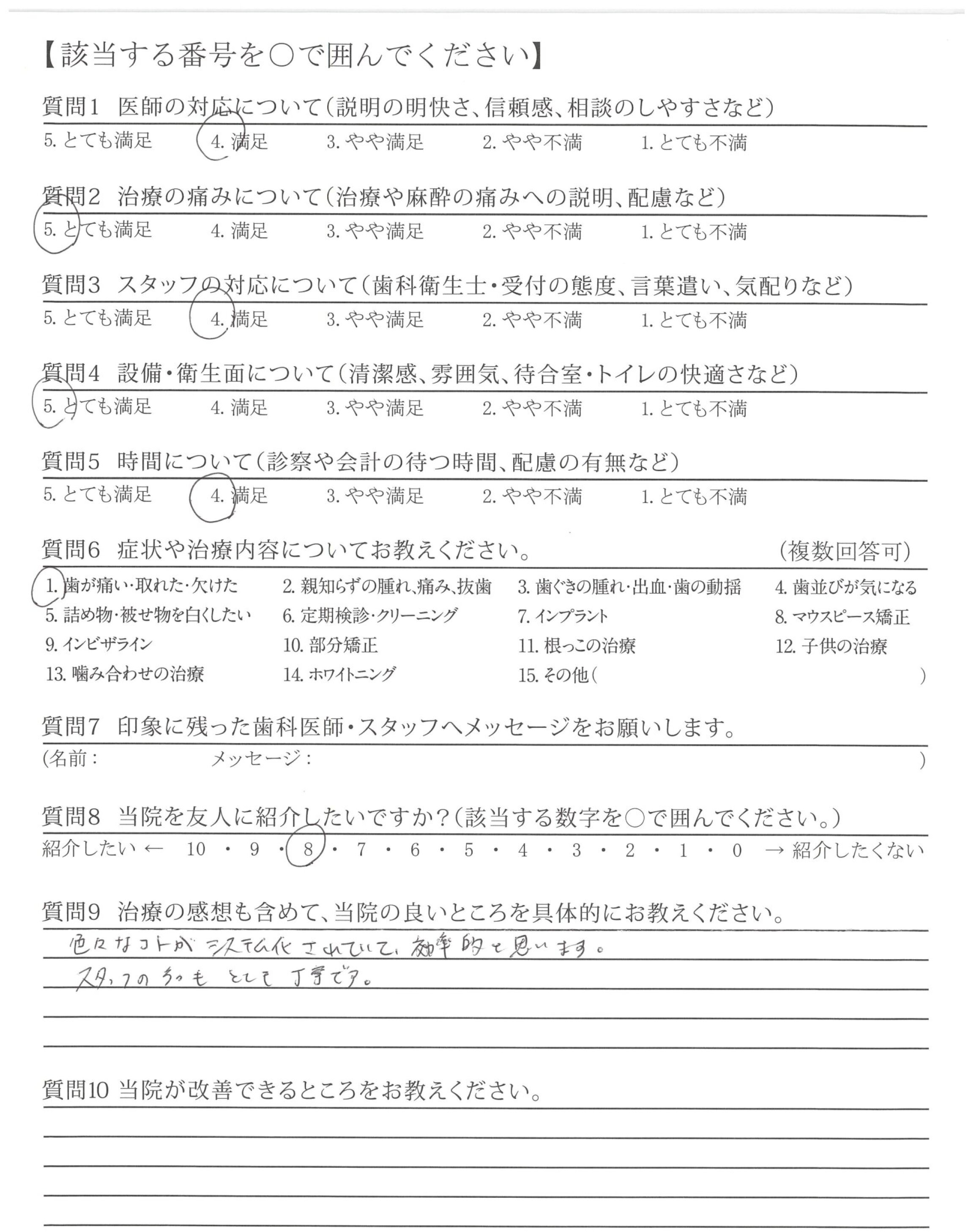 ・前に通っていた医院はDrがきまっていなく前回ちがうDrで治療も時間がかかったり、痛みがあったりしたので歯科にかかるのがこわくなってしまいましたが、Drやスタッフのみなさん優しく丁寧に対応して下さっていて通って良かったなと思います。