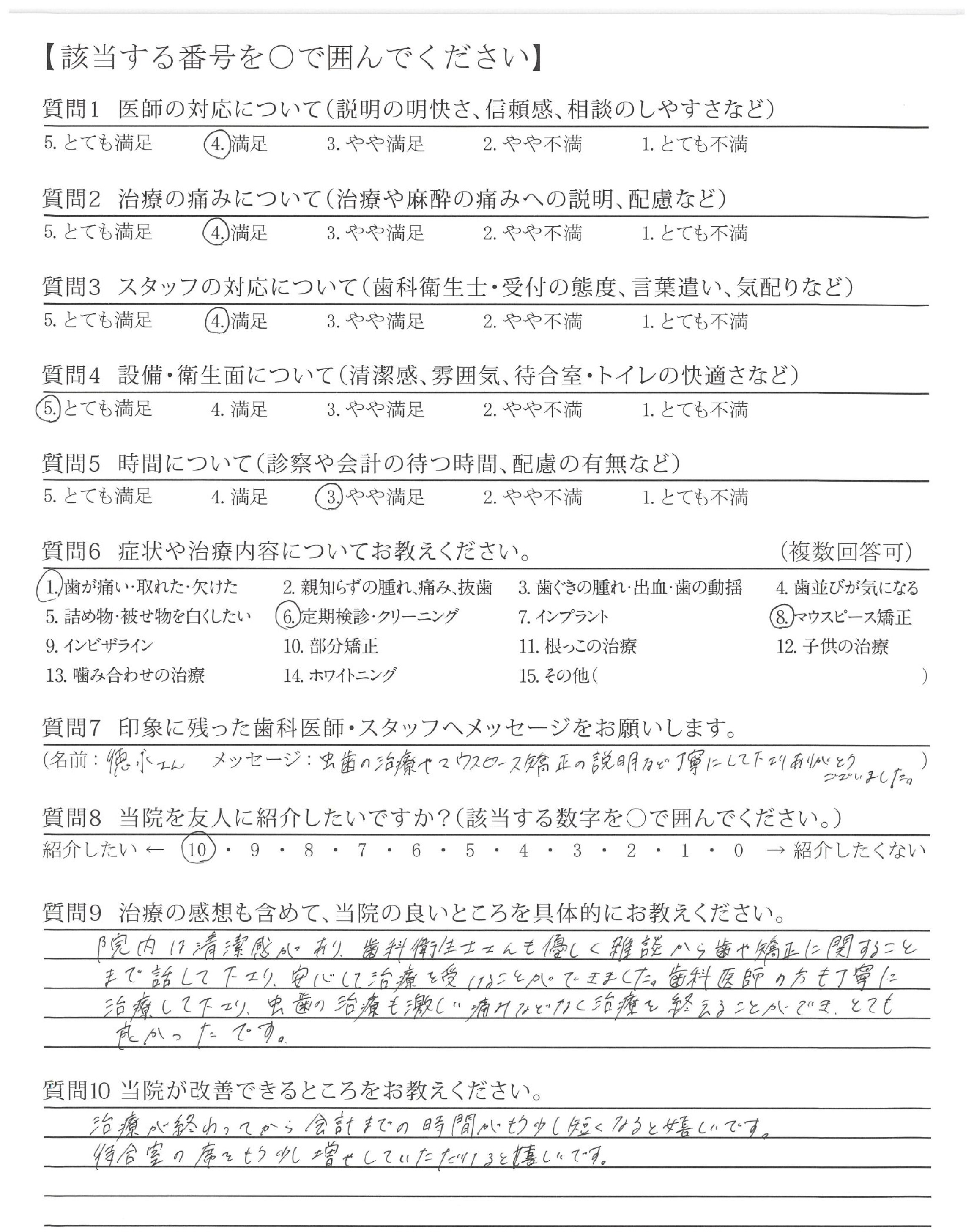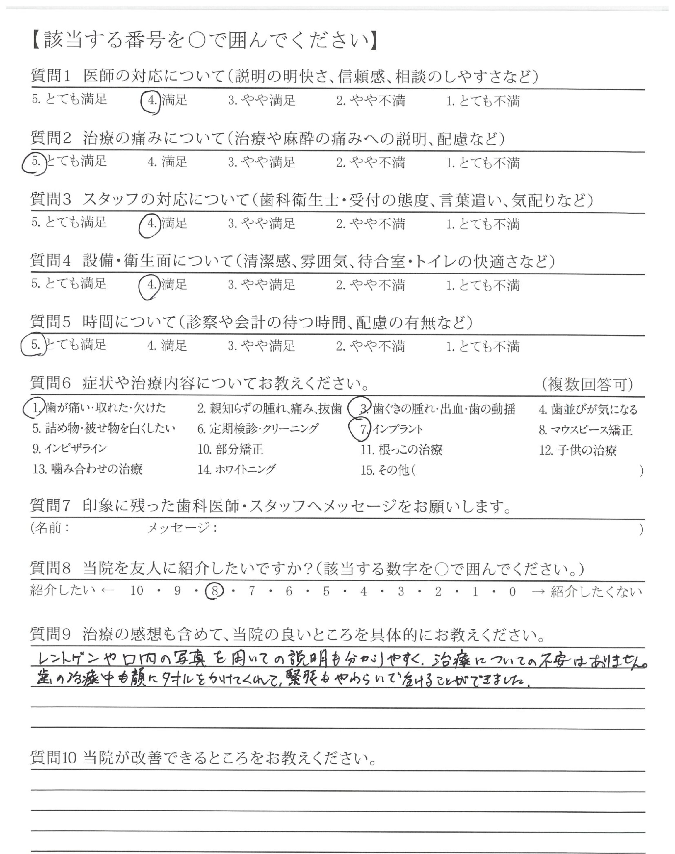 レントゲンや口内の写真を用いての説明も分かりやすく、治療についての不安はありません。歯の治療中も顔にタオルをかけてくれて、緊張もやわらいで受けることができました。