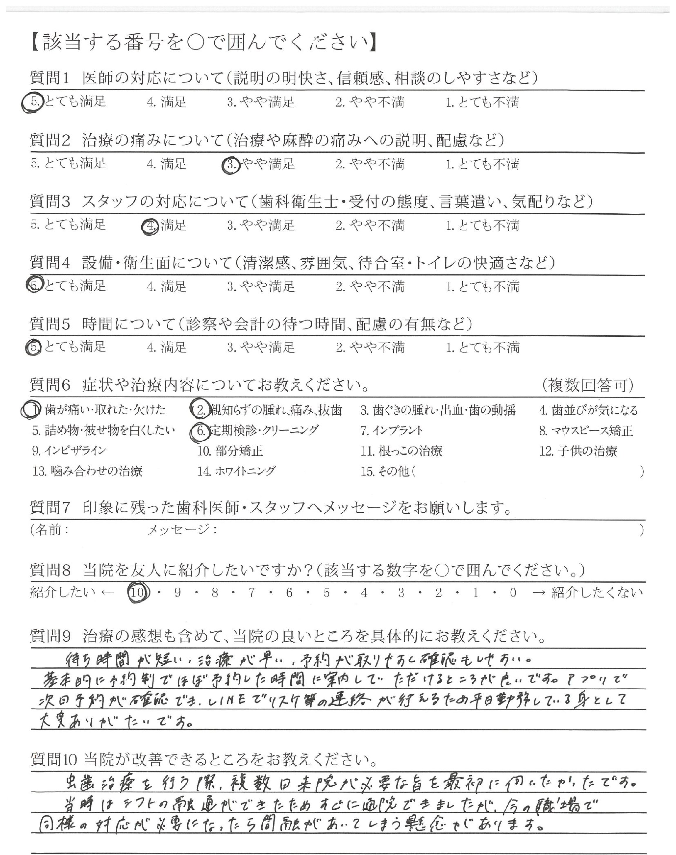 虫歯治療を行う際、複数回来院が必要な旨を最初に伺いたかったです。当時はシフトの融通ができたためすぐに通院できましたが、今の職場で同様の対応が必要になったら間隔があいてしまう懸念があります。