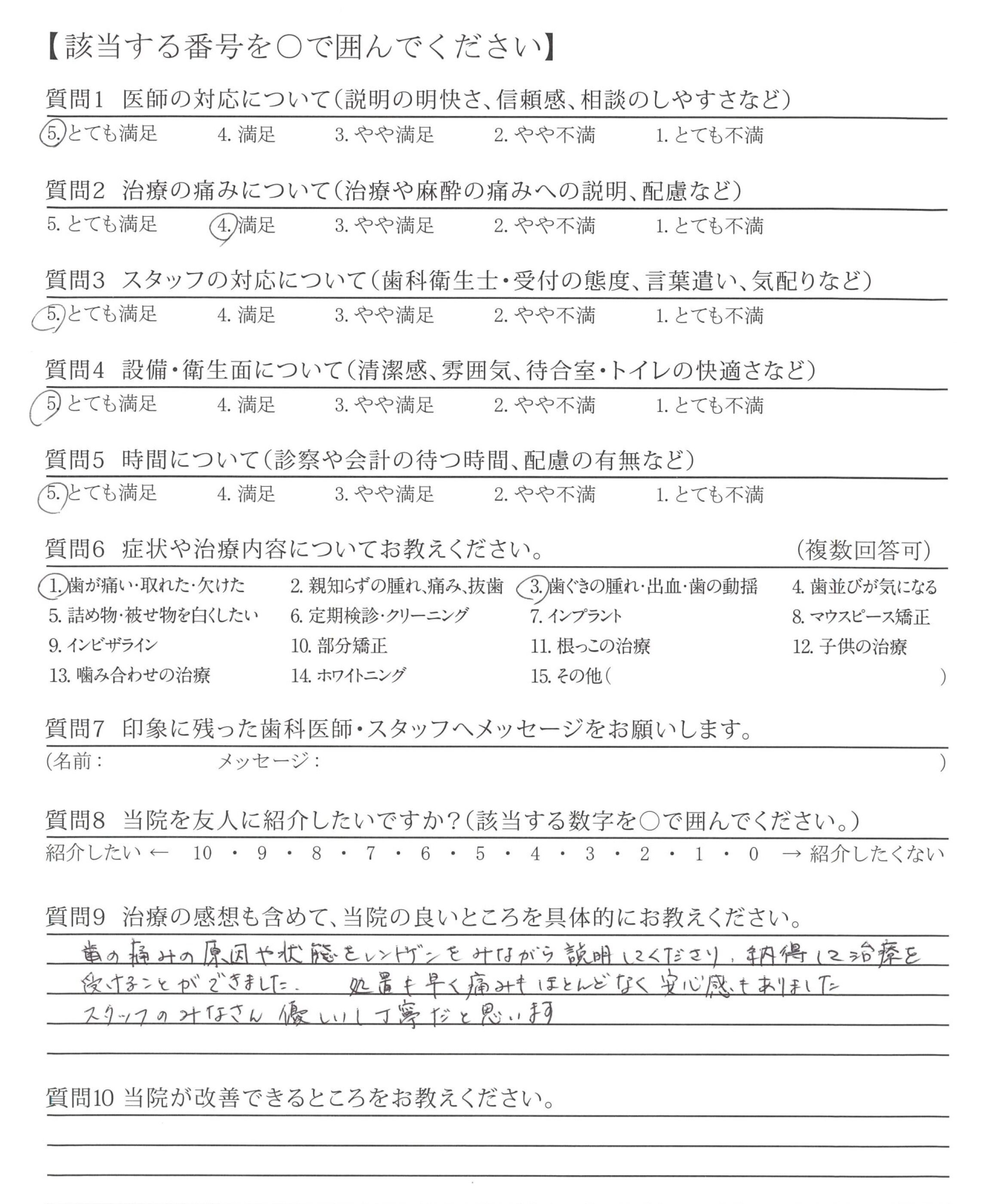 毎回、痛みをしっかりコントロールして治療してくれます。感謝しております。