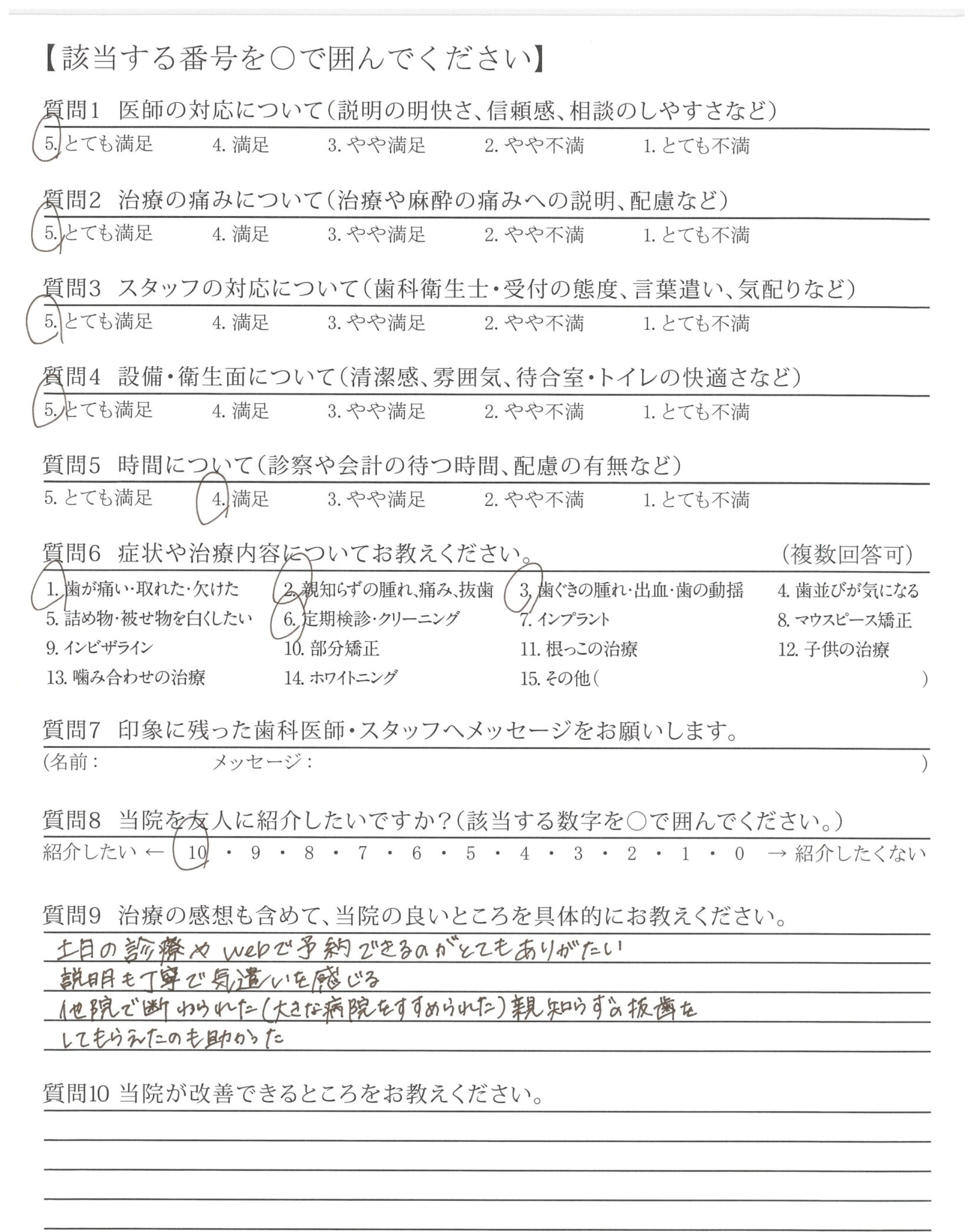 歯が突然痛くなり、いつも行っている歯医者さんに連絡をしたところ予約がいっぱいで断わられてしまいました。そんな時にネットで検索して当日予約ができ、すぐ診てもらうことができ本当に助かりました。