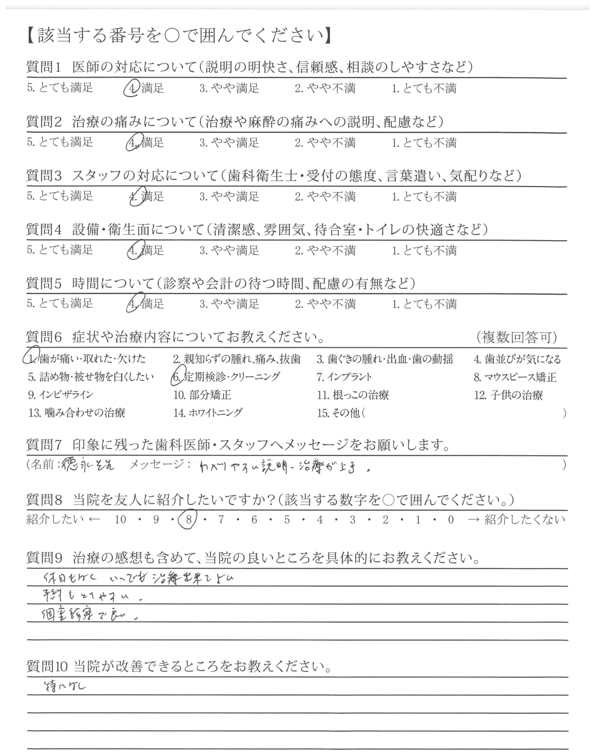 患者にわかりやすく治療の方法や優先度をお話ししてくださり、進め方も患者の意向を尊重してくださるため、非常に信頼できます。麻酔も痛みが少なく、治療後の歯もとても快適な状態に仕上げてくれます。心遣いも技量も素晴らしいです。