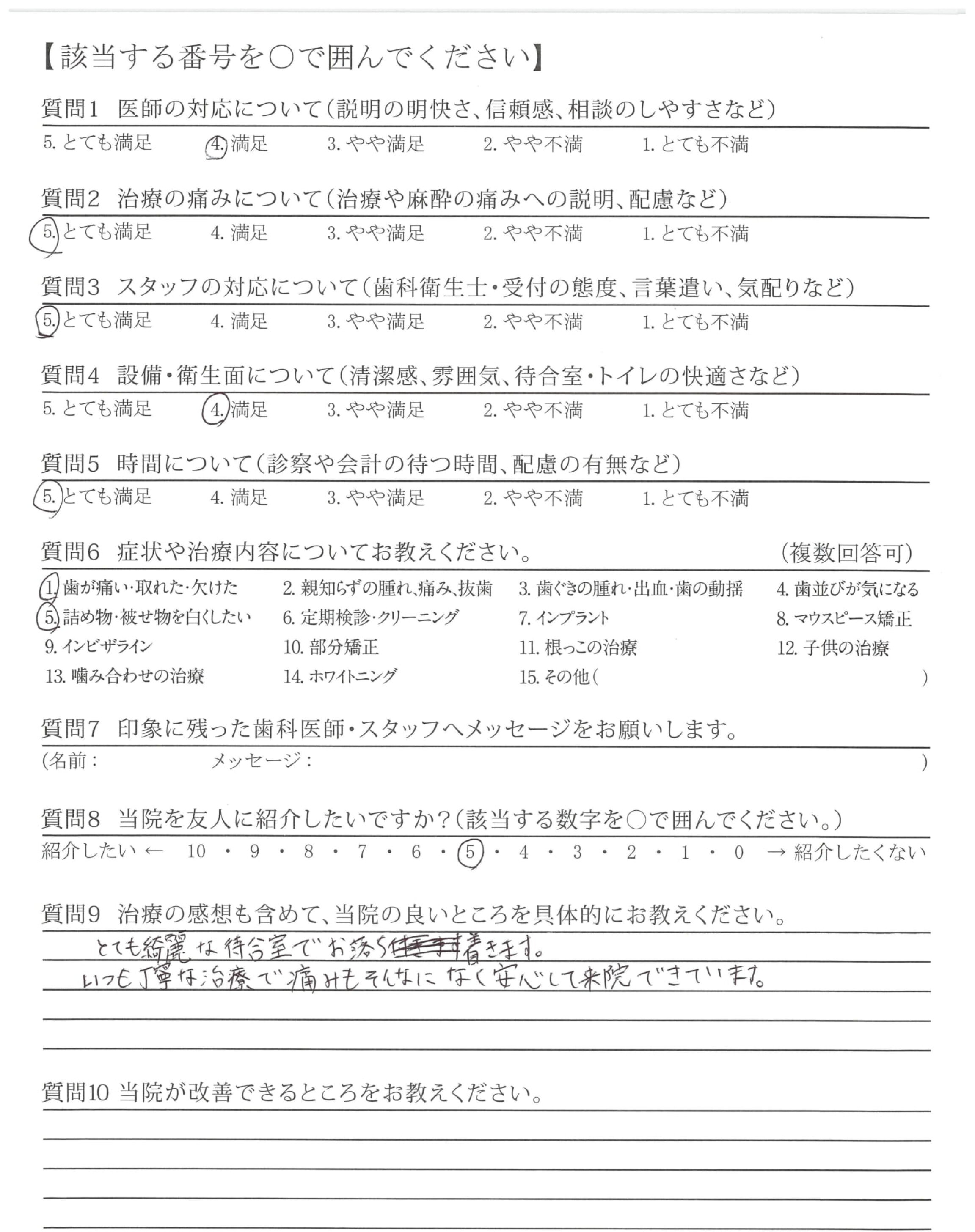 ・最初は、予約なしで当日見て頂けたが、今は早くて、3日後、(先生指名時)の為、少し、遅いと感じるが、安心出来る先生の為、しょうがないと思っています。