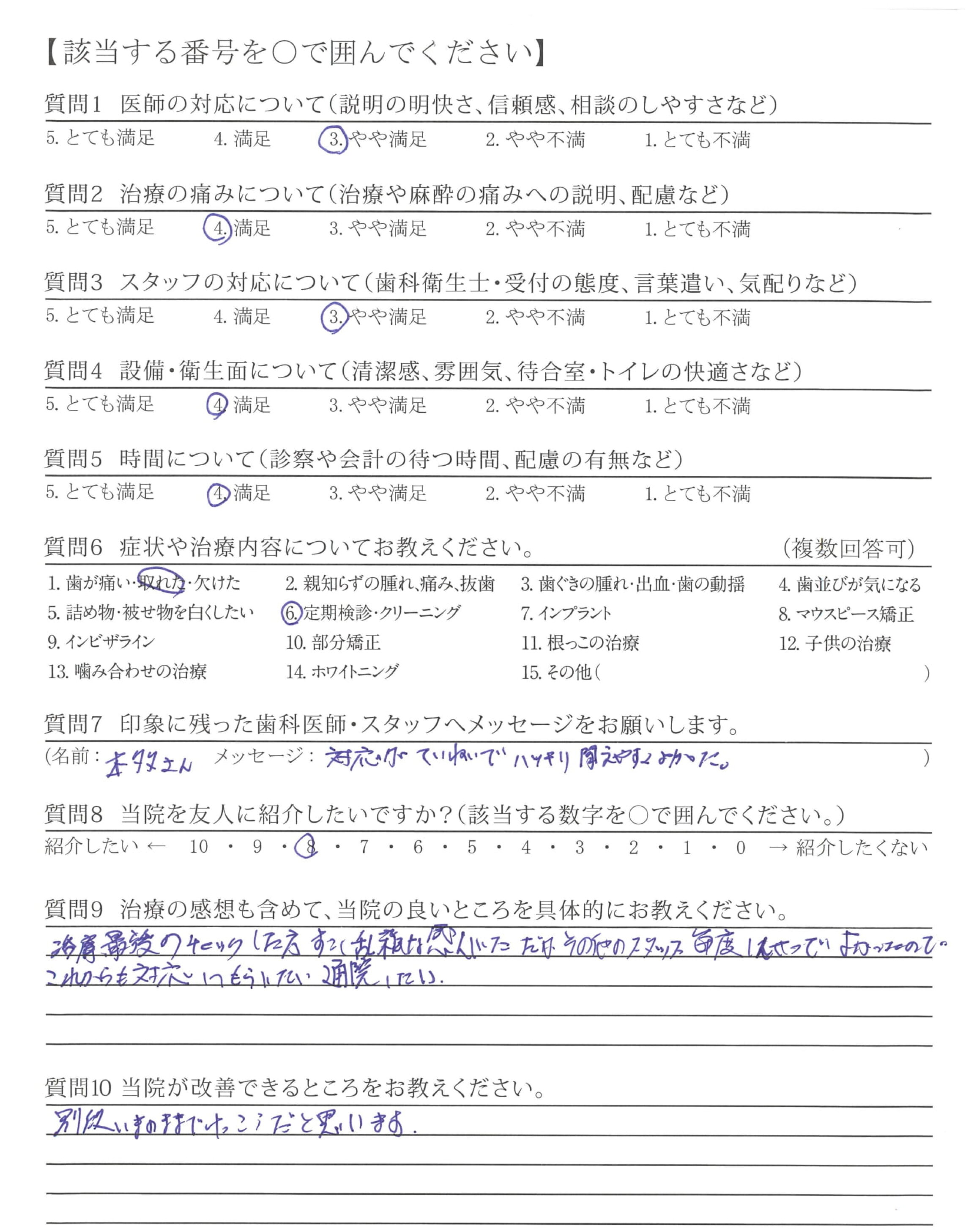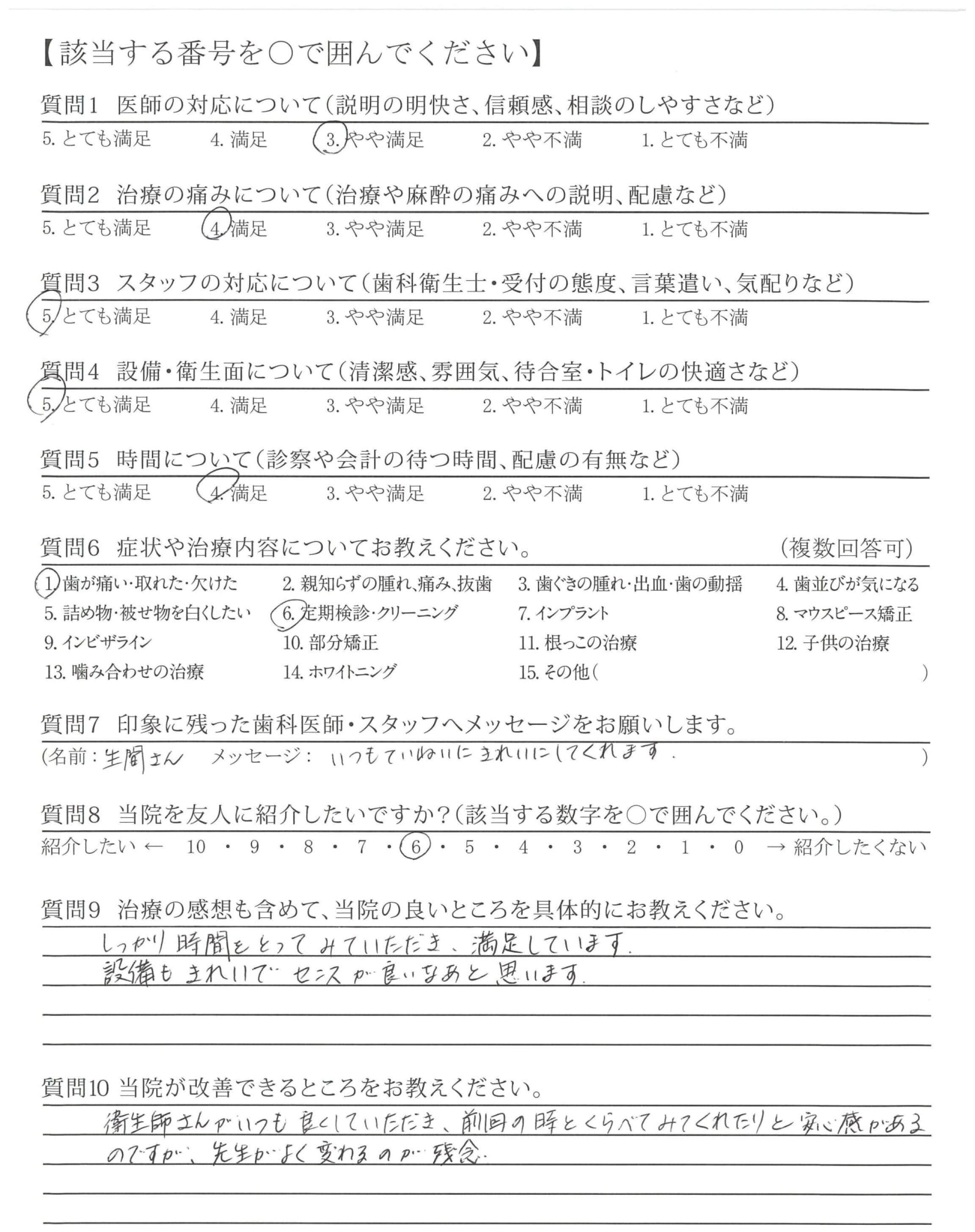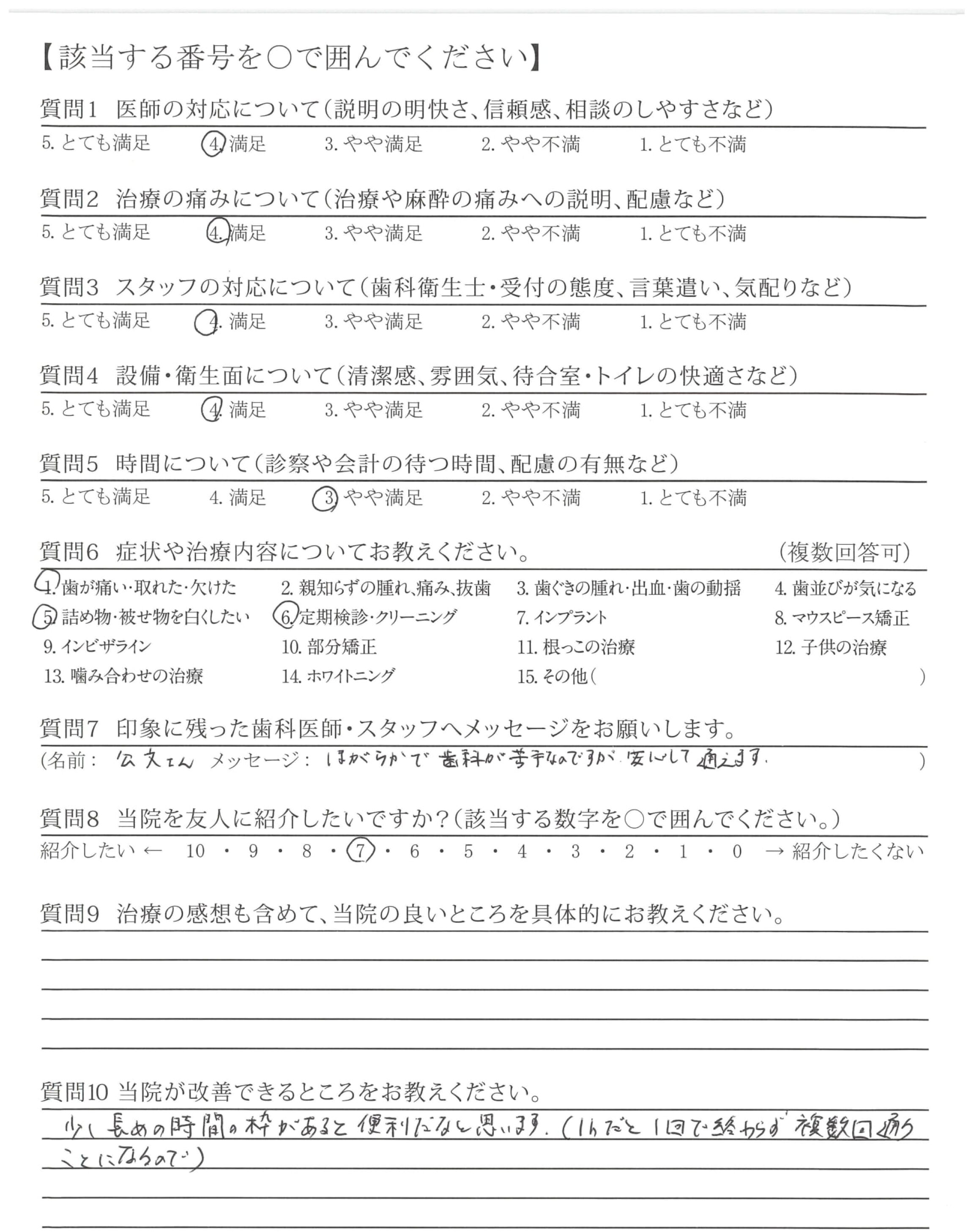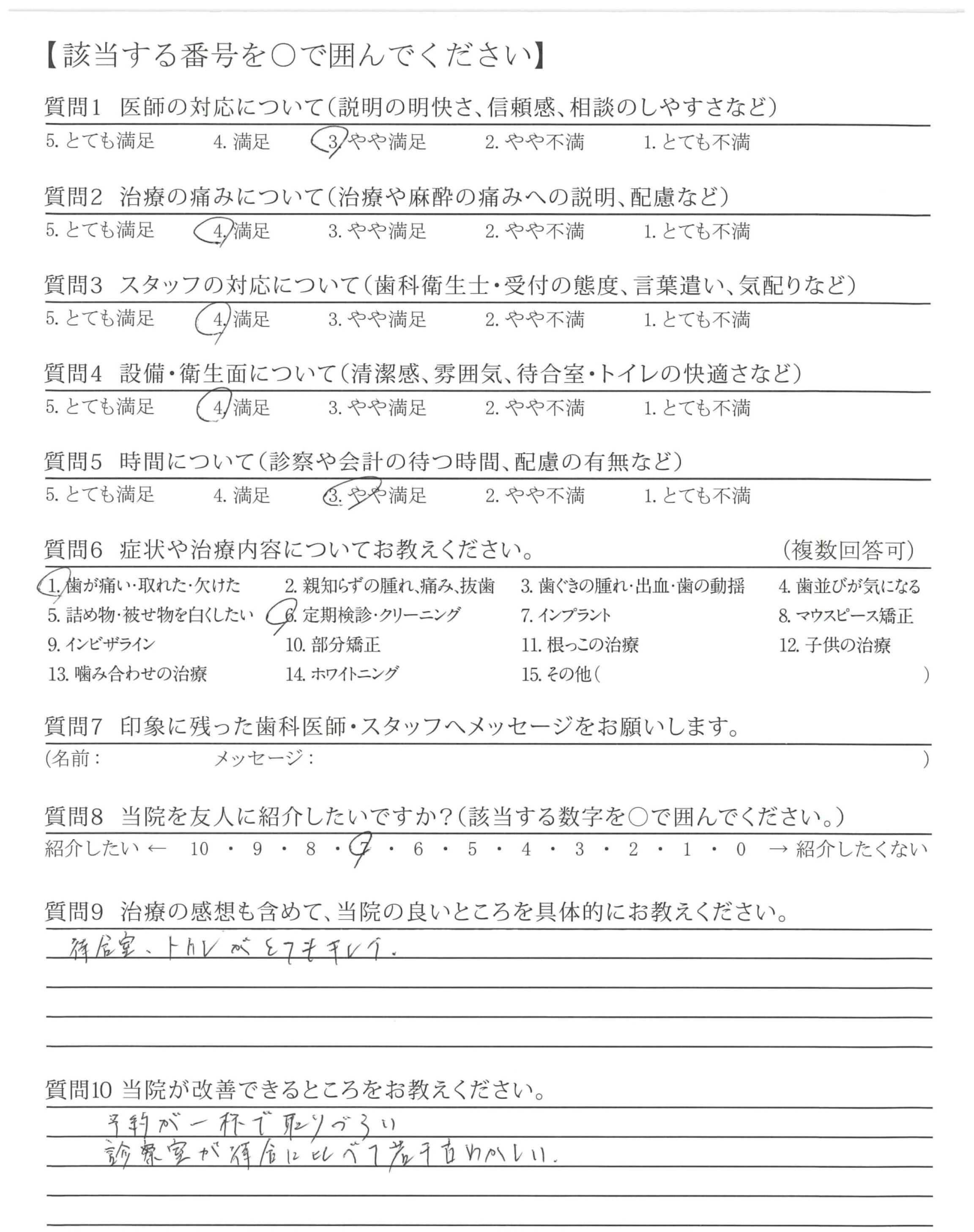 他の先生に見ていただいた時に虫歯のダメ出しをされたことが少しいやだった。