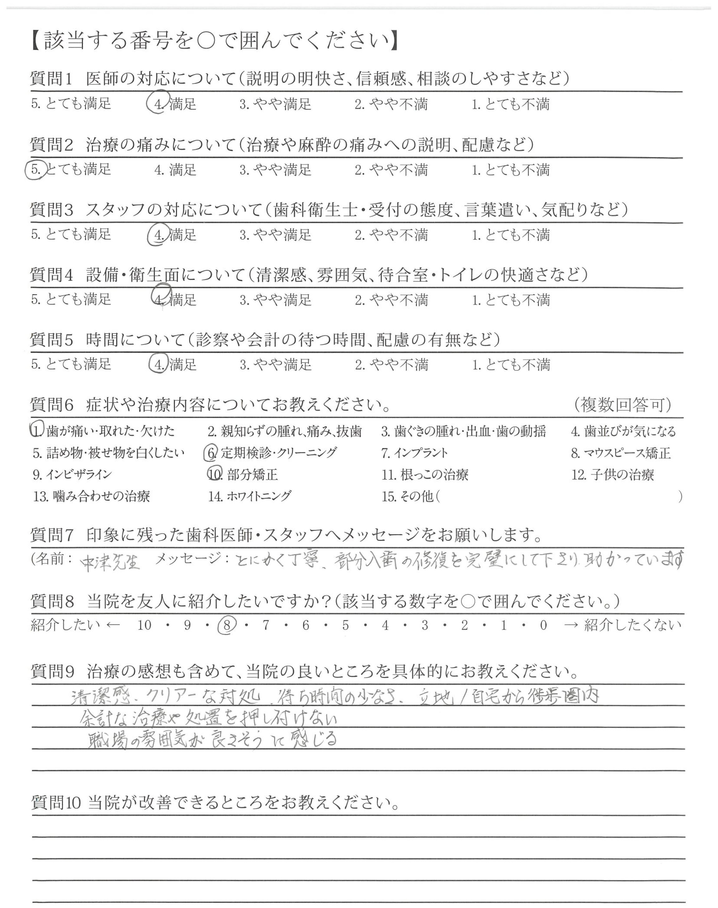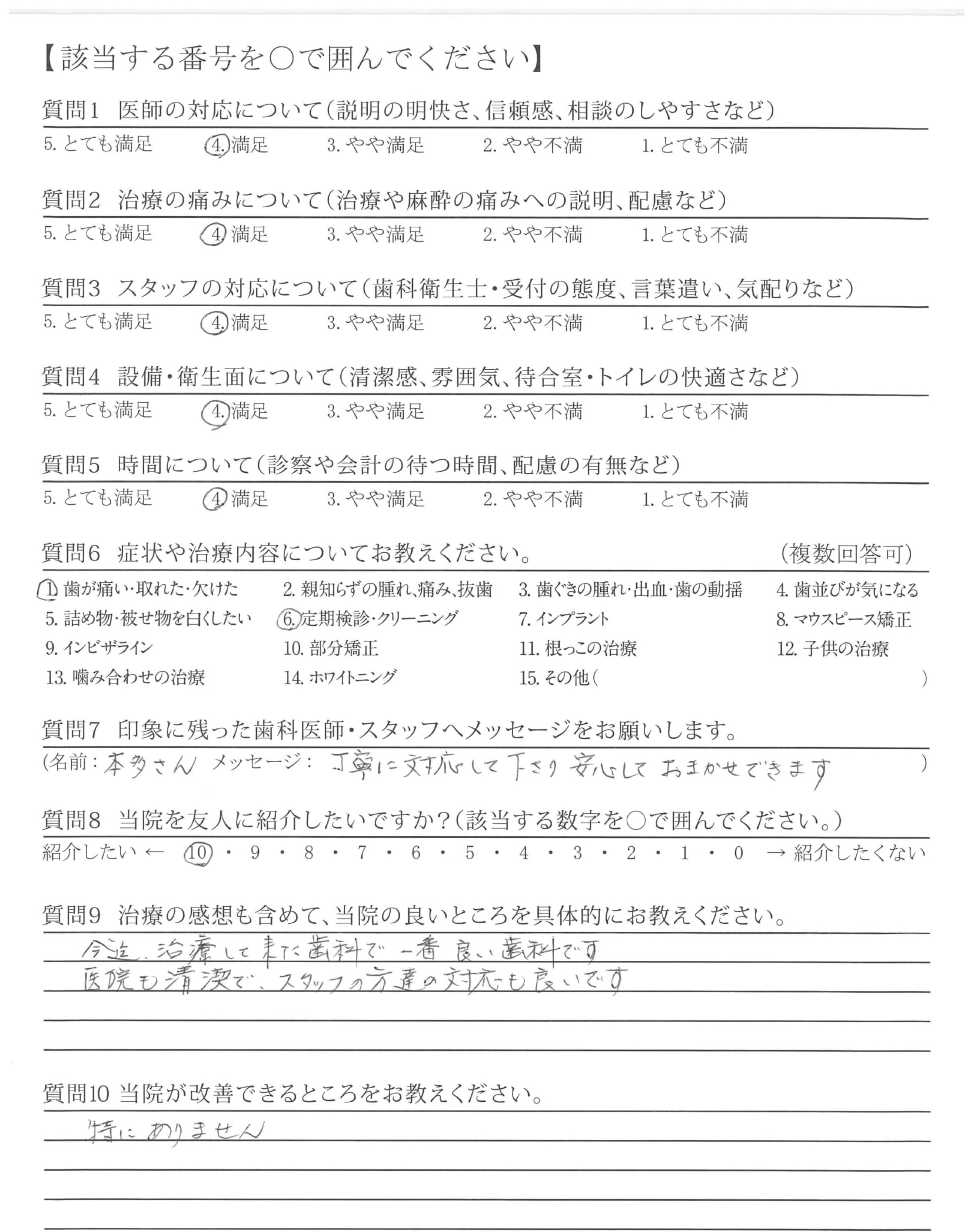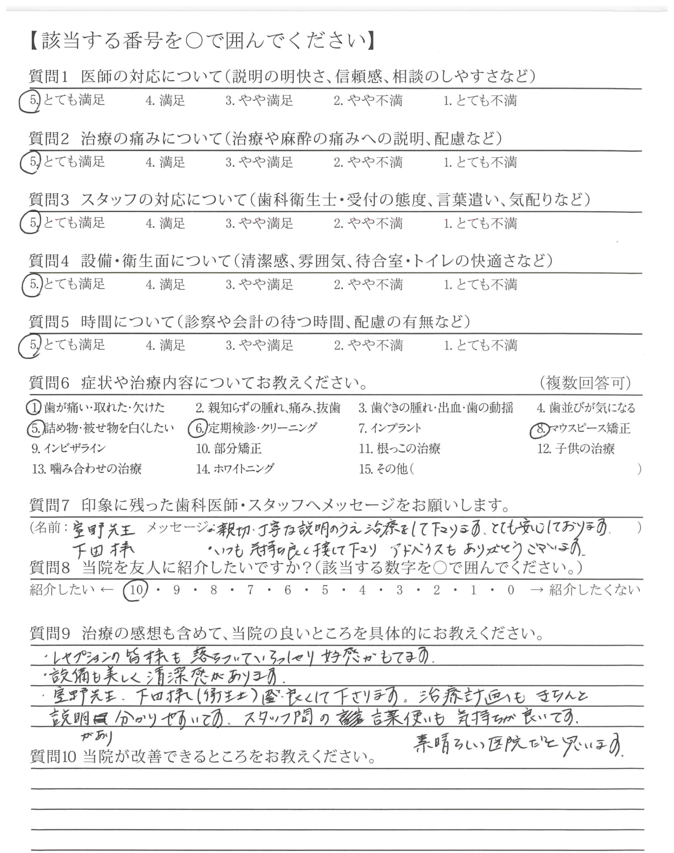 どんな時もこちらが困っている事に最善を尽くして下さいました。それに、ぴったり歯がつきいつも安心出来ます。大感謝