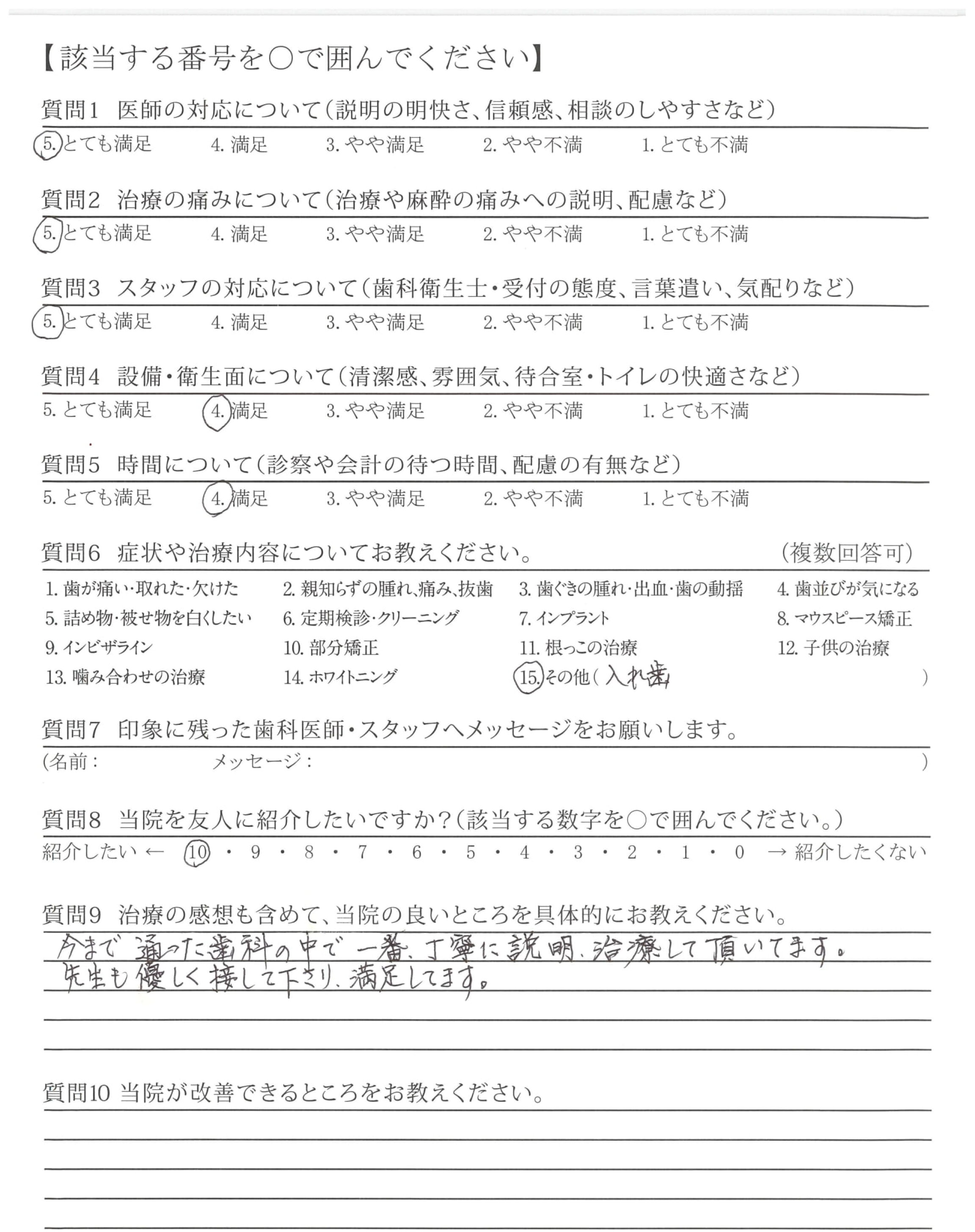 2年半前に主人が亡くなり、外へ出るもの怖く、ストレスと栄養不足とで歯を抜くことになり…でも、毎回''元気ですか!!''って毎回声をかけて下さり、スタッフの方々もお気遣いいただき、行く時は嫌で行くのですが・・・帰りには「来てよかった。」と思うほど良くして下さり、今、お陰様で元気になれたのは、こちらの先生、スタッフの方々のおかげだと思っています。