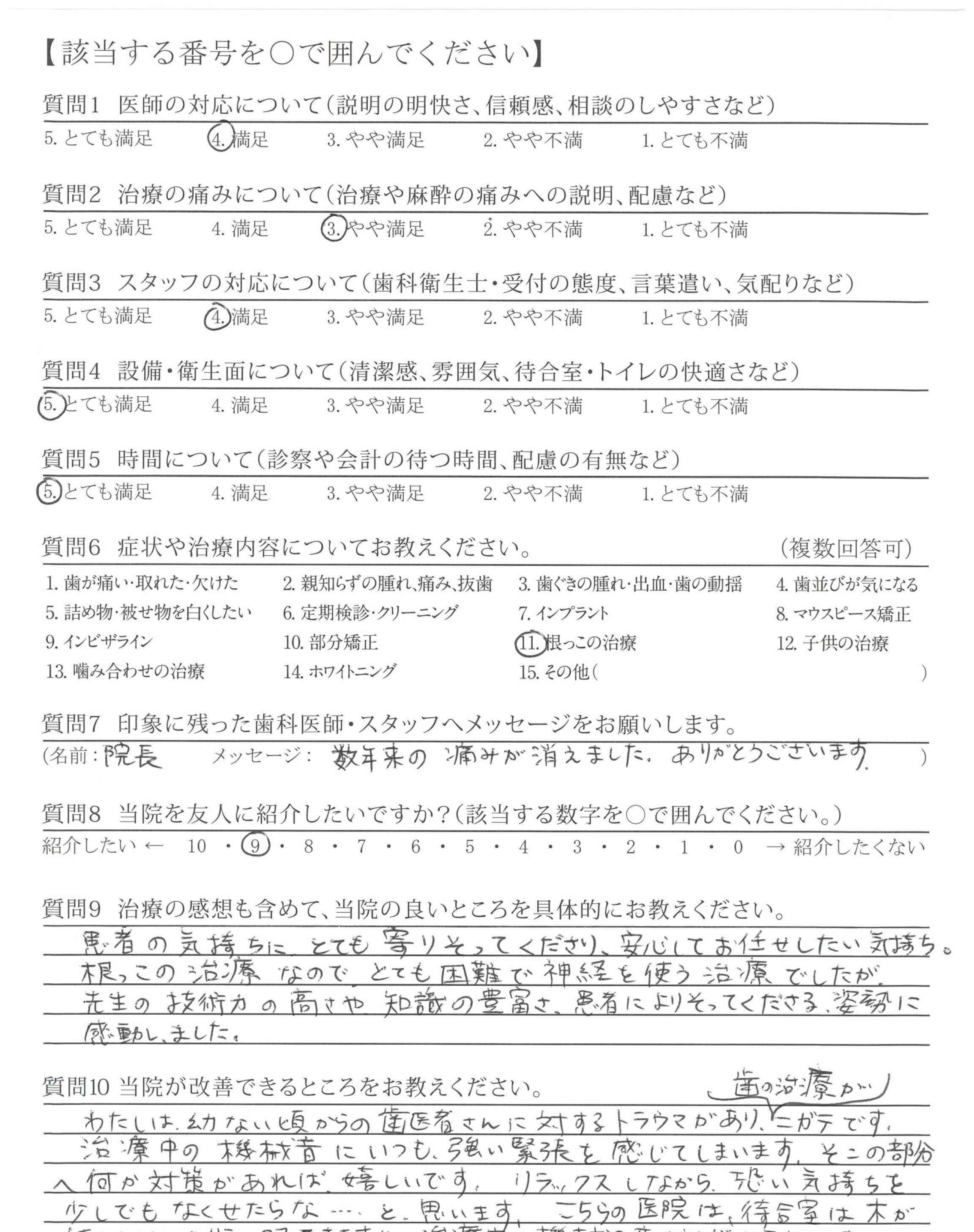 根の治りょうは他の歯科で何回かやってうまくいかなかったところを治りょうしていただき感謝しています。