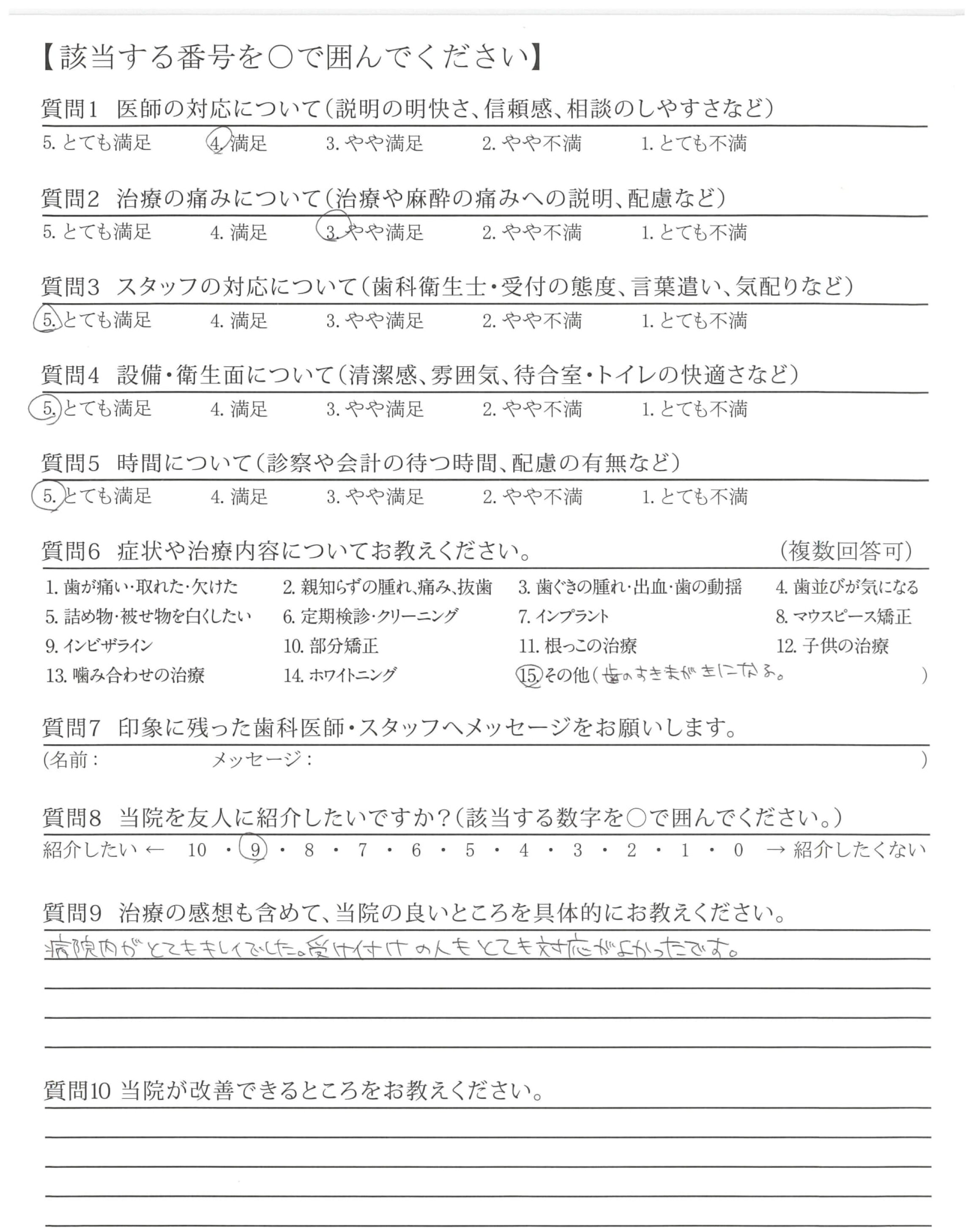 あいさつも治療の説明も不安感なく接してくれたので安心して治療してもらい、大変満足しています。