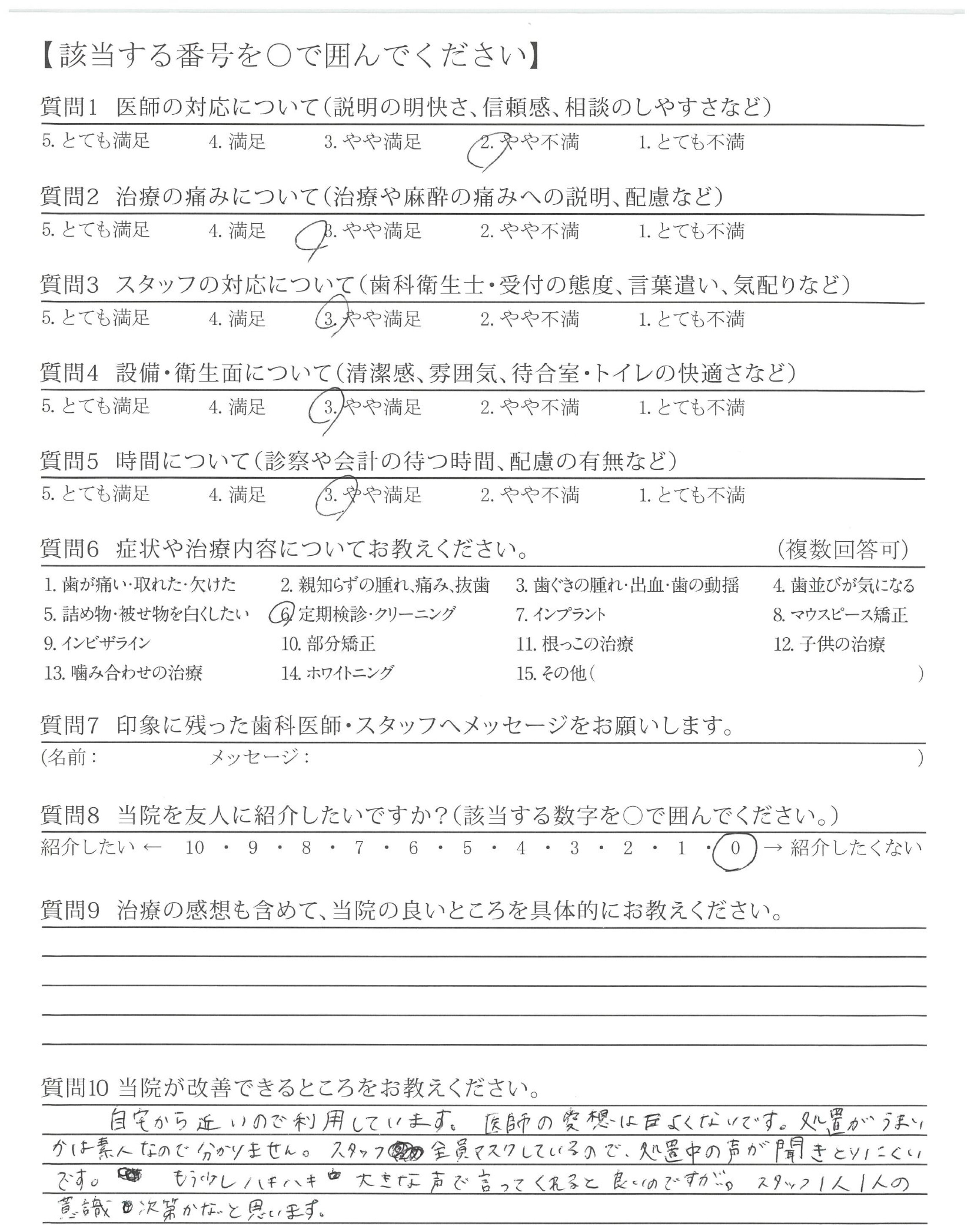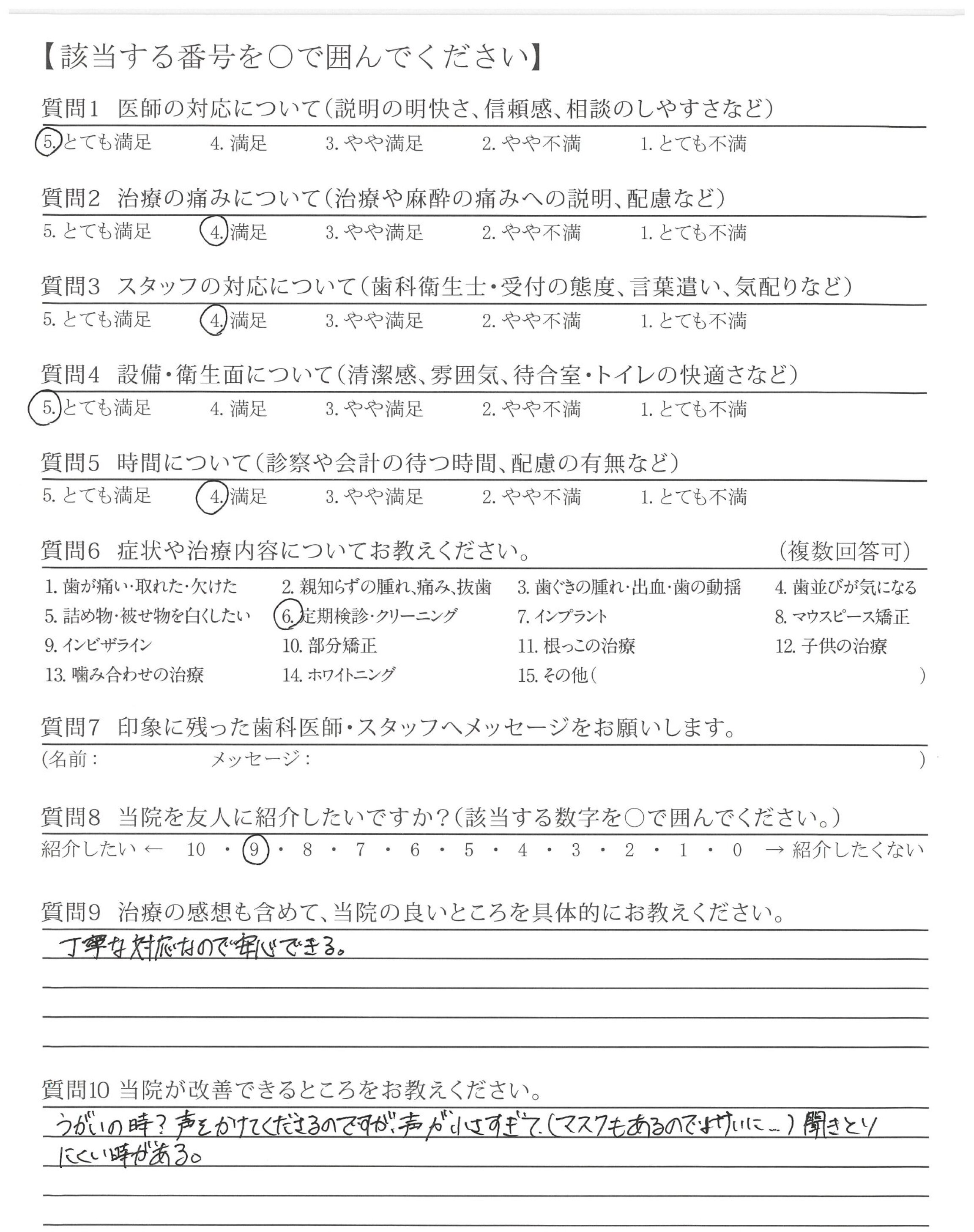 スタッフ全員マスクしているので、処置中の声が聞きとりにくいです。もう少しハキハキ大きな声で言ってくれると良いのですが。スタッフ1人1人の意識次第かなと思います。