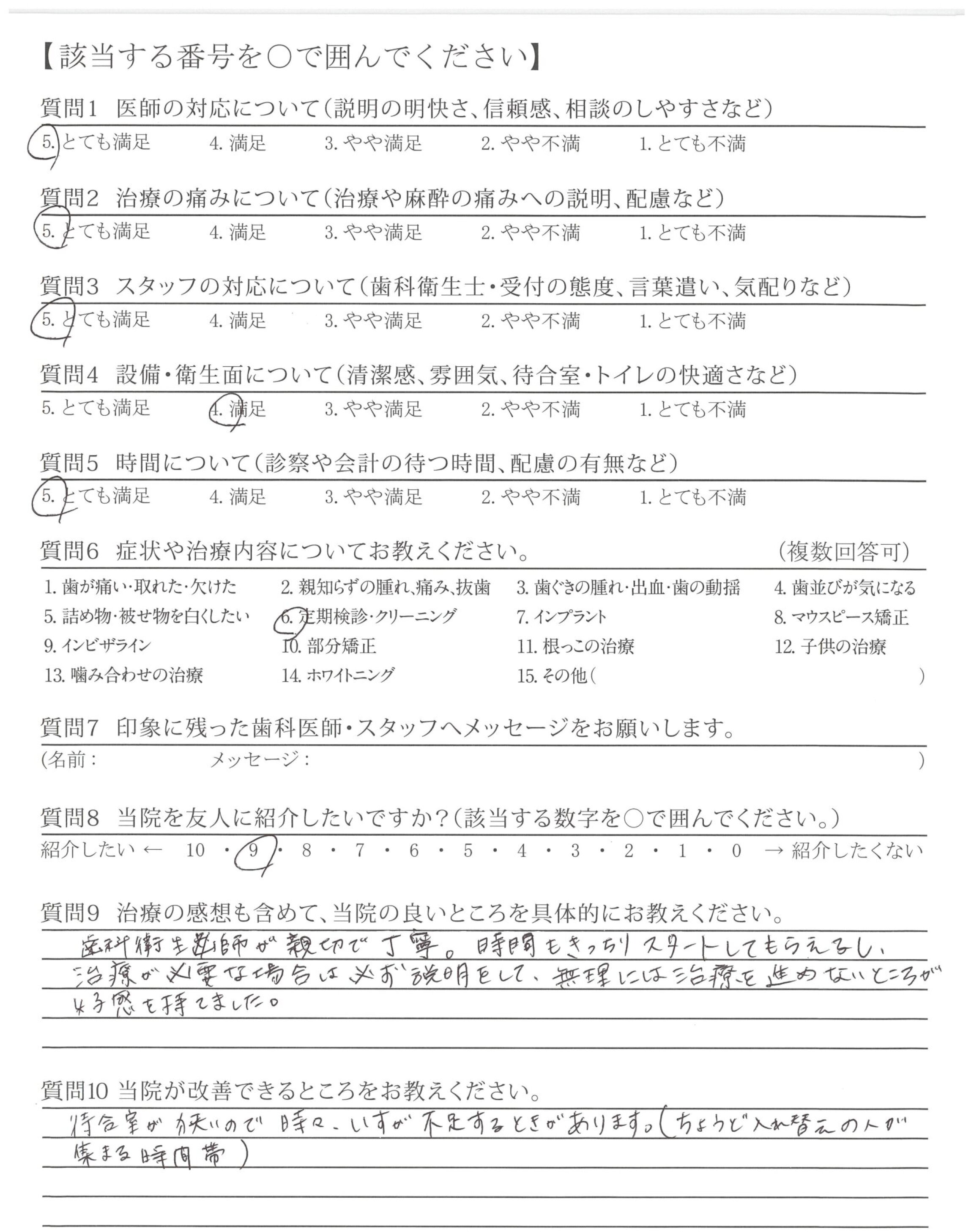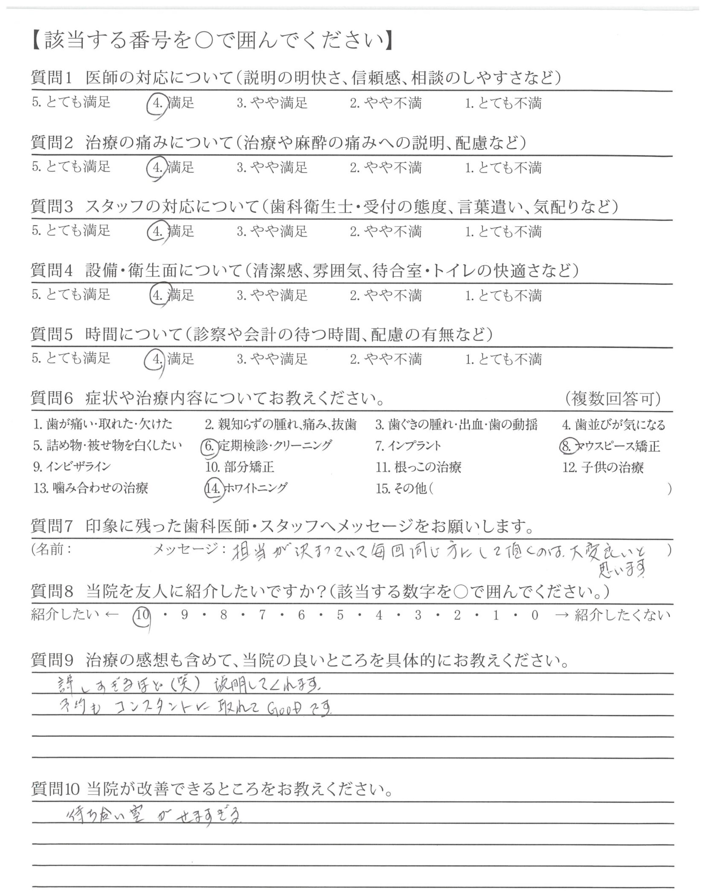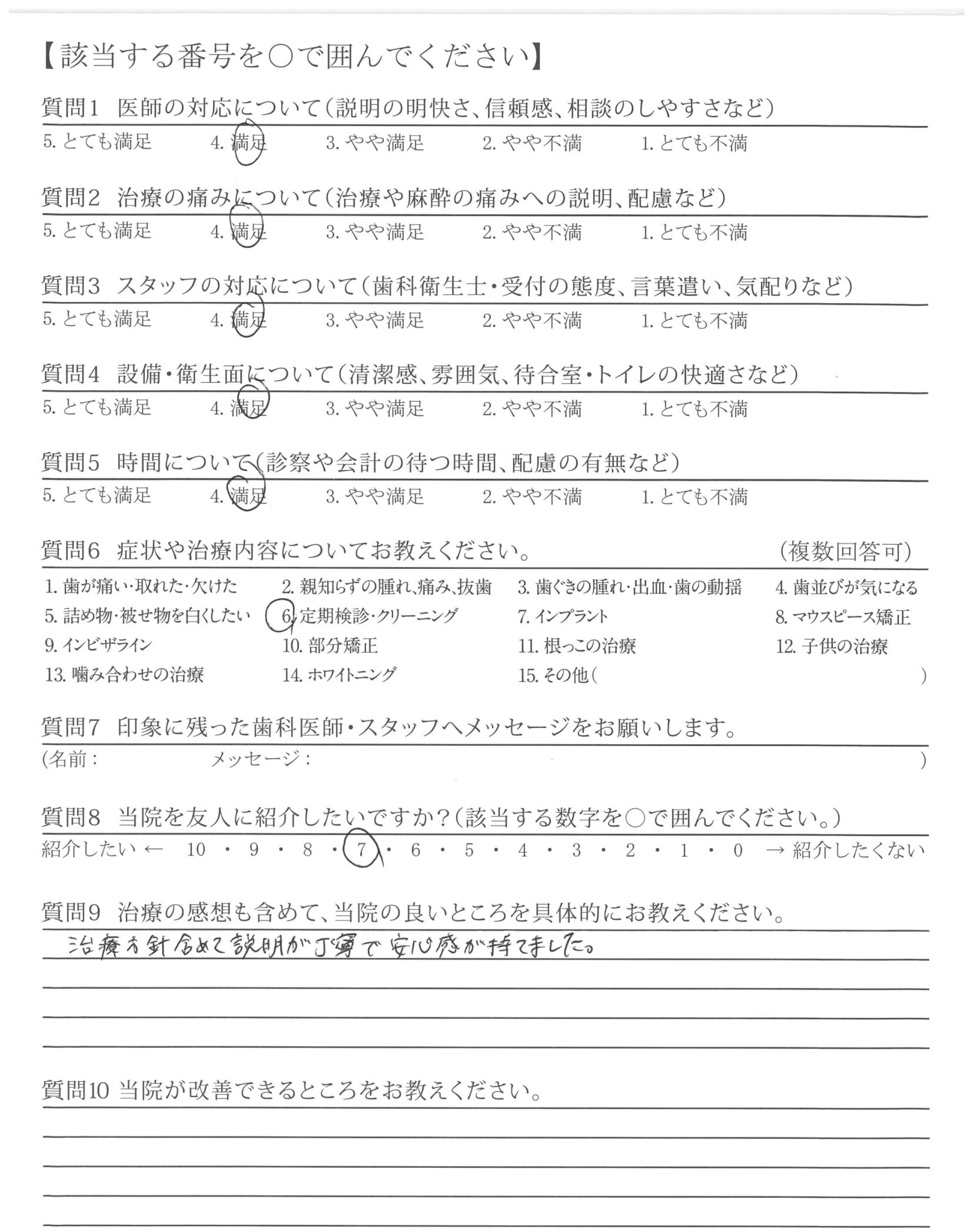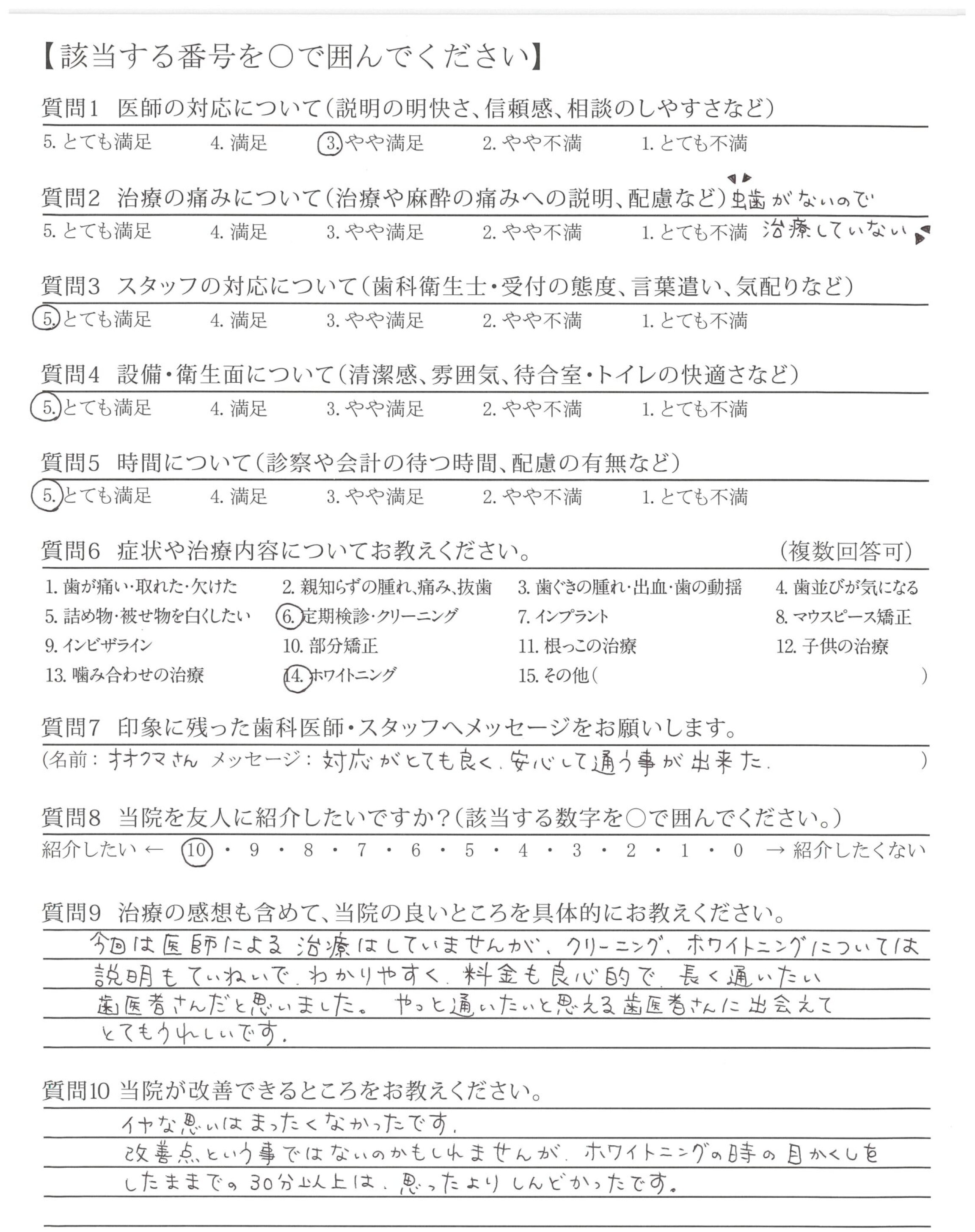 今回は医師による治療はしていませんが、クリーニング、ホワイトニングについては説明もていねいで、わかりやすく、料金も良心的で、長く通いたい歯医者さんだと思いました。やっと通いたいと思える歯医者さんに出会えてとてもうれしいです。