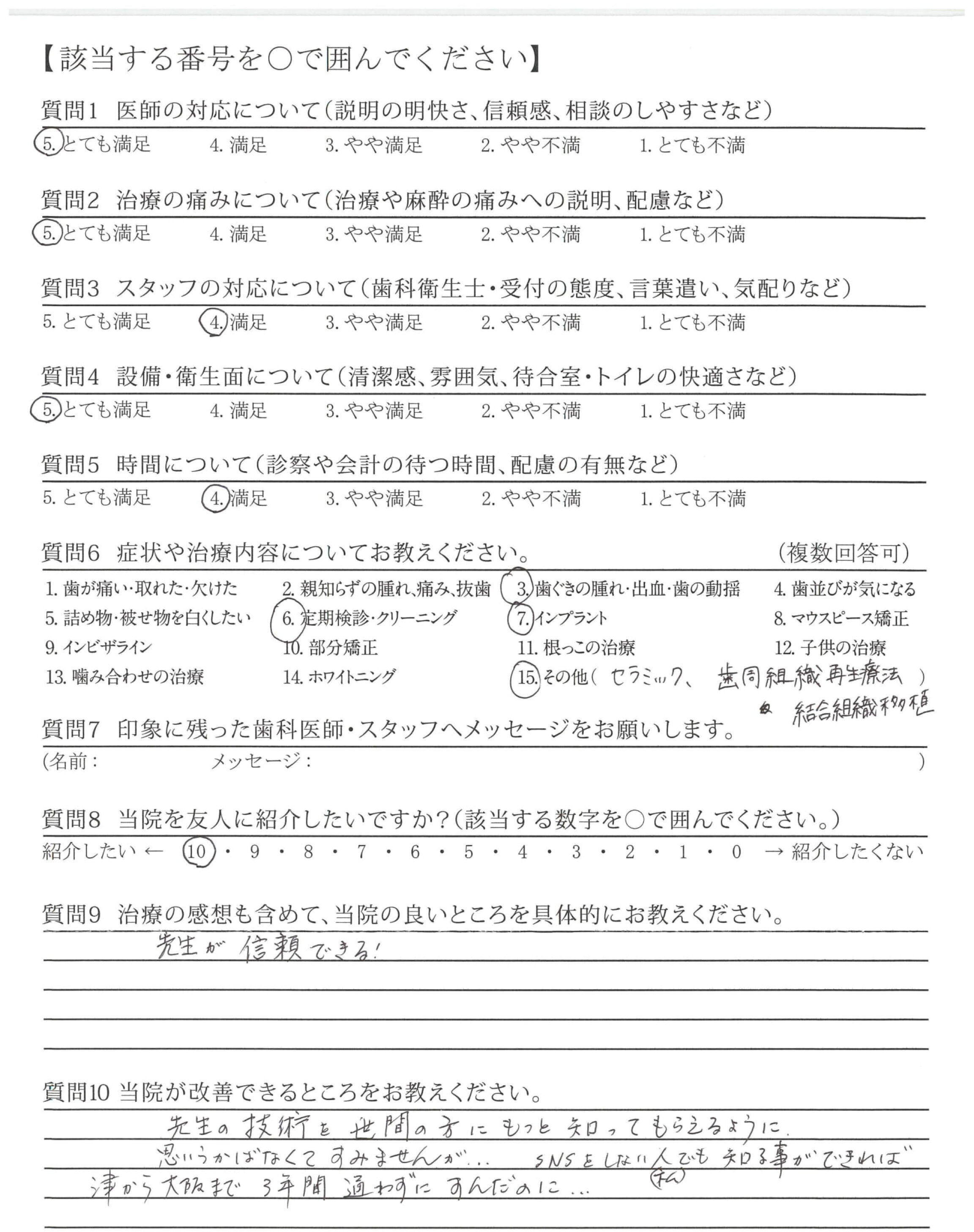今回、歯周病再生治療をお願いすることになり、他に2つの病院へ行きこちらを選びました。かなりひどい状態から丁寧な対応かつ、相談しながらの治療で安心して通うことが出来ました。また先生の手術や対応の腕の良さも強く感じました。