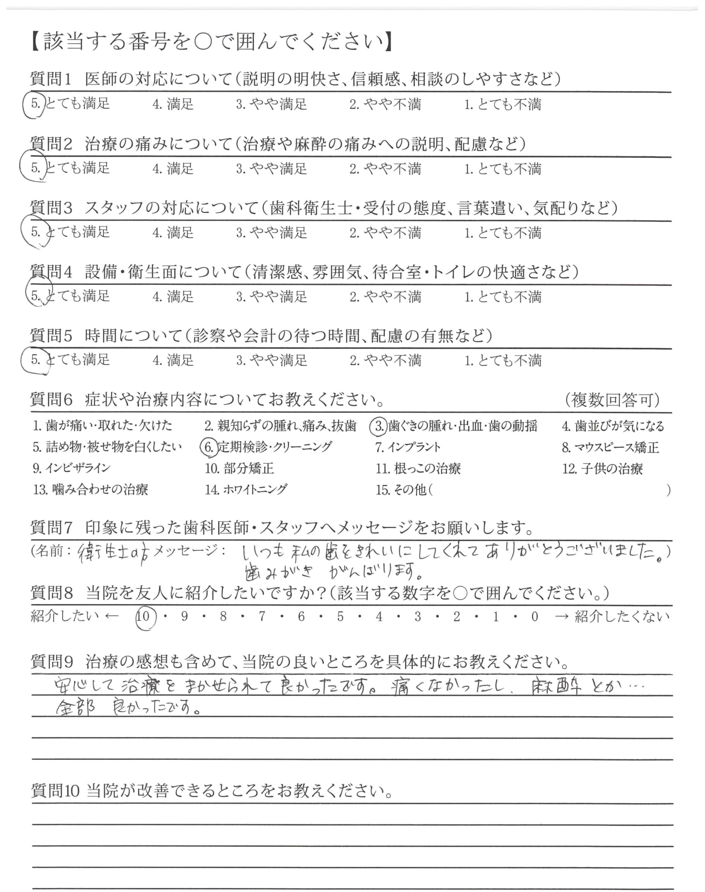 クリーニングがていねいでやさしく、受けている間ラクで負担が全くありませんでした。質問に対して親身に応えて下さいました。