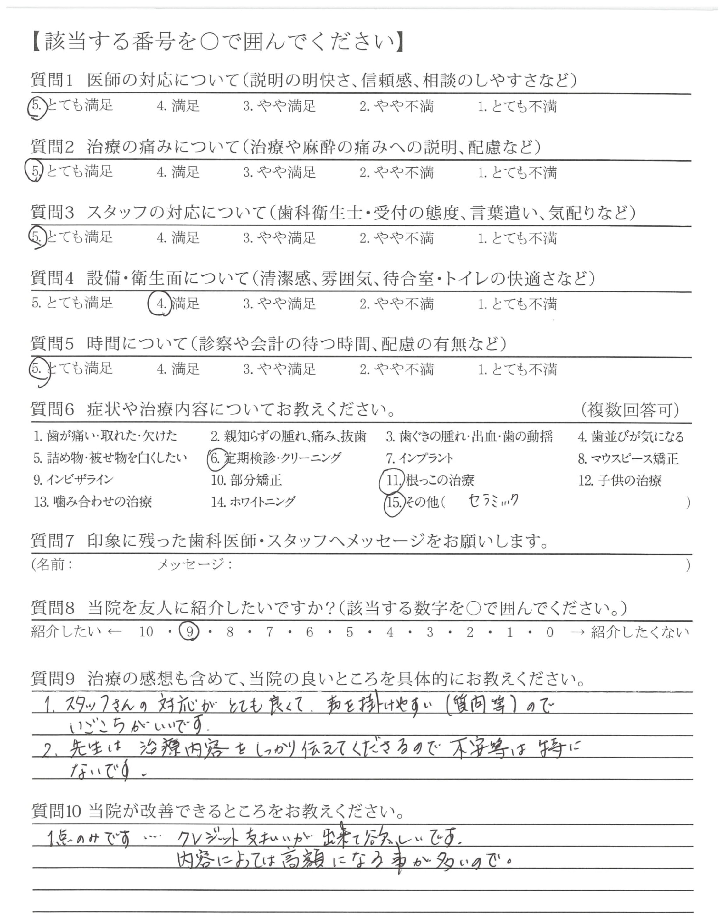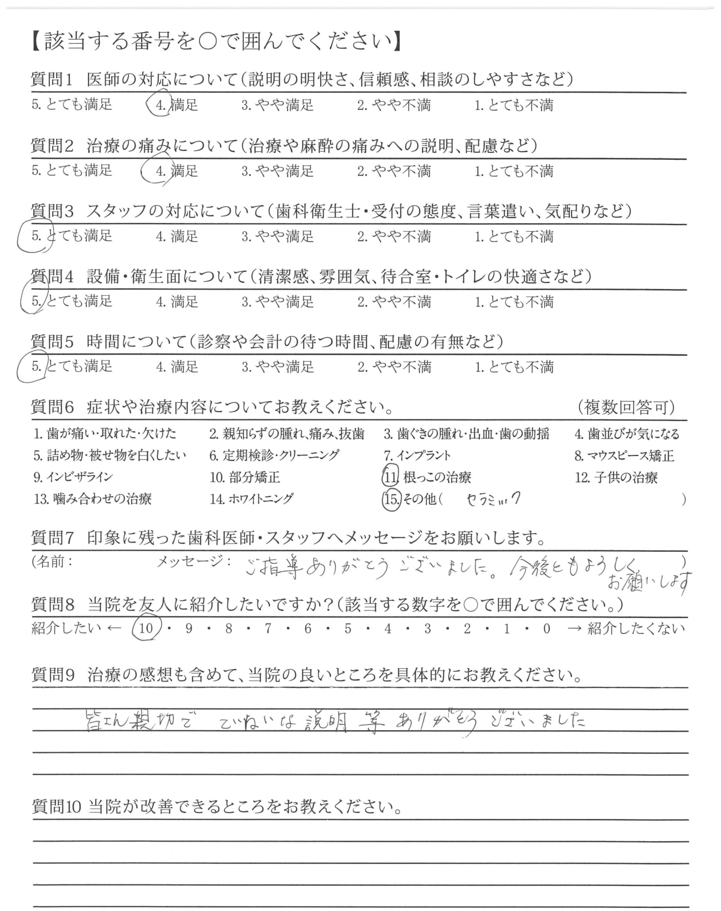 ・根の治療ではラバーダム?など、新しい技術で治療を可能にして頂き(今のところ抜歯せずに済みました)ありがたく思っております。