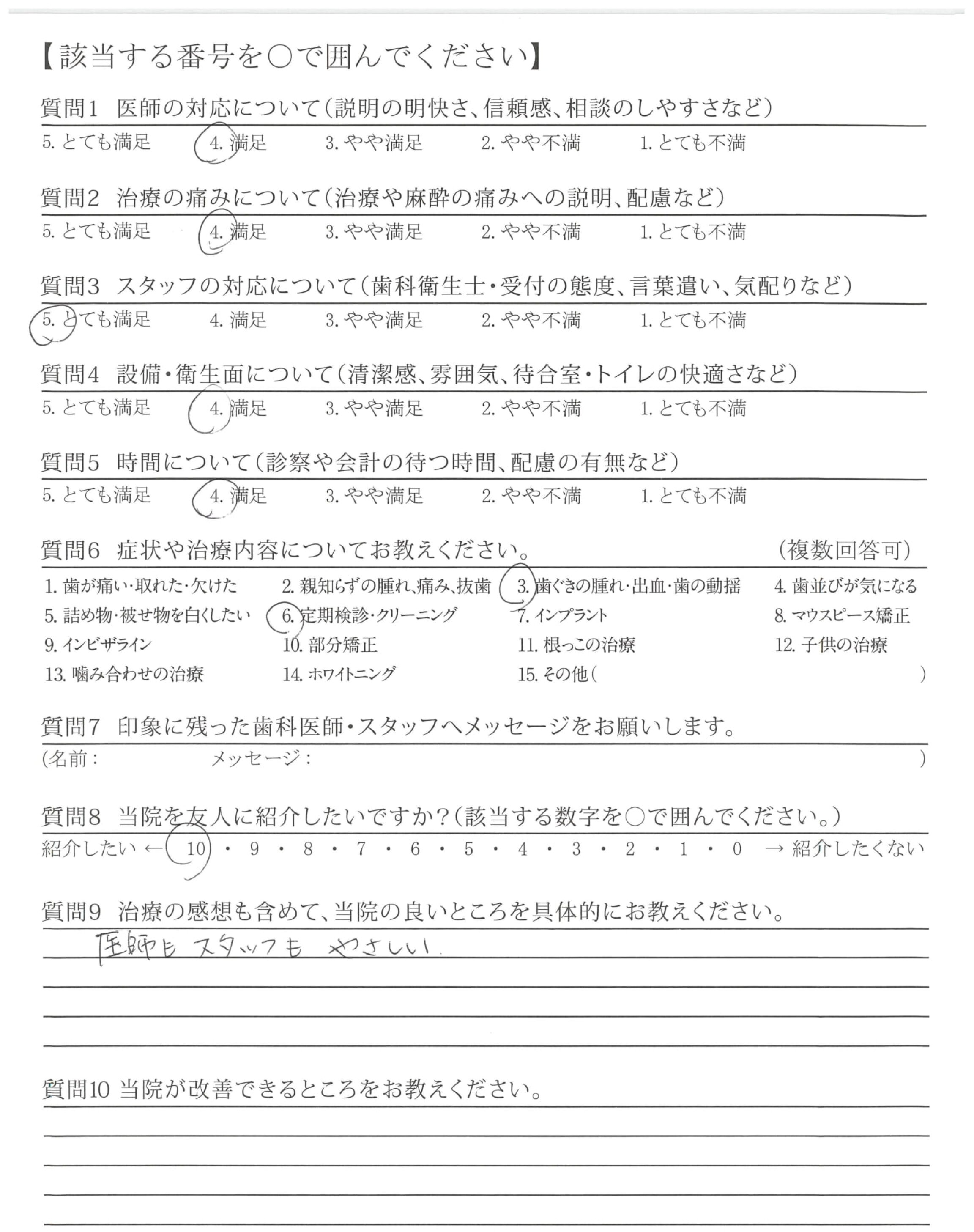 口腔内の状況をいつも丁寧に書いていただいております。先日も親知らずを抜くのをためらっていたら「勇気を出して抜きましょう」と...抜歯後の先生のコメント「勇気を出していただきありがとうございます」の一言に感謝!!