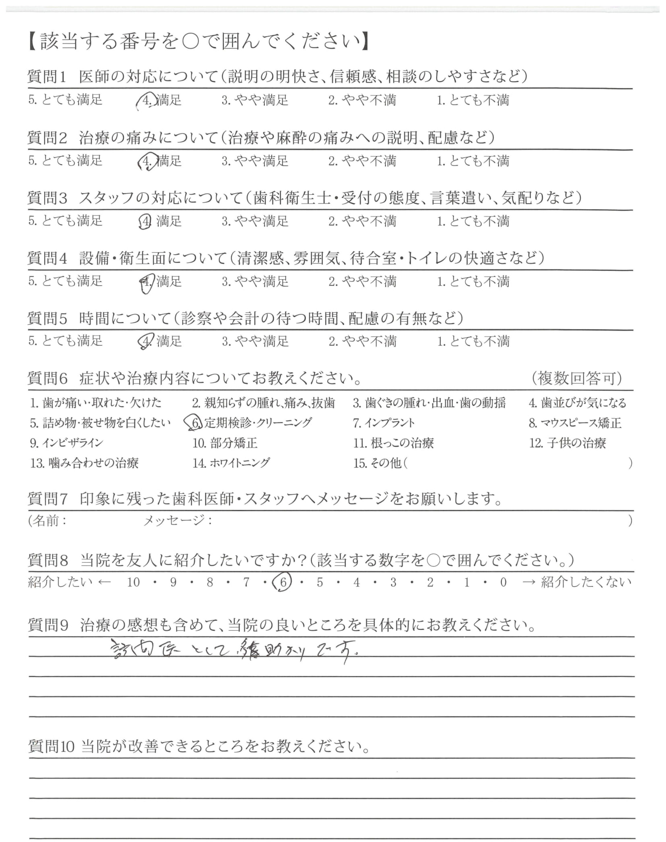 訪問歯科を利用していますが、わかりやすい説明で親身に対応して頂き、初回からとても安心して治療を受ける事ができました。