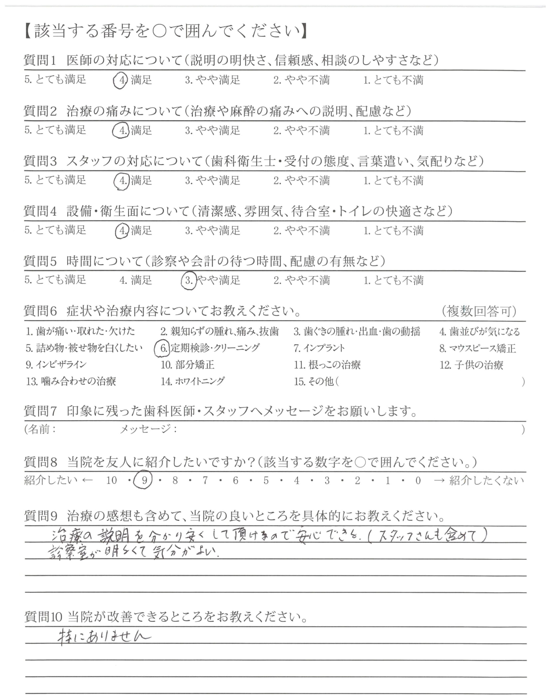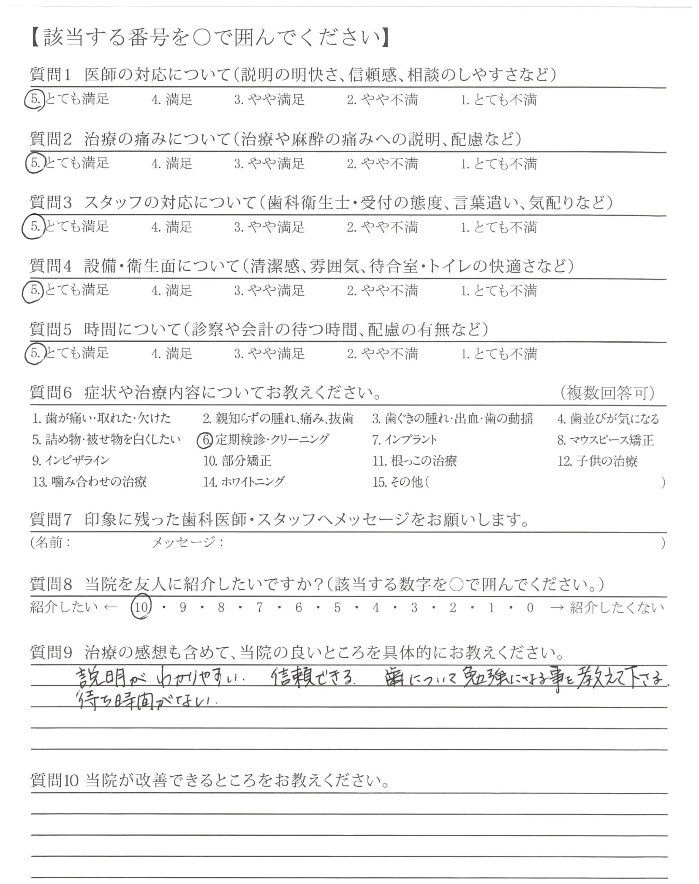 高評価ありがとうございます。これからも、お待たせすることなく、分かりやすい説明とともに、しっかりと治療とケアをさせていただきますので、よろしくお願いいたします。