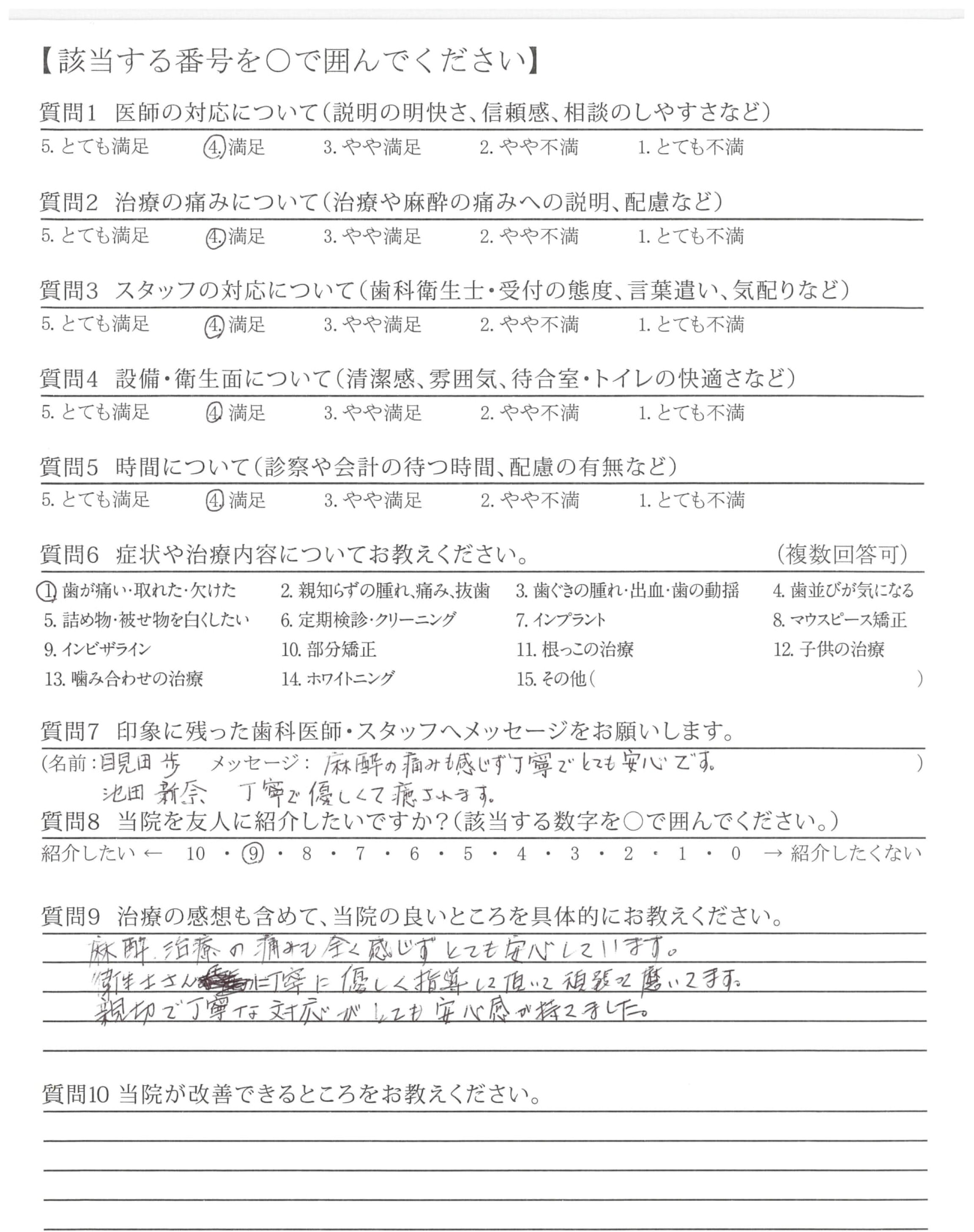 痛みも感じないように細かくますいをしてくれたり、安心しておまかせしています。