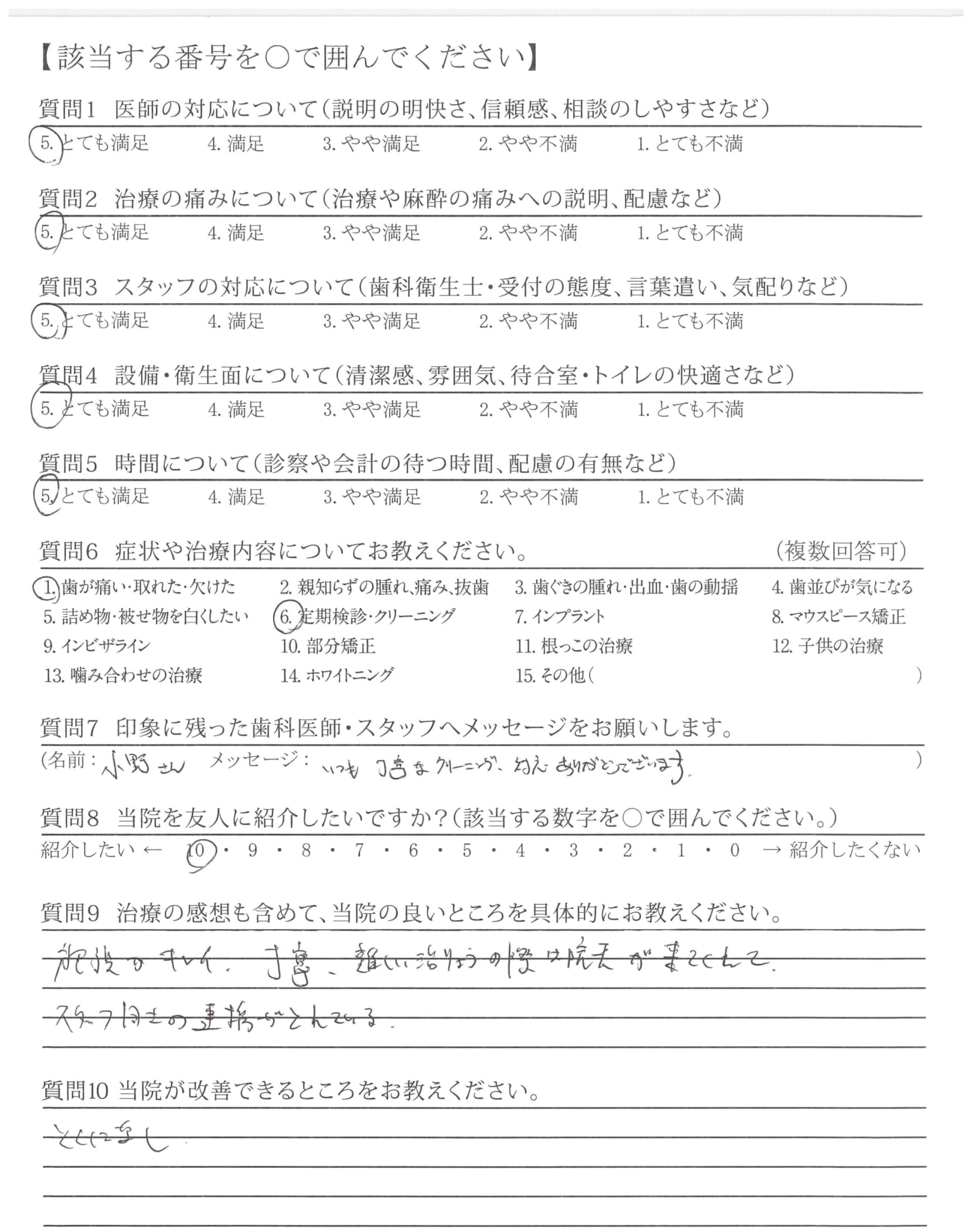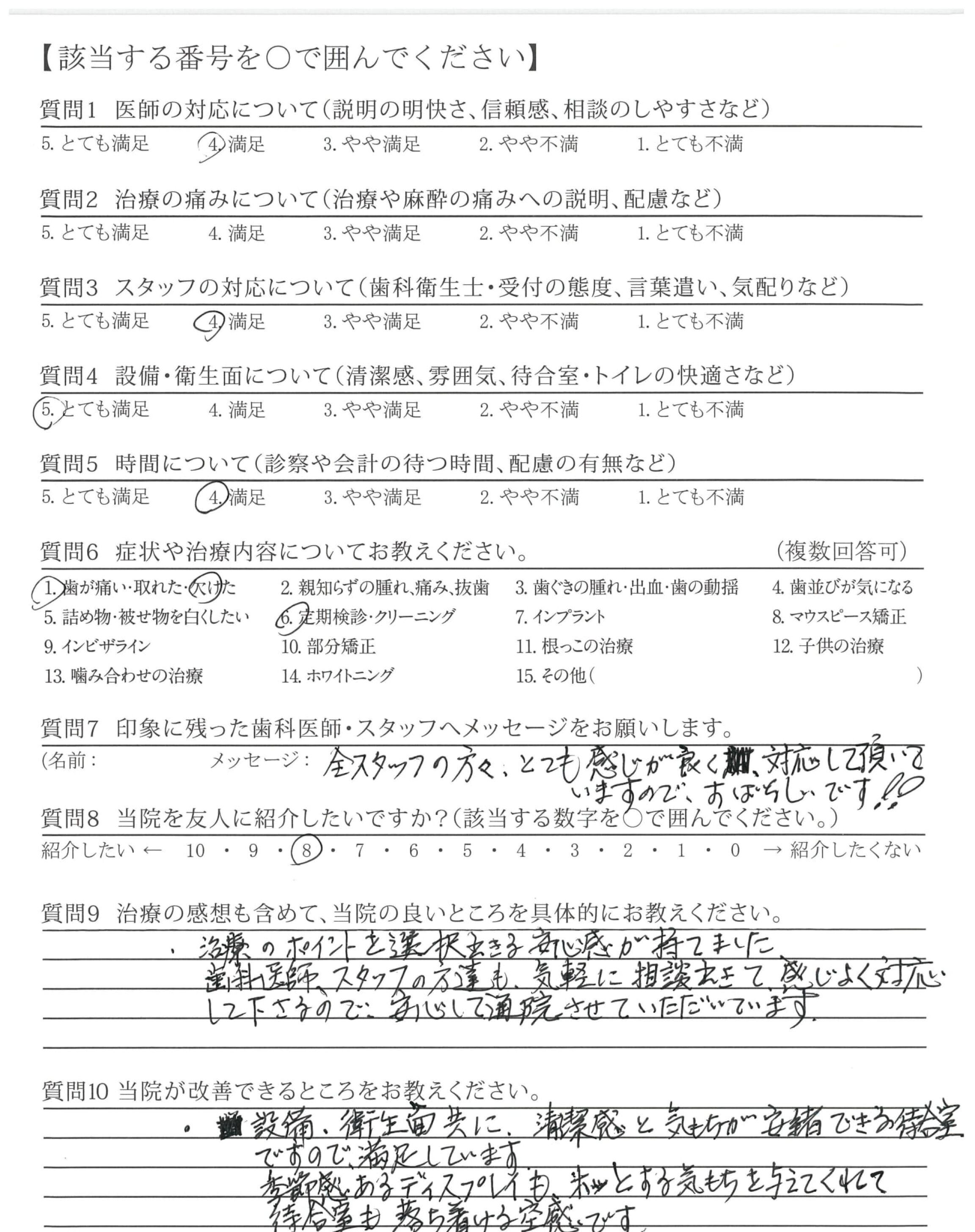 初めて歯茎の中の方まで歯石を取っていただき、調子も良好です。感謝しております。又、みなさん挨拶もしていただけるので気持ちいいです。