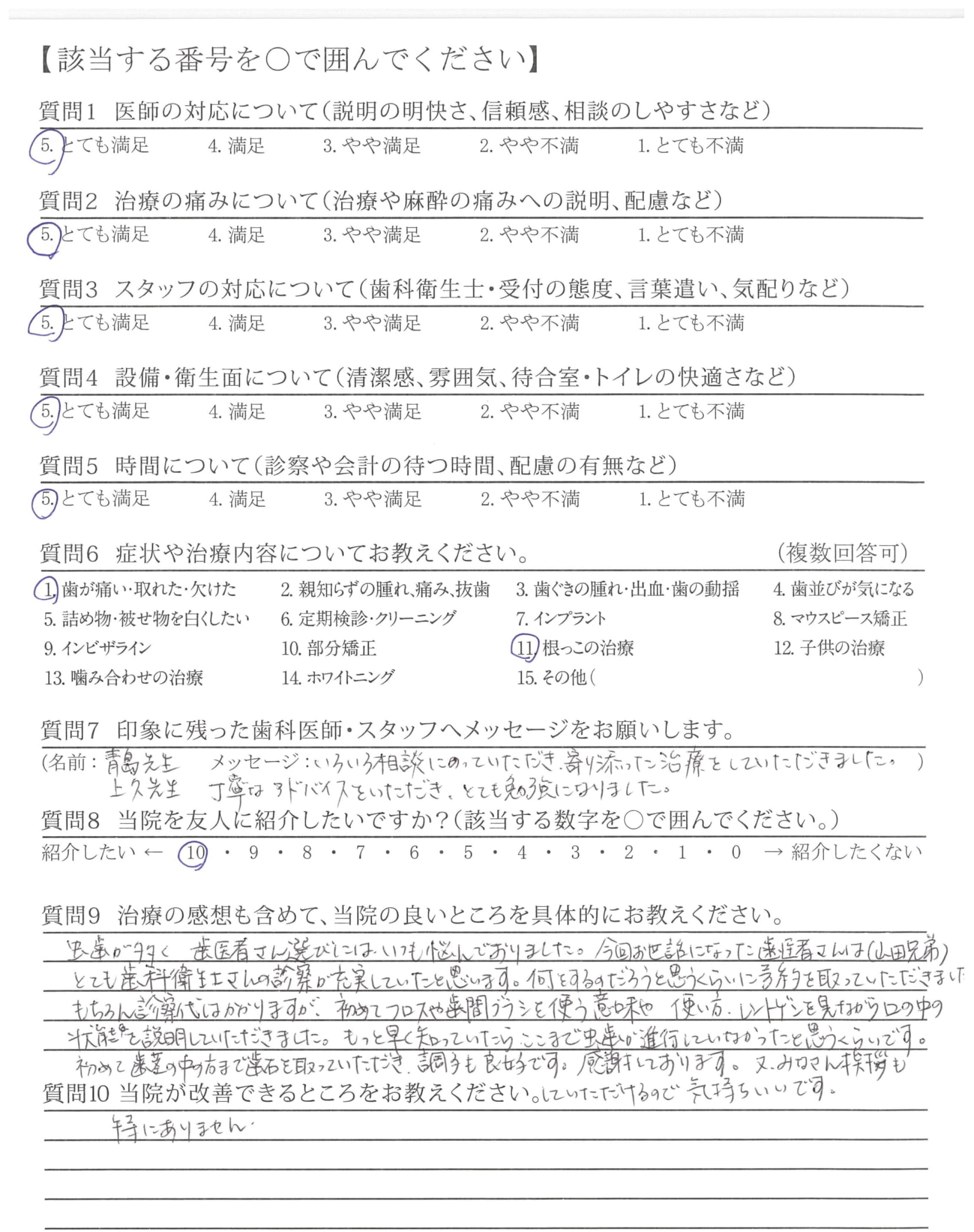いろいろ相談にのっていただき、寄り添った治療をしていただきました。