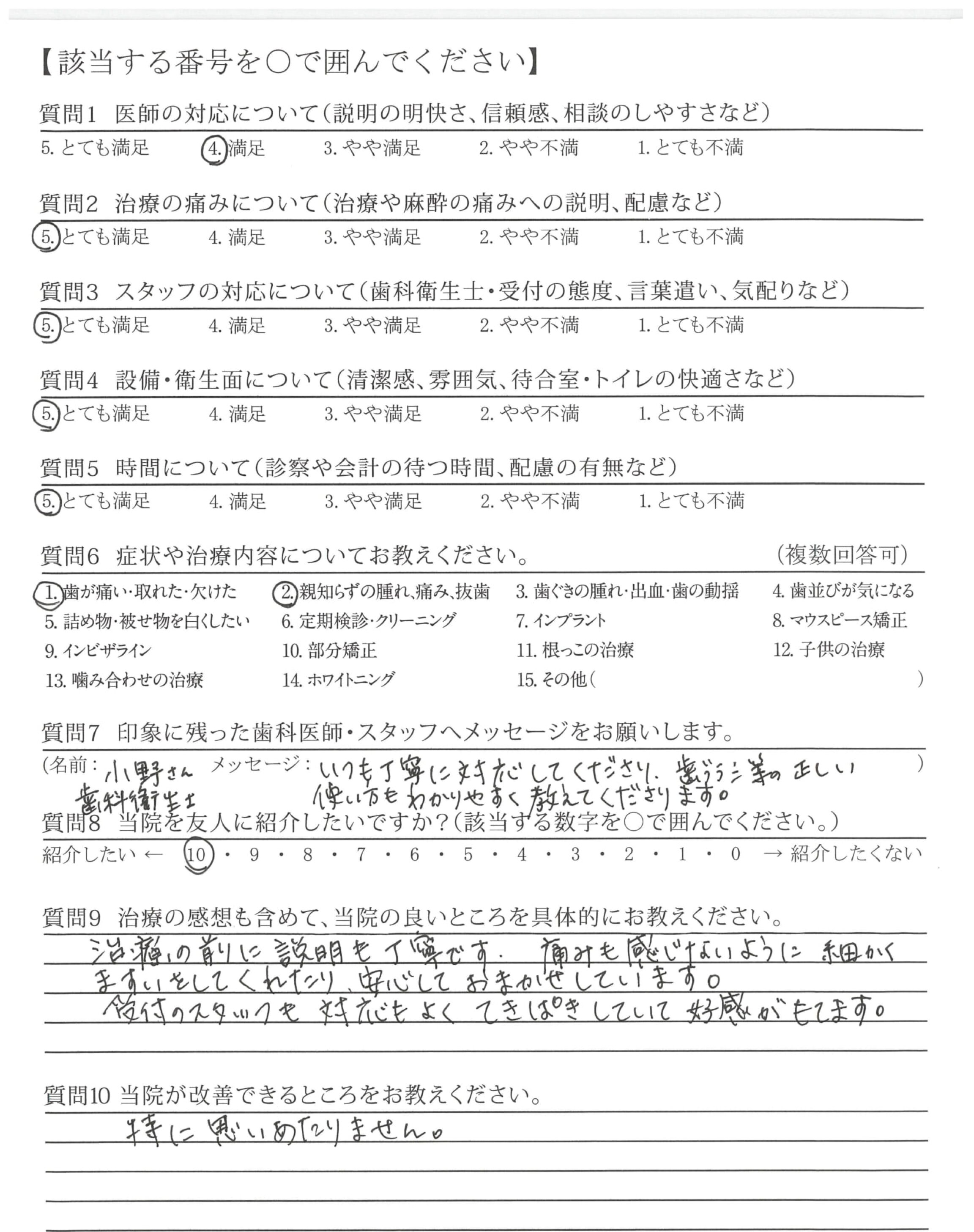 いつも適切な治療をしてもらえて、信頼出来る歯科医院です。