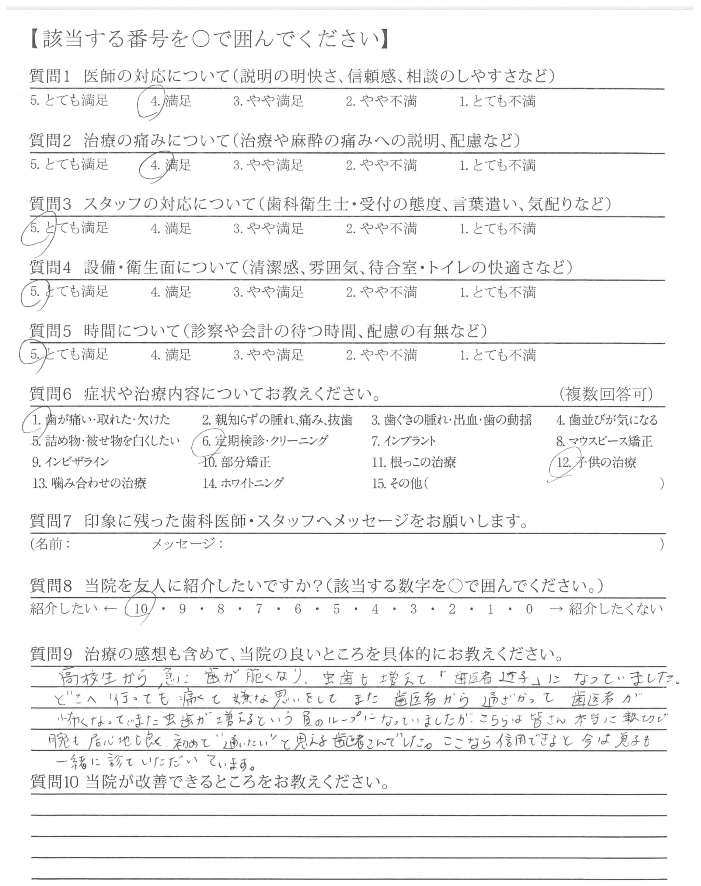 高校生から急に歯が脆くなり、虫歯も増えて「歯医者迷子」になっていました。どこへ行っても痛くて嫌な思いをしてまた歯医者から遠ざかって歯医者が怖くなって、また虫歯が増えるという負のループになっていましたが、こちらは皆さん本当に親切で腕も居心地も良く、初めて"通いたい"と思える歯医者さんでした。ここなら信用できると今は息子も一緒に診ていただいています。