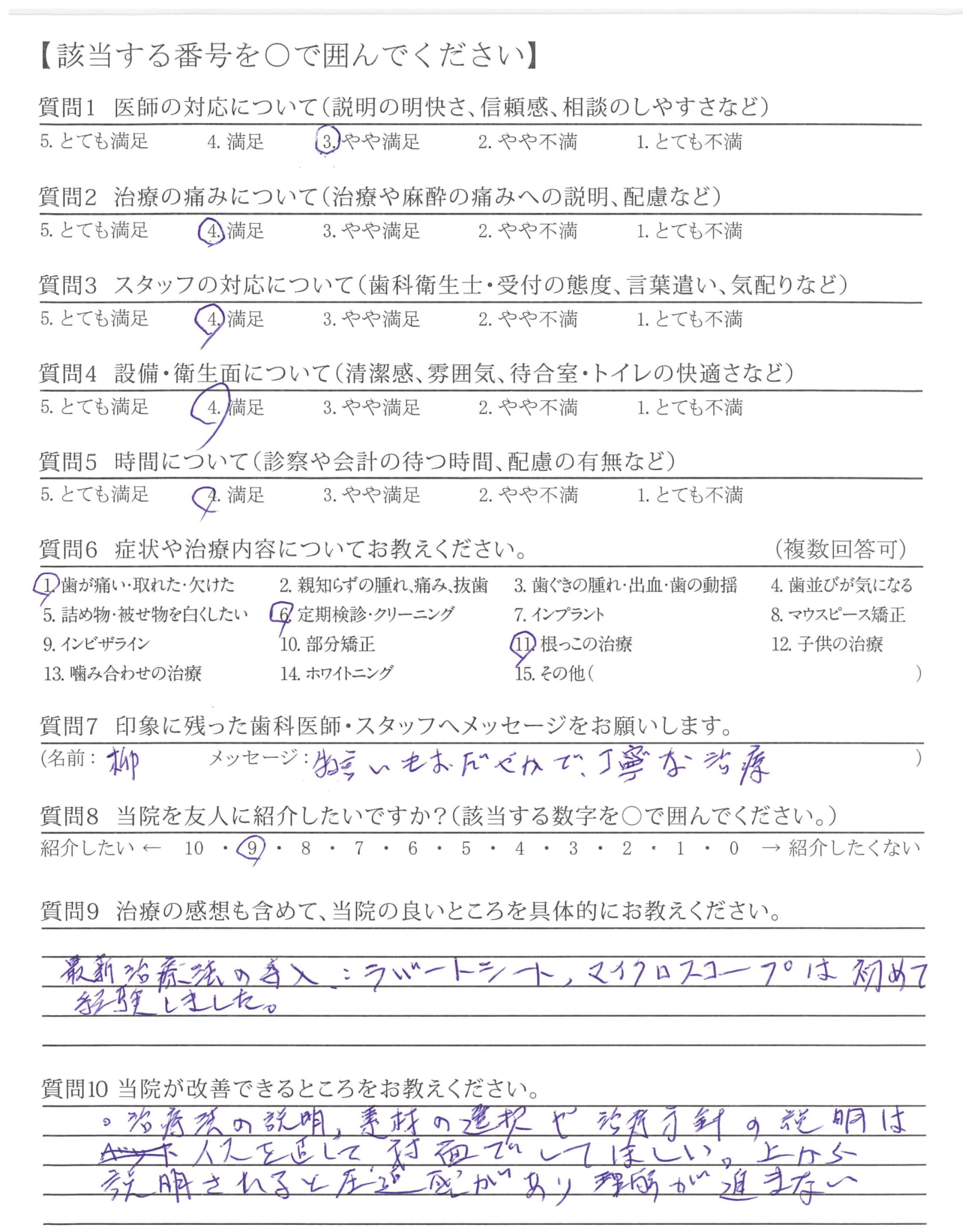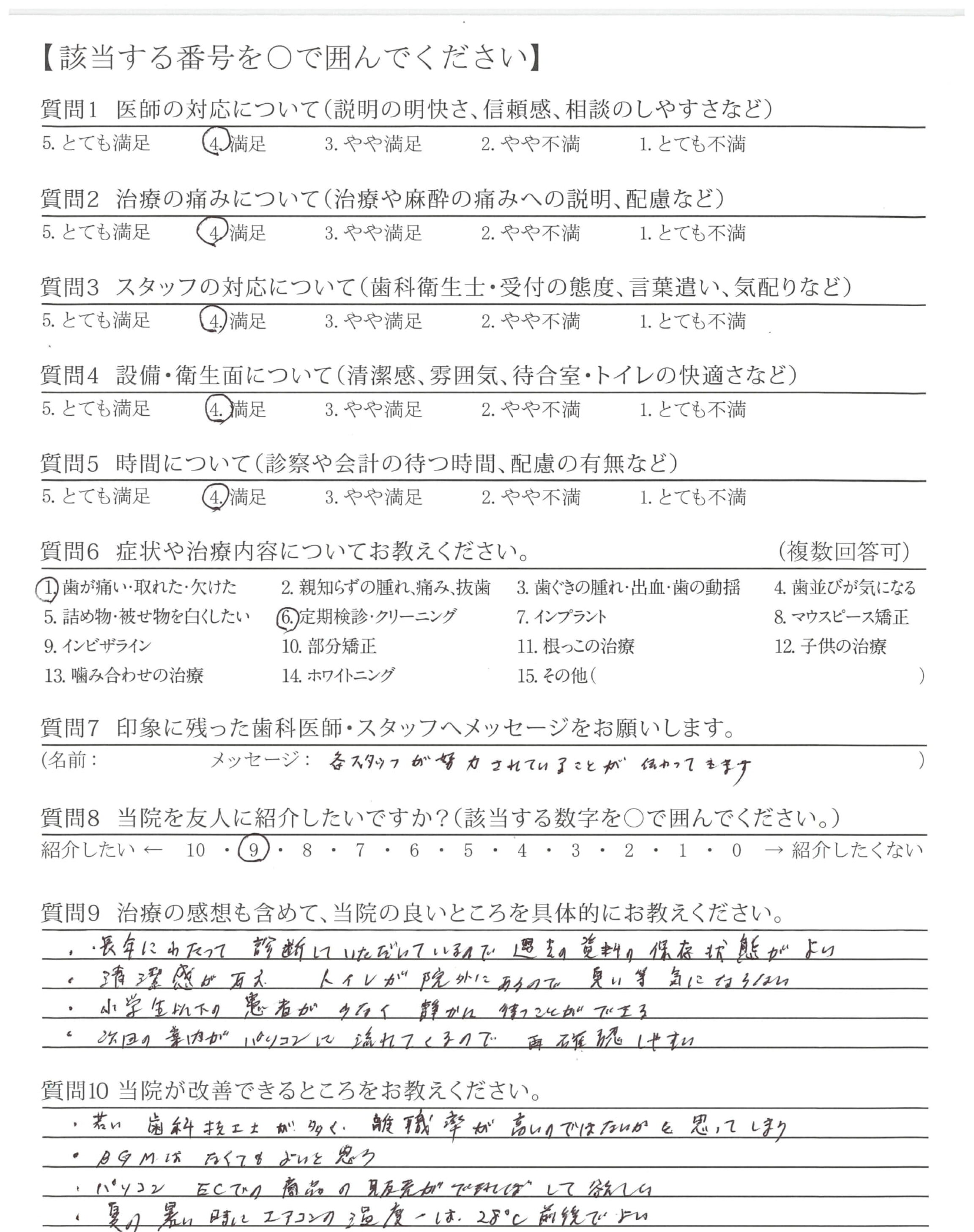 4月、5月に行くと新人さんの研修にあたるのがとてもイヤです。研修では患者を練習に利用して欲しくないです。スタッフ同士で研修、もしくは安い料金で対応していただきたいです。私は口を開けているのが辛いので慣れてるスタッフを指名しています。