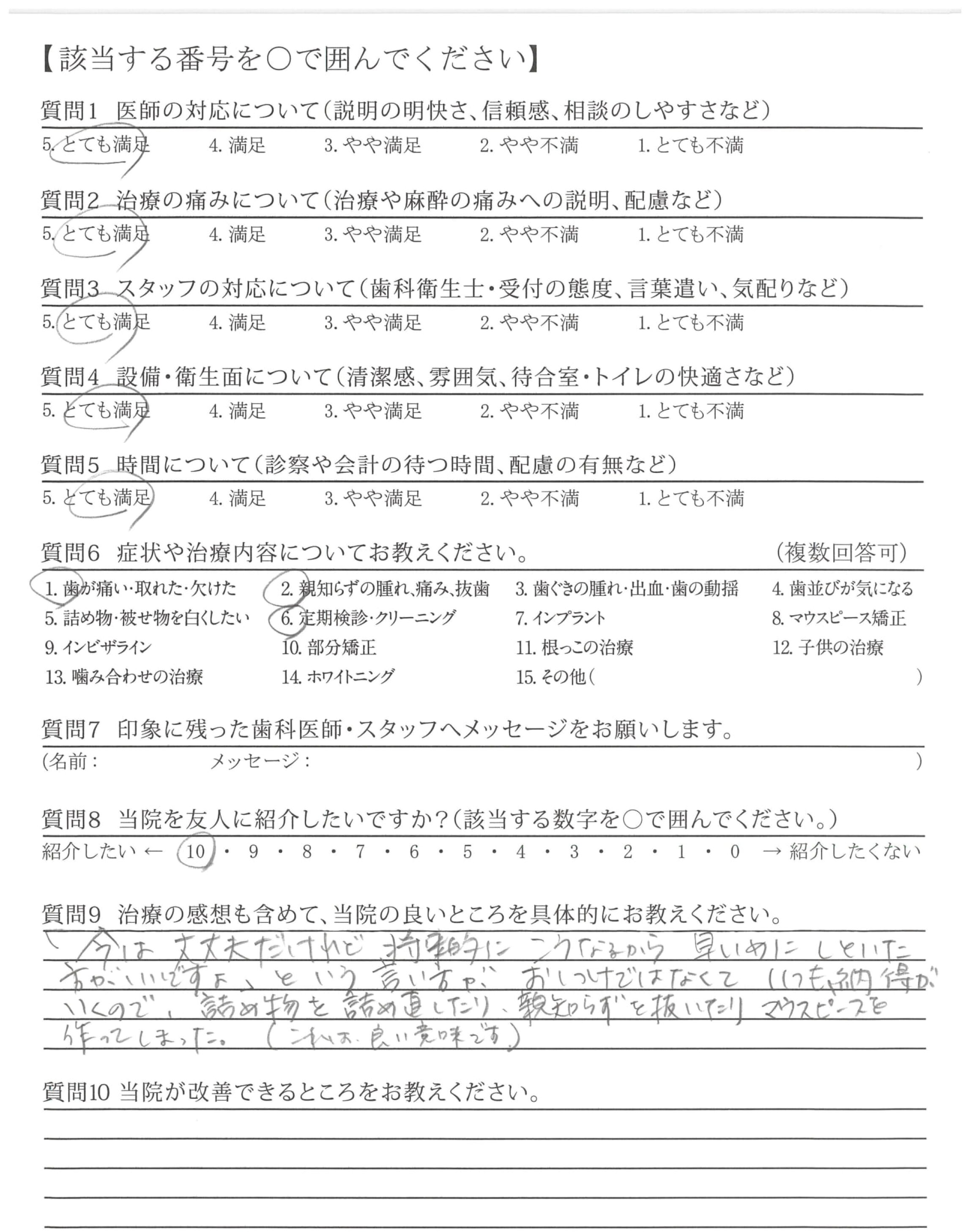 「今は大丈夫だけれど将来的にこうなるから早いめにしといた方がいいですよ」という言い方が、おしつけではなくていつも納得がいくので、詰め物を詰め直したり、親知らずを抜いたりマウスピースを作ってしまった。(これは良い意味です)