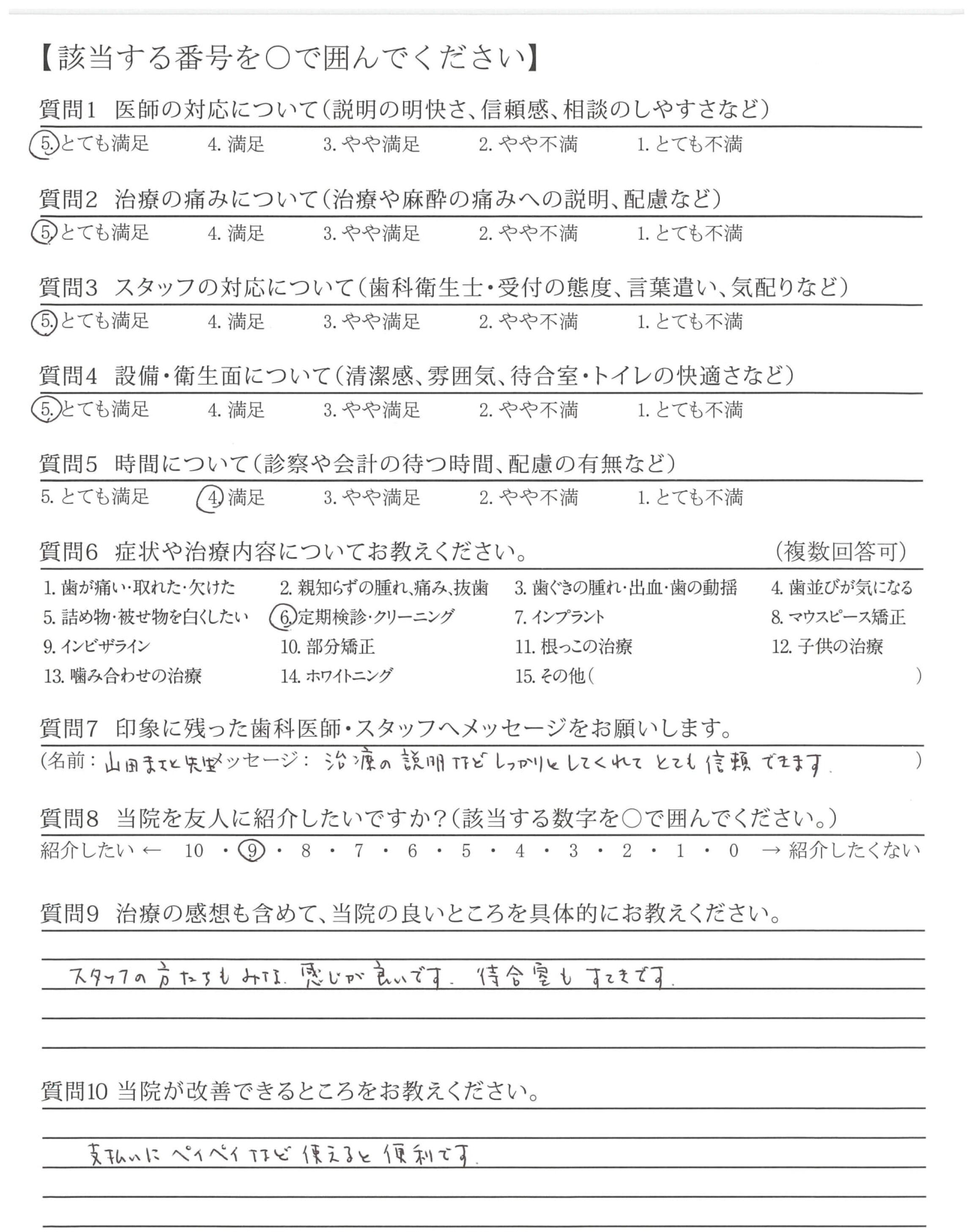(山田先生のような)安心しておまかせできる先生が増えてくれるとうれしいです。私も子どもたち(6~15才)もずっと通い、みていただきたいと思っています。