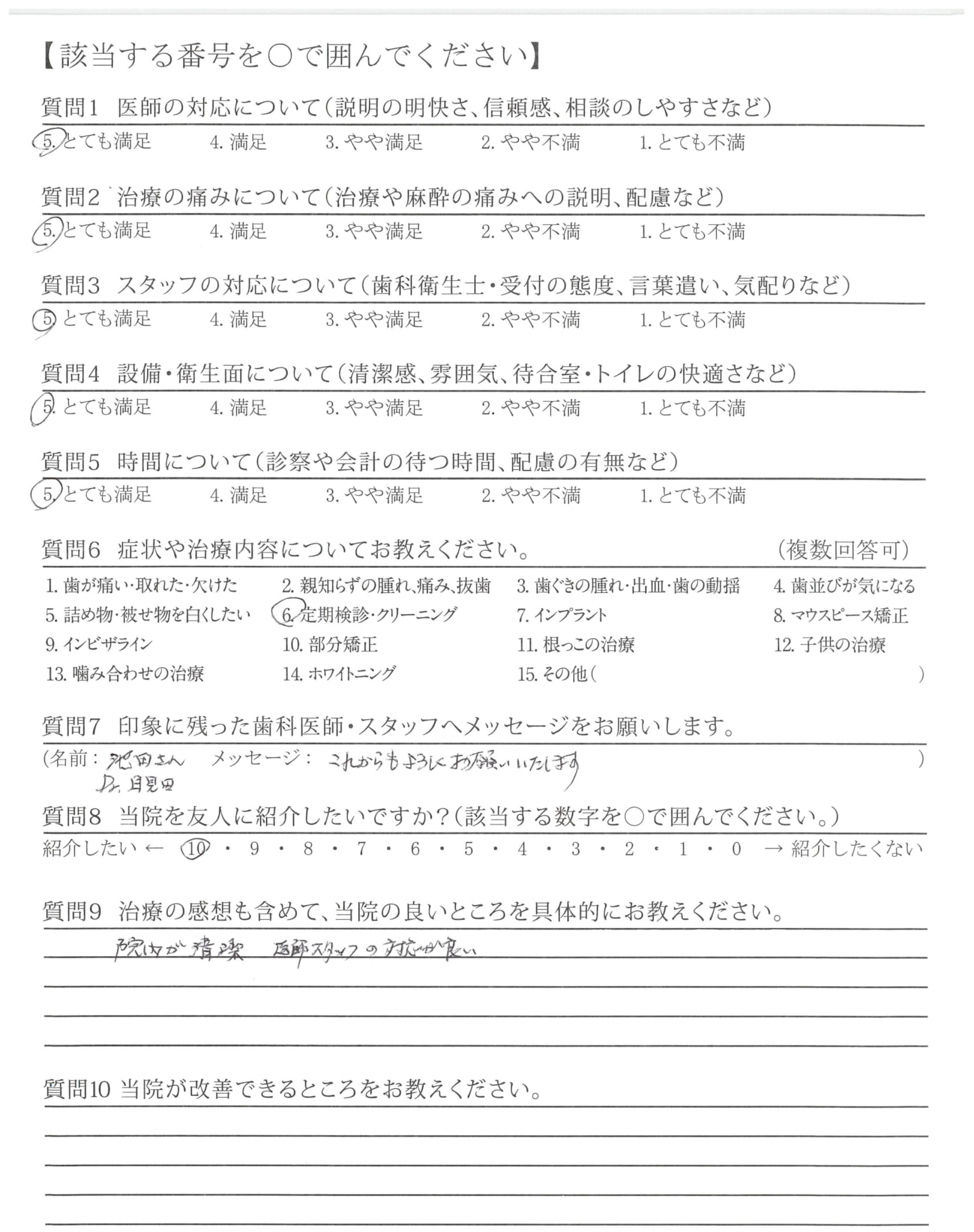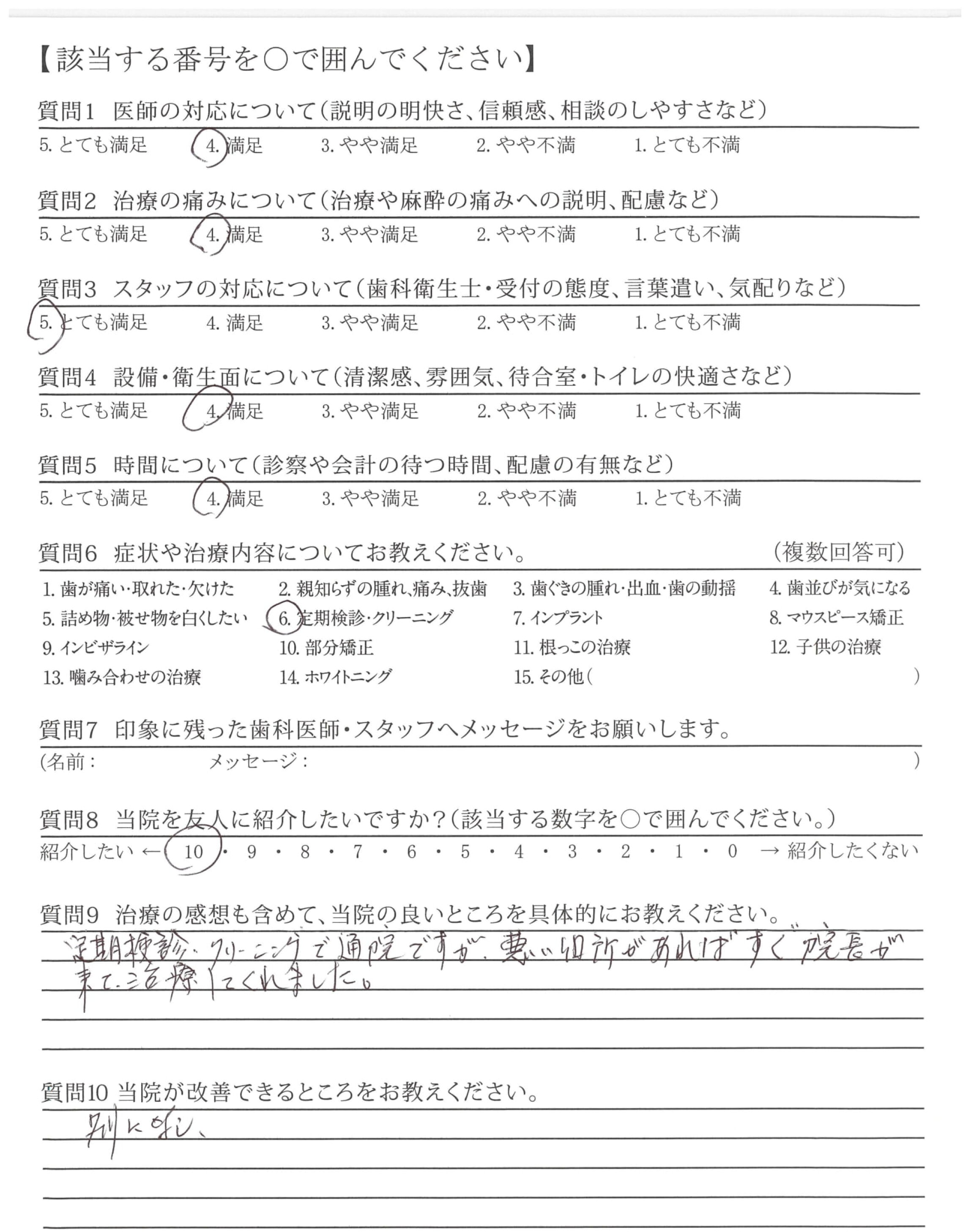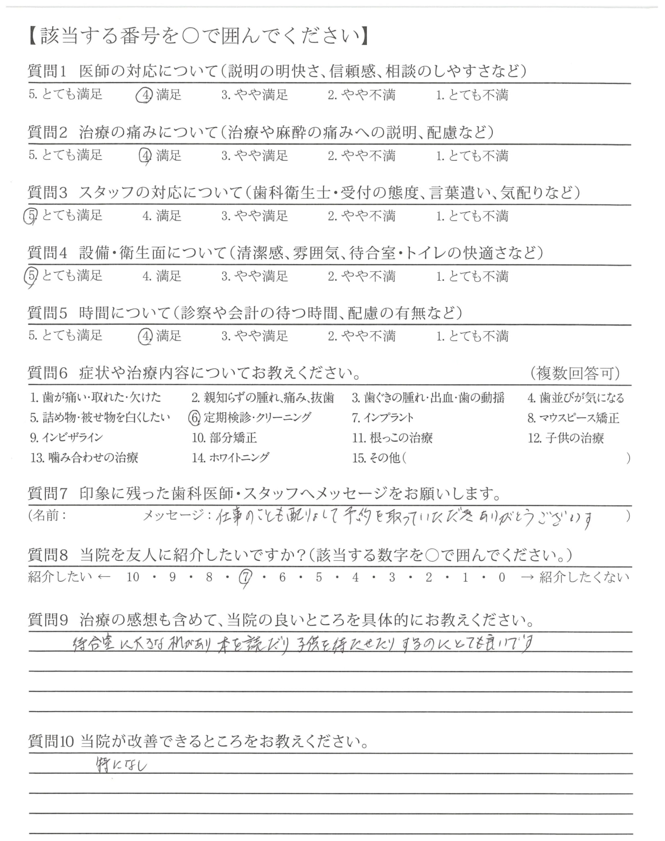 治療をしてもらった事がないので、「治療の痛みについて」については記入していません。