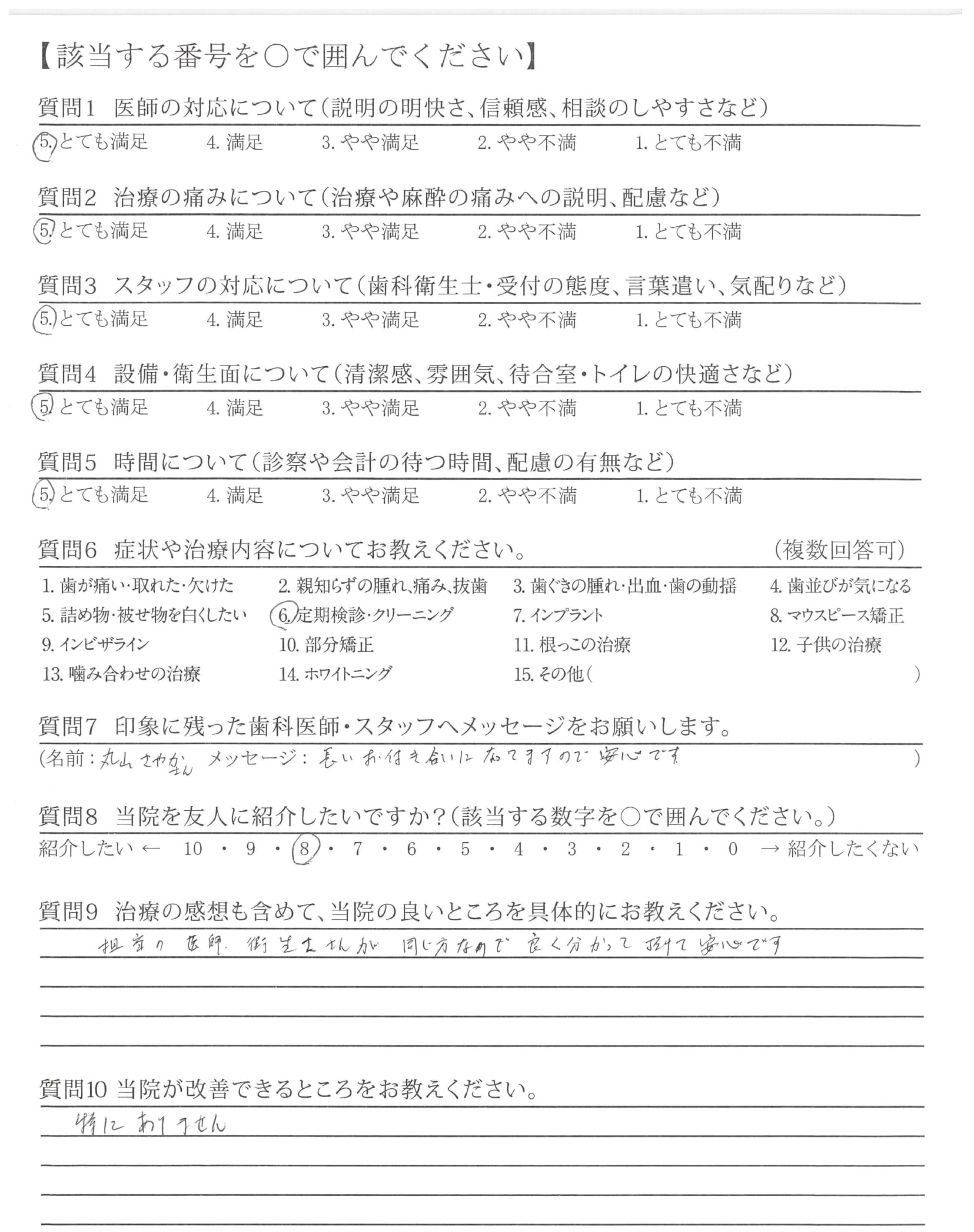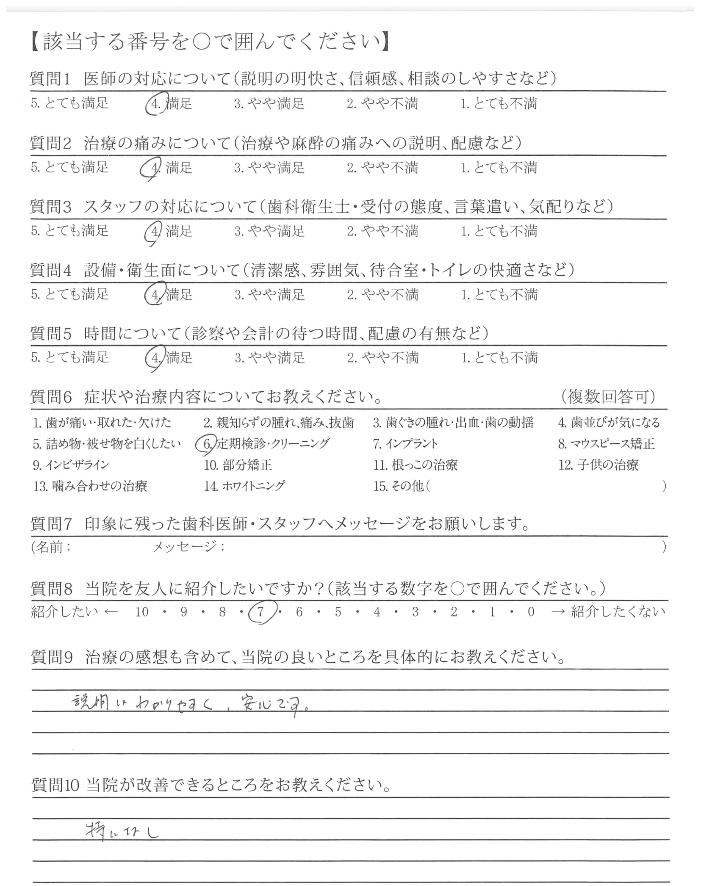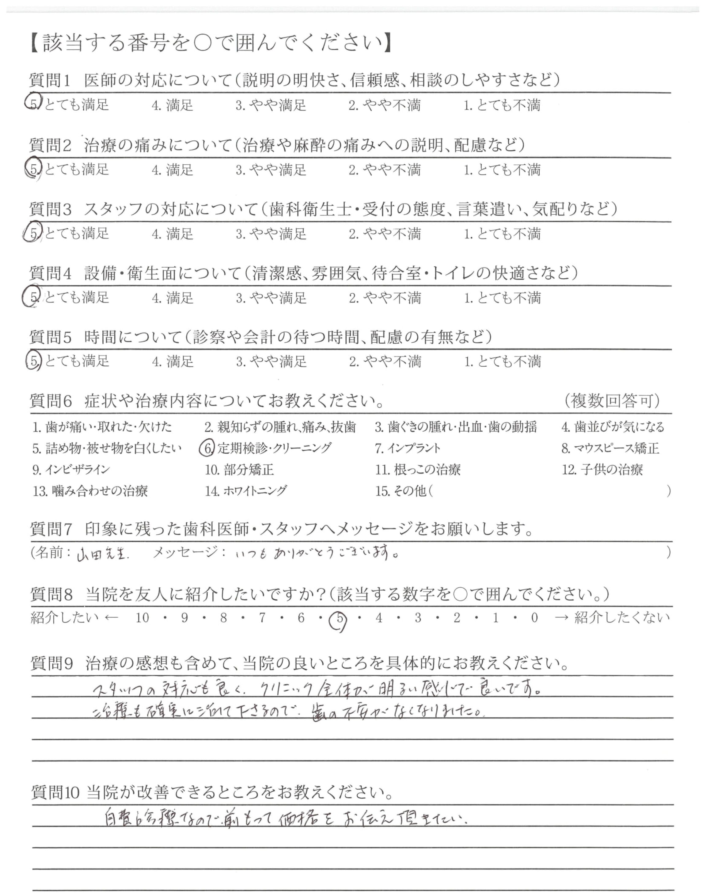 治療後のメンテナンスに関しても丁寧にご指導頂き感謝しています。