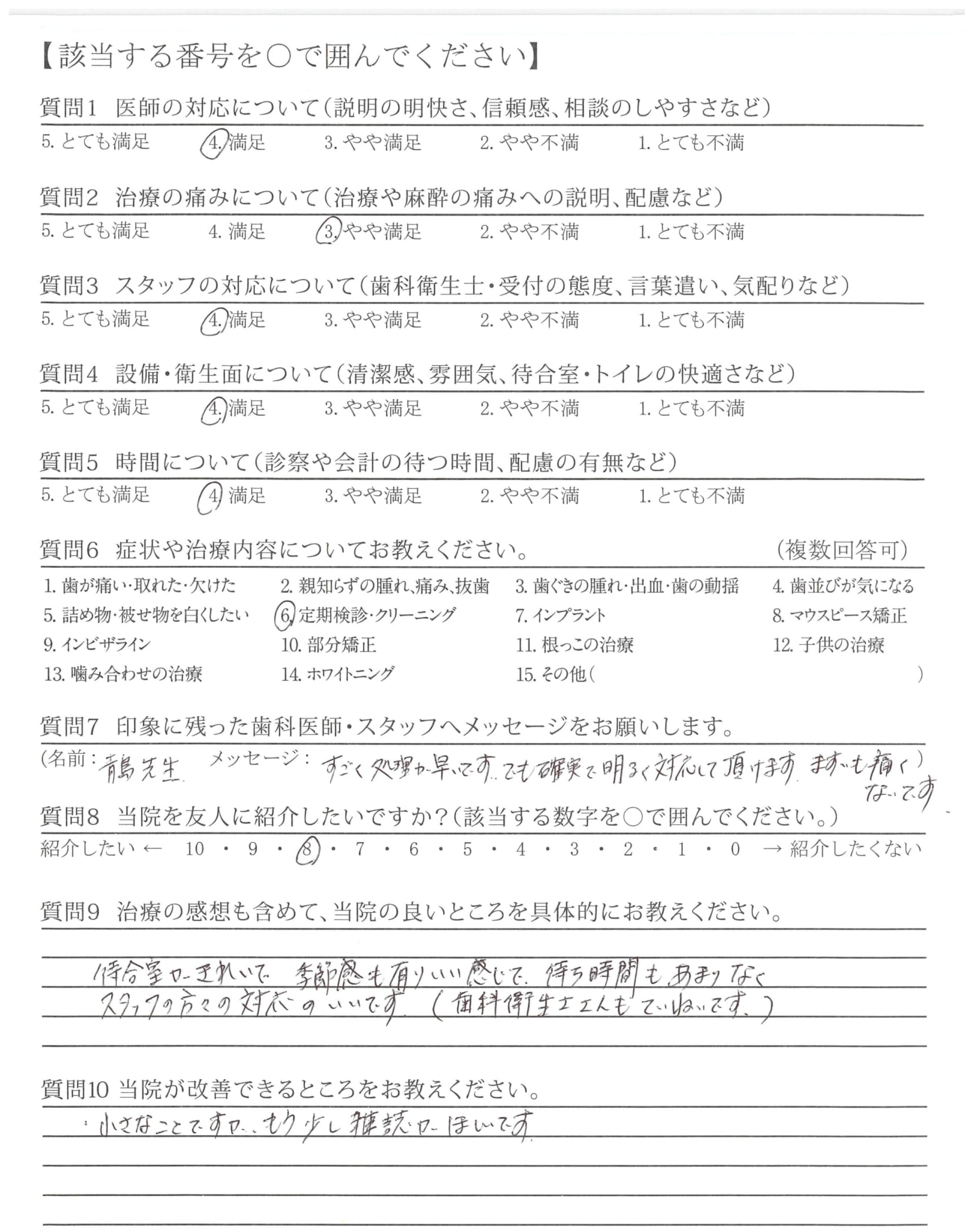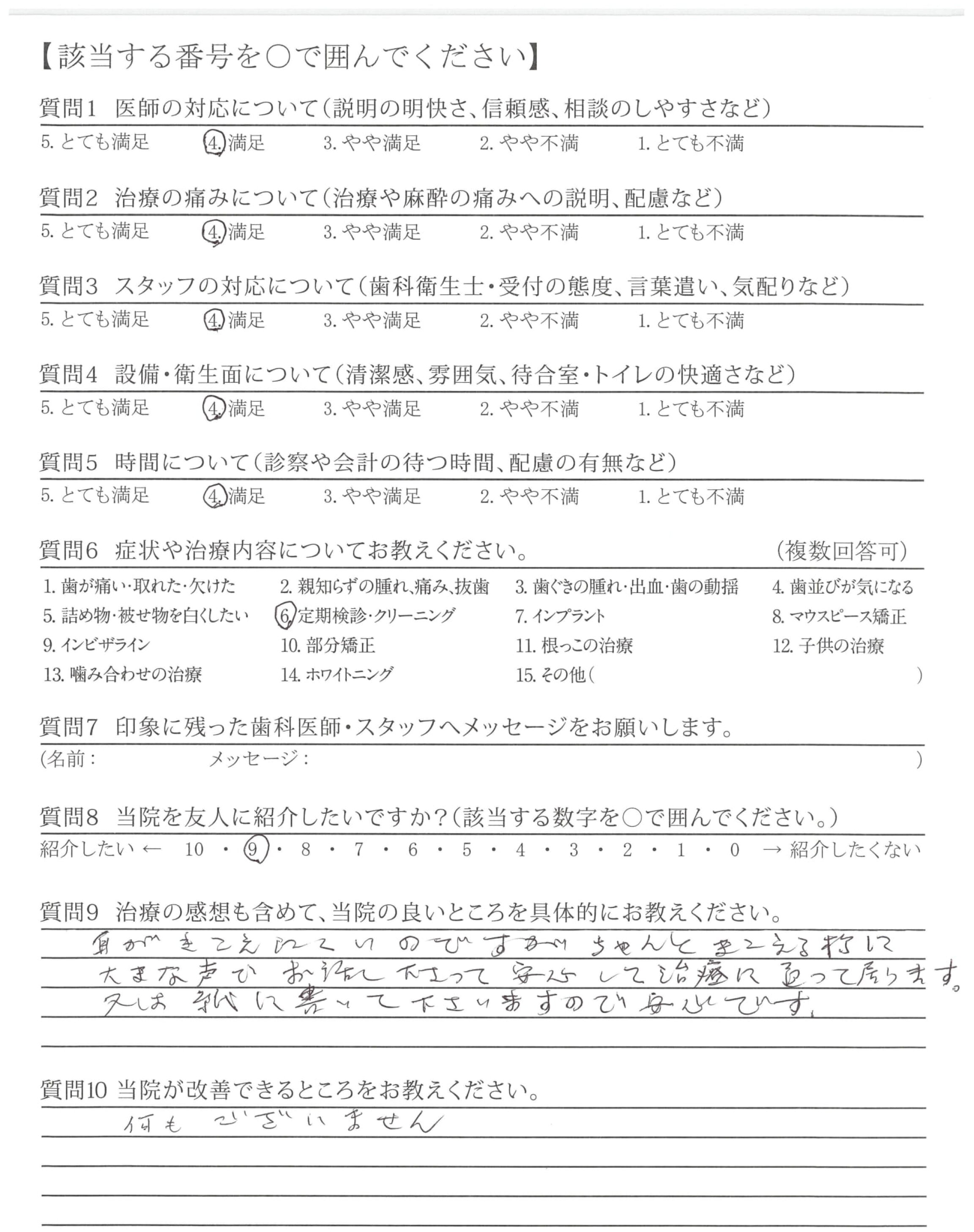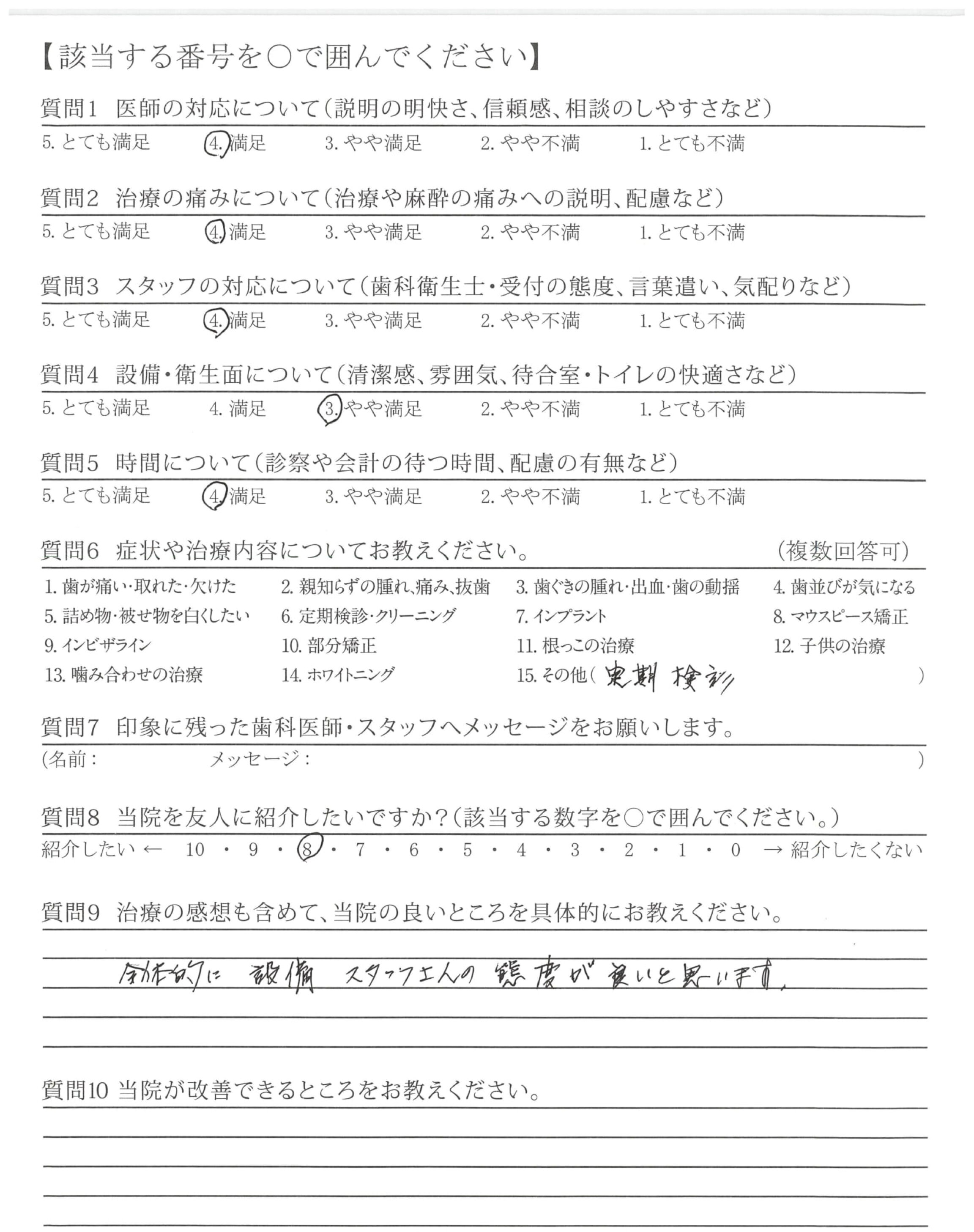 初めて歯茎の中の方まで歯石を取っていただき、調子も良好です。感謝しております。又、みなさん挨拶もしていただけるので気持ちいいです。