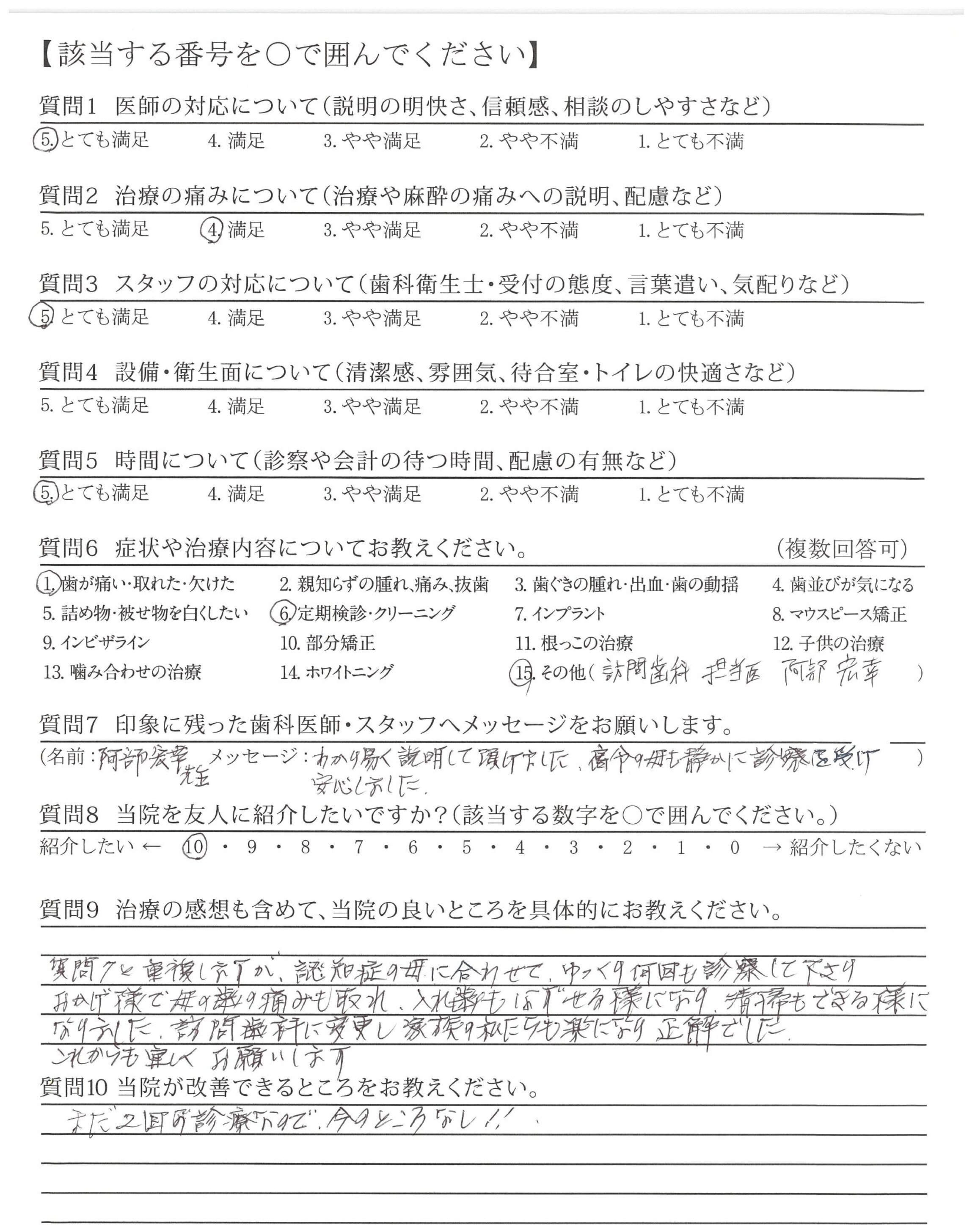 訪問歯科に変更し家族の私たちも楽になり正解でした。これからも宜しくお願いします。