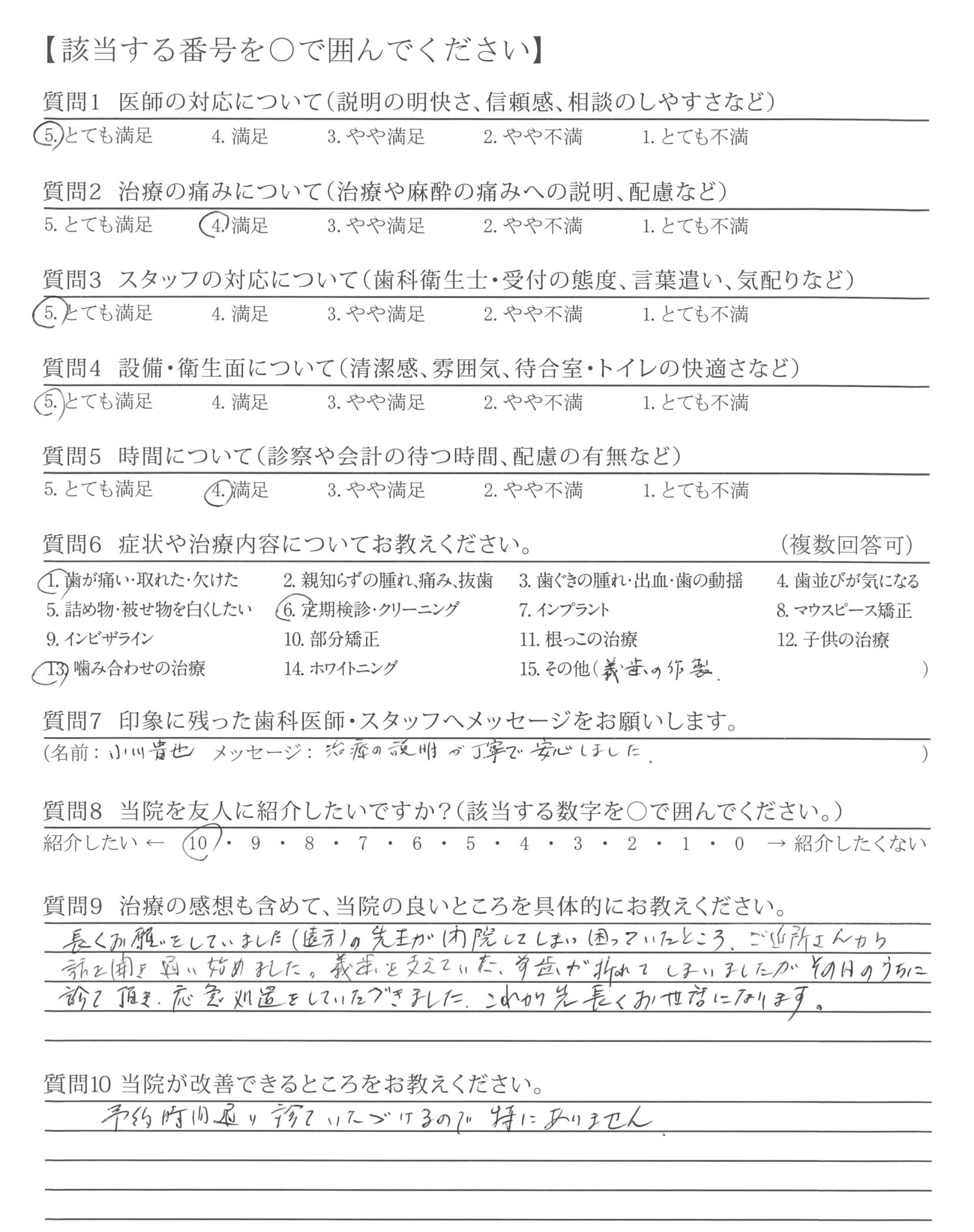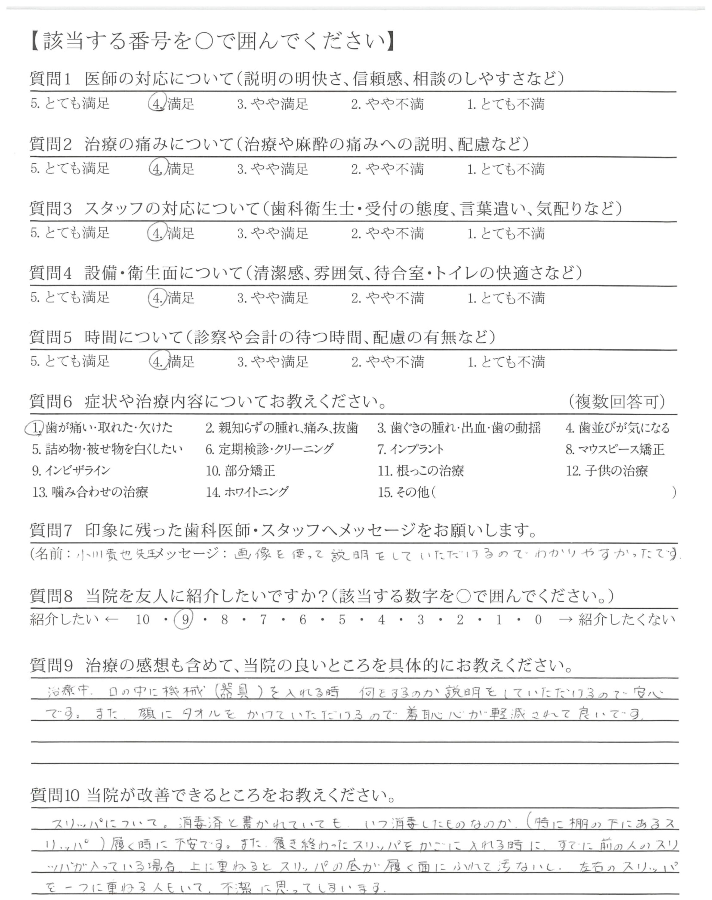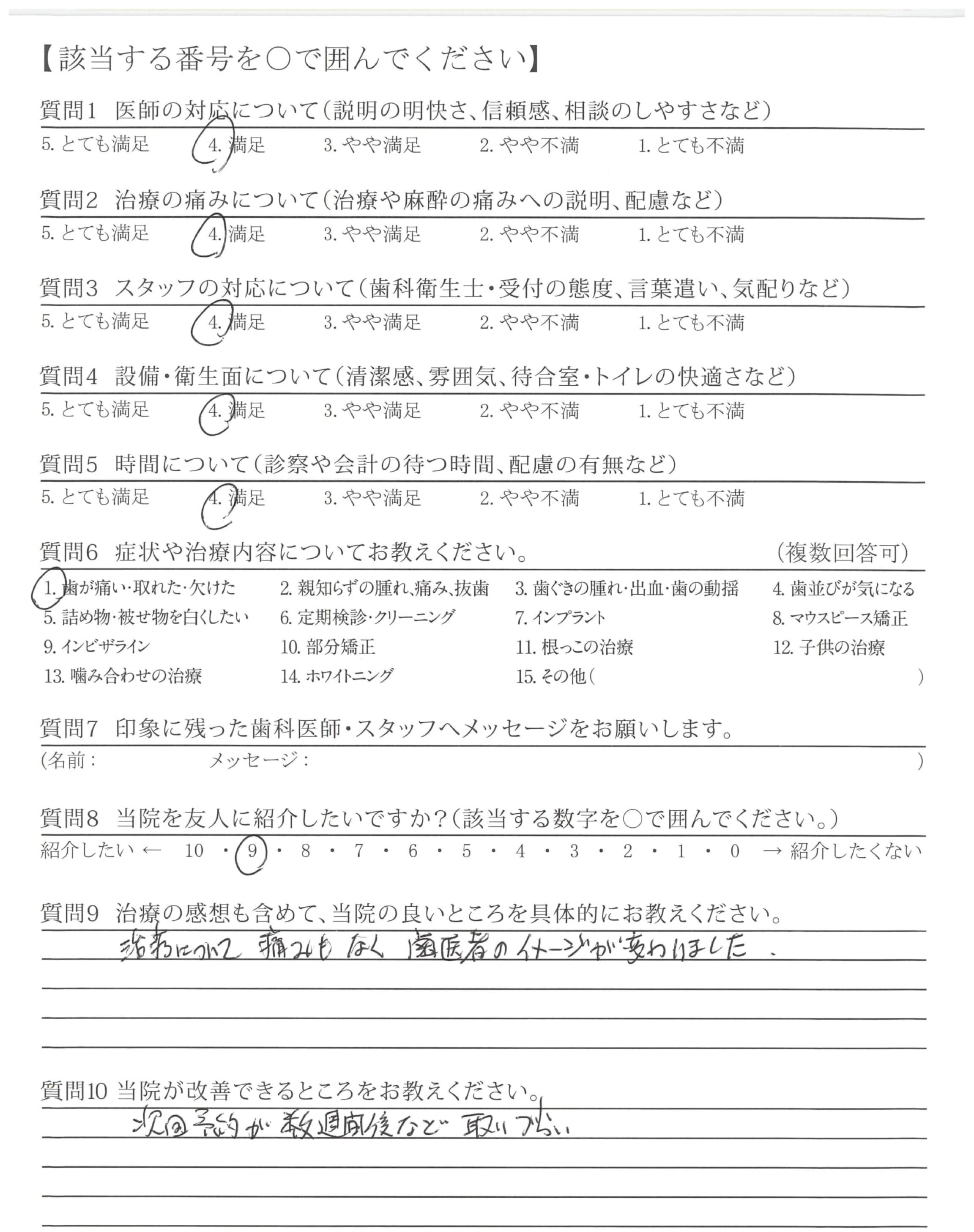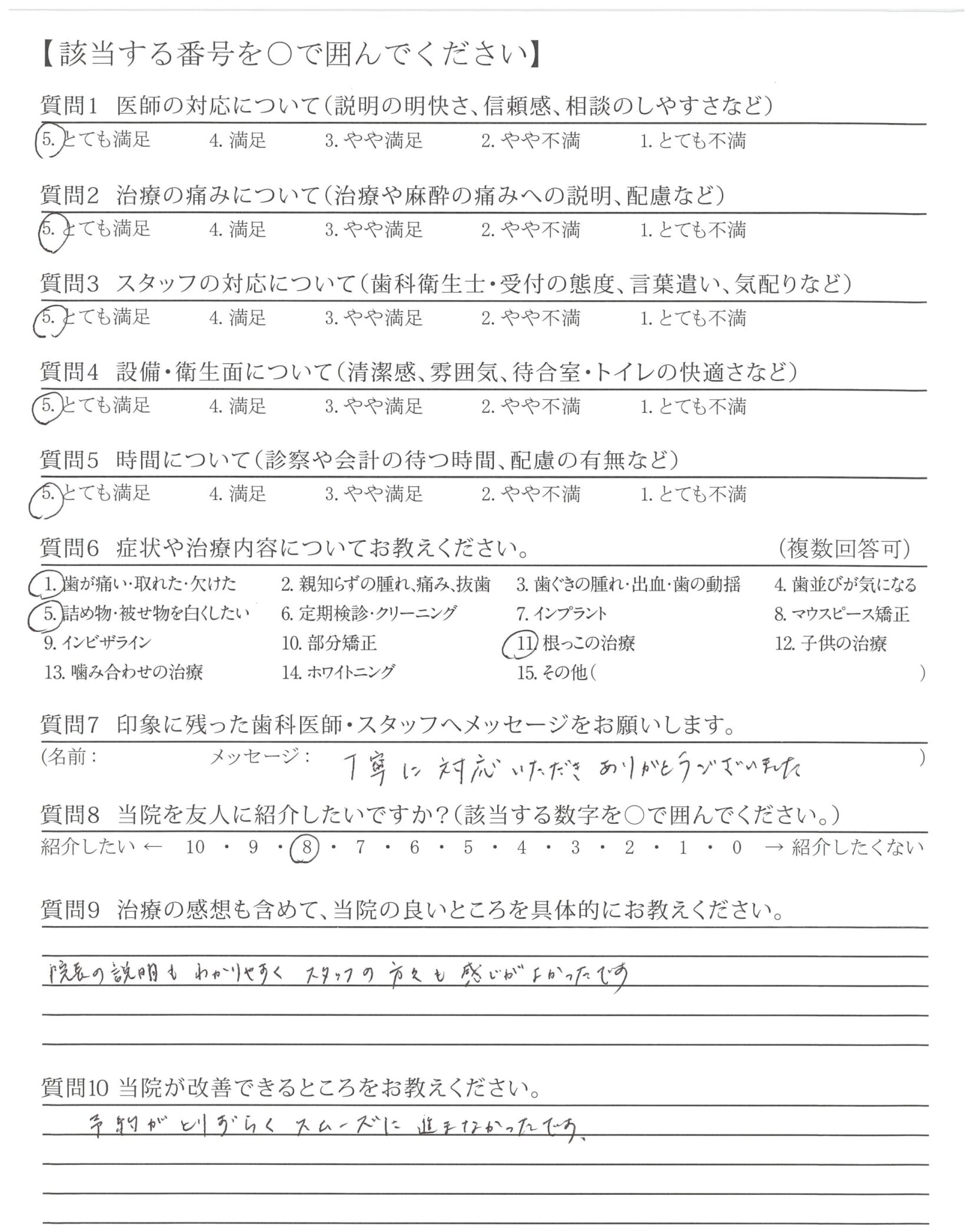 麻酔含め治療の痛みもなく、また先生にお願いしたいと思いました。いつもありがとうございます。