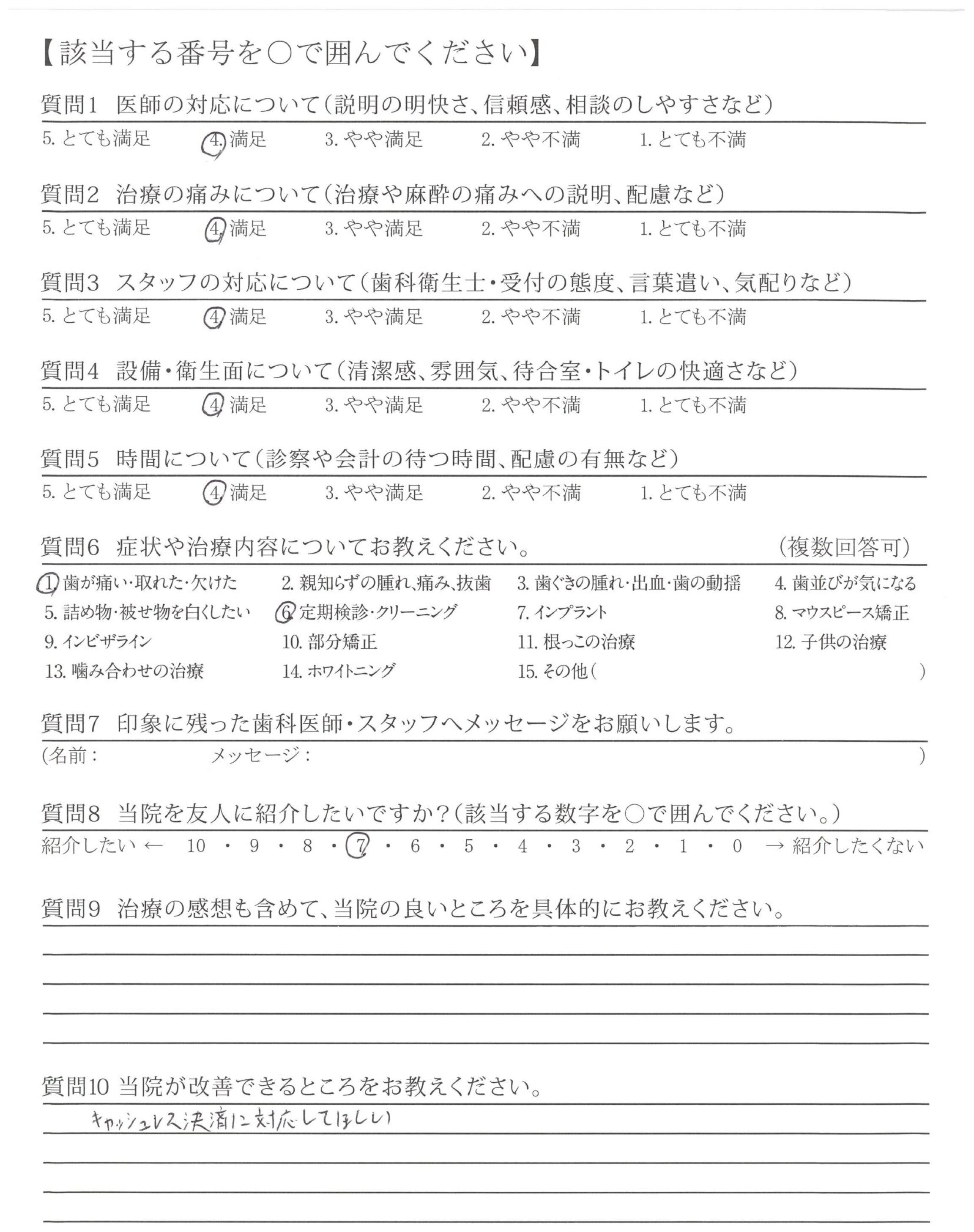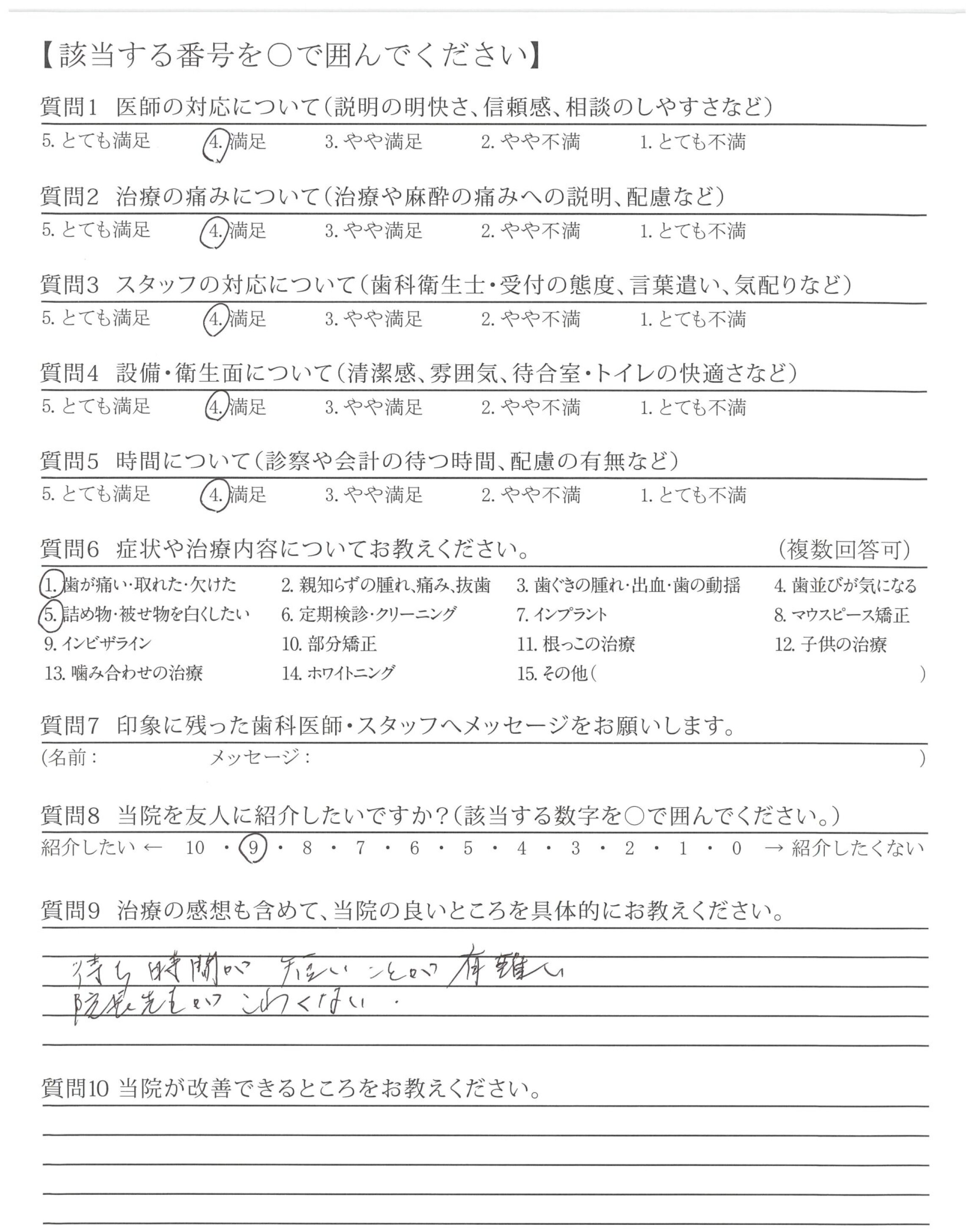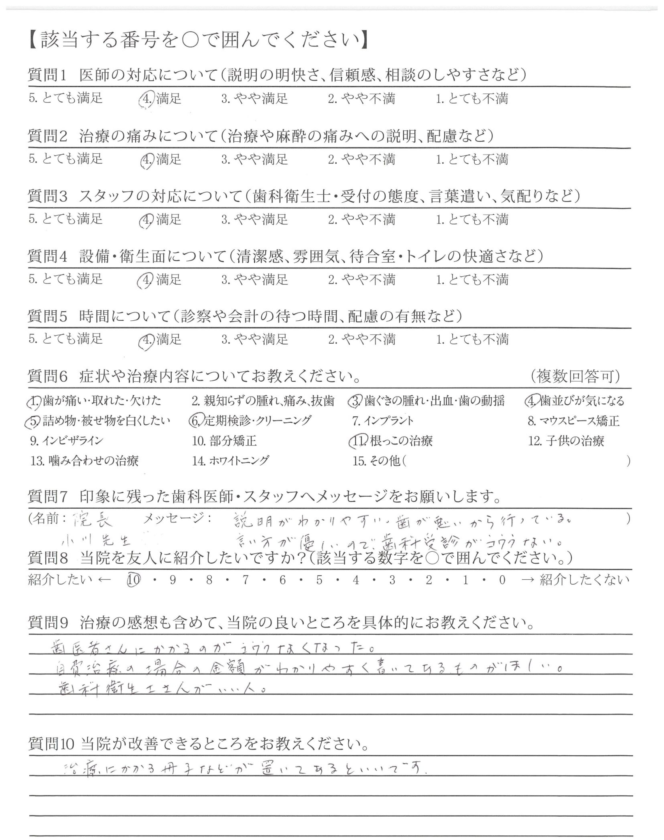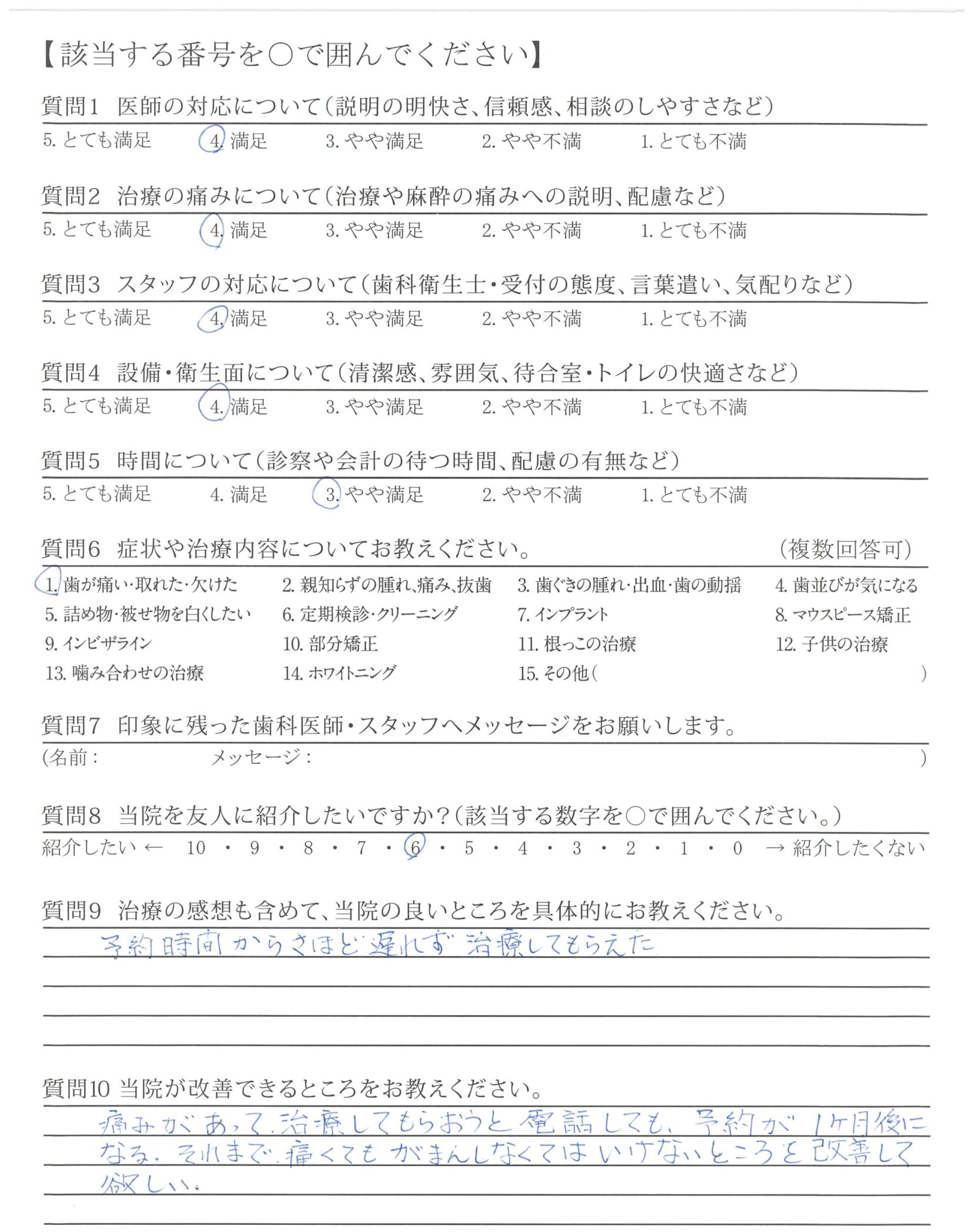 麻酔含め治療の痛みもなく、また先生にお願いしたいと思いました。いつもありがとうございます。