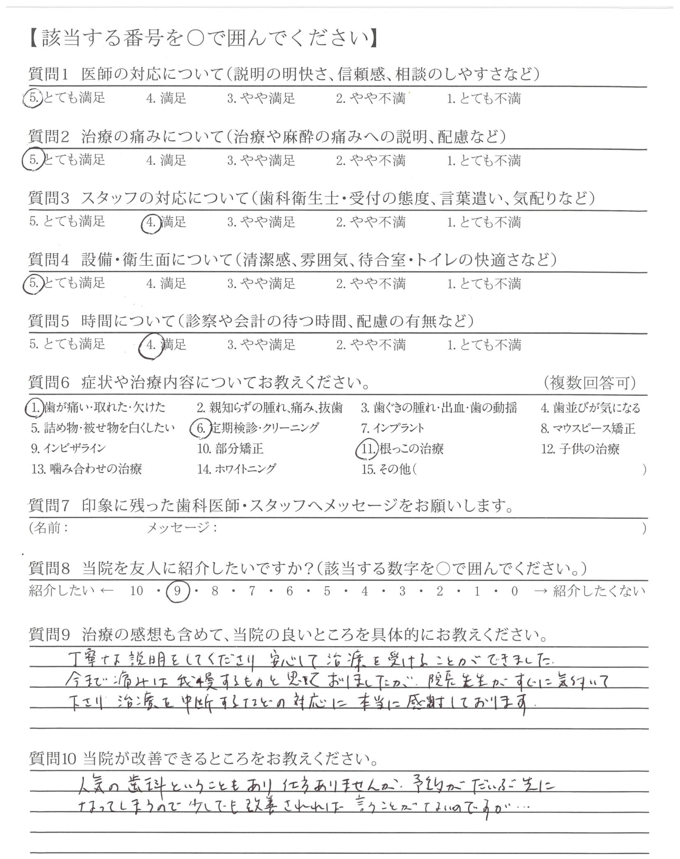 根っこの治療で時間のかかるものでしたが、親身に相談にのっていただきました。