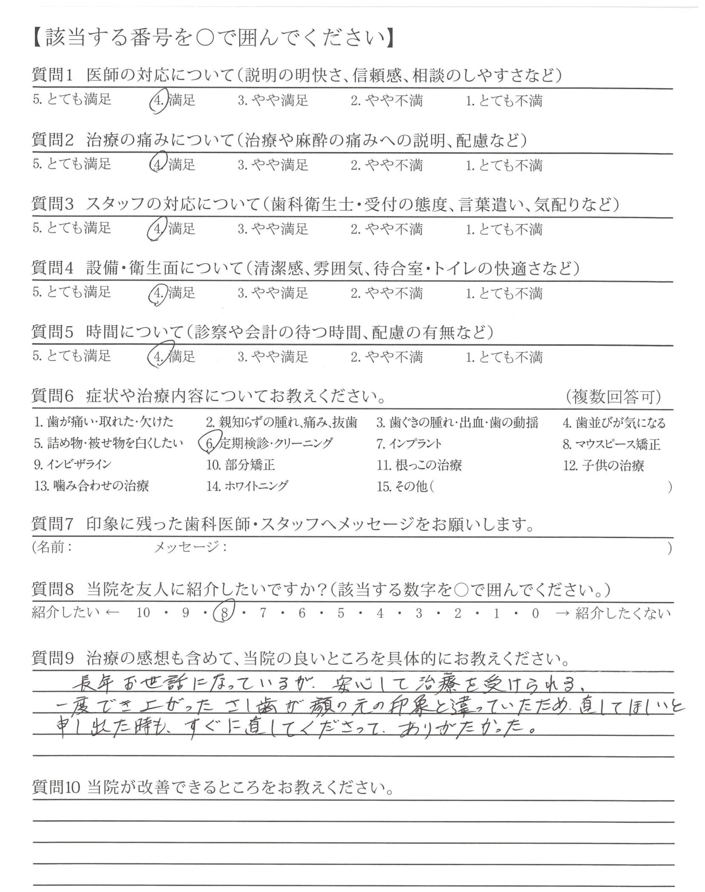 一度でき上がったさし歯が顔の元の印象と違っていたため、直してほしいと申し出た時も、すぐに直してくださって、ありがたかった。
