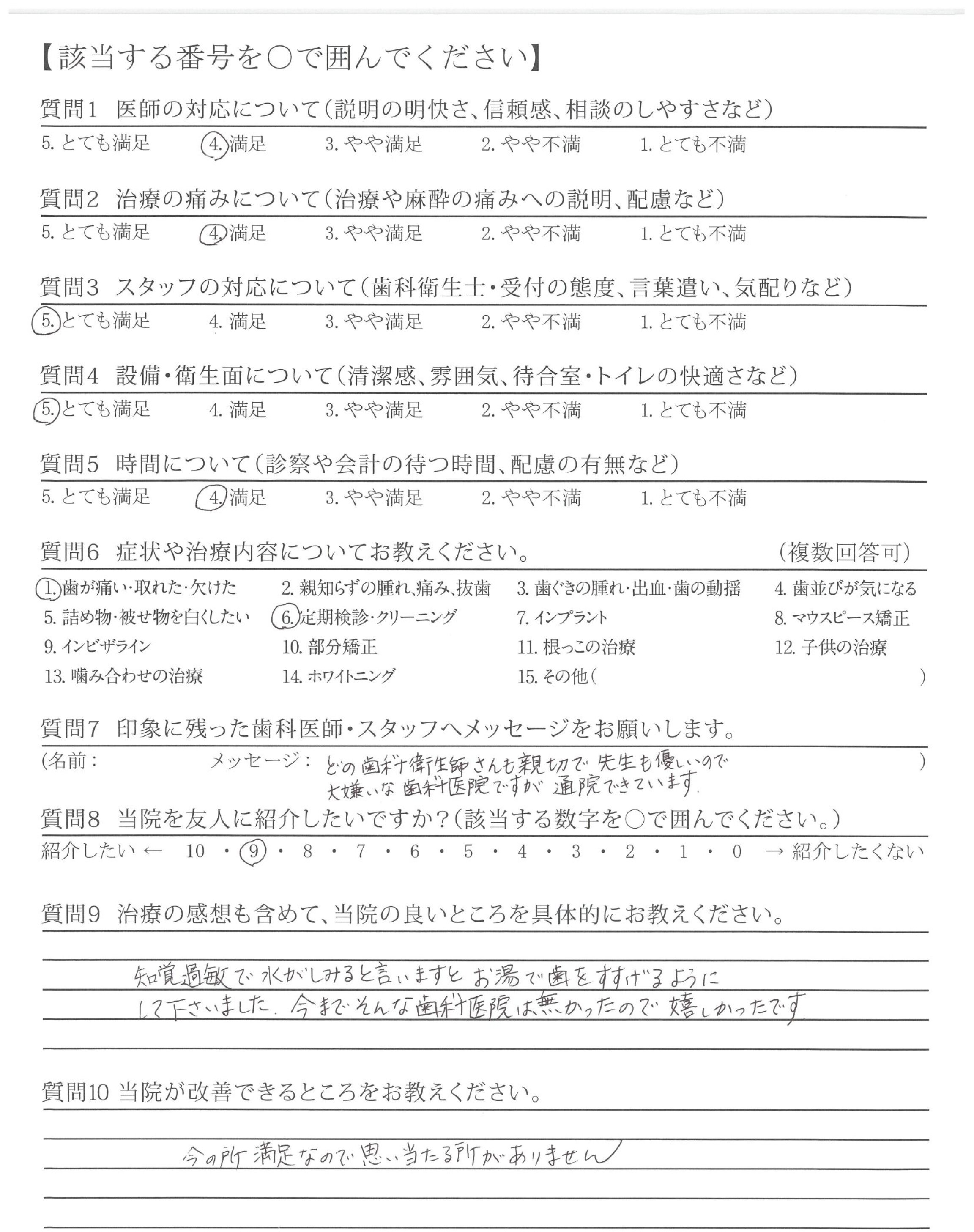 知覚過敏で水がしみると言いますとお湯で歯をすすげるようにして下さいました。今までそんな歯科医院は無かったので嬉しかったです。