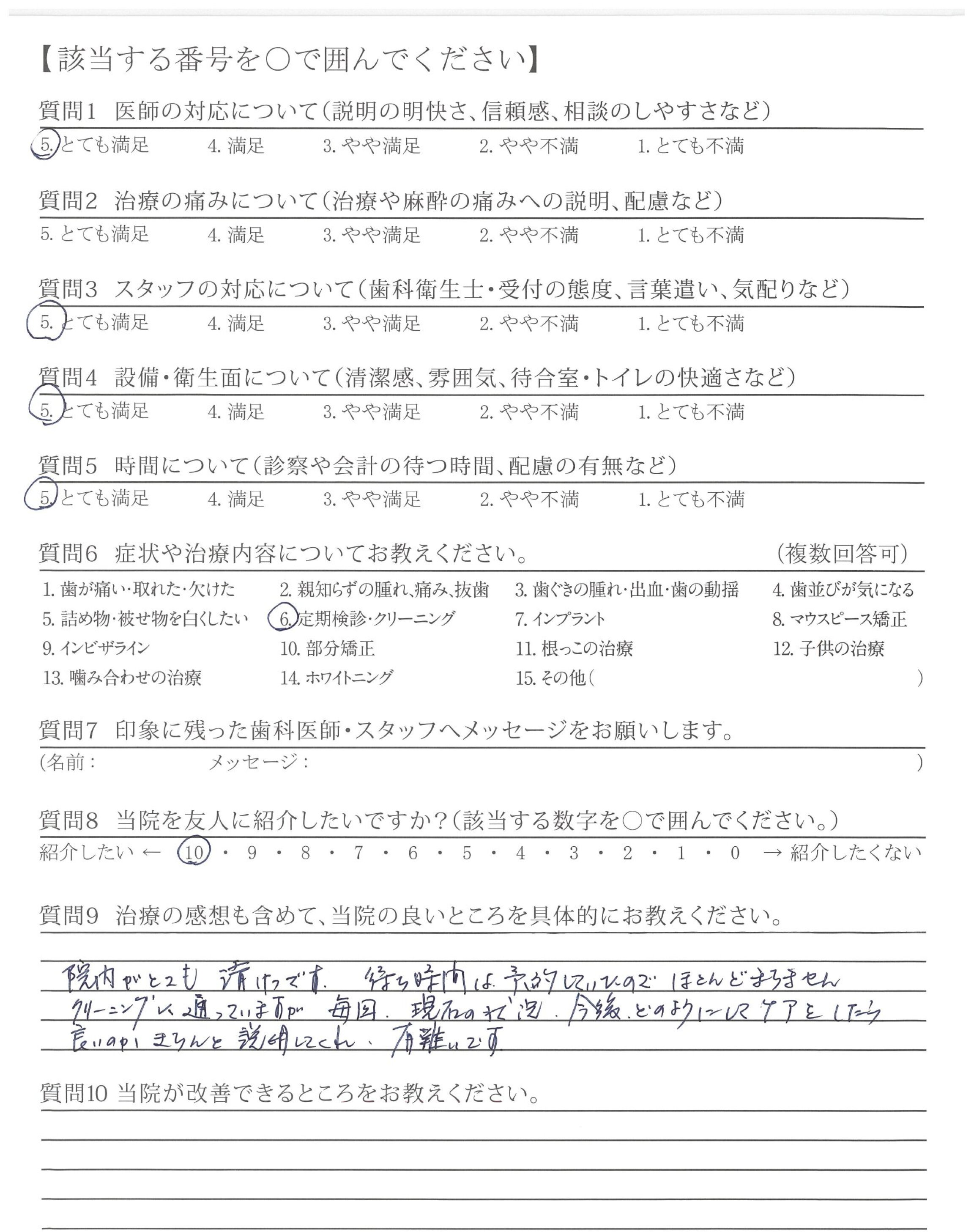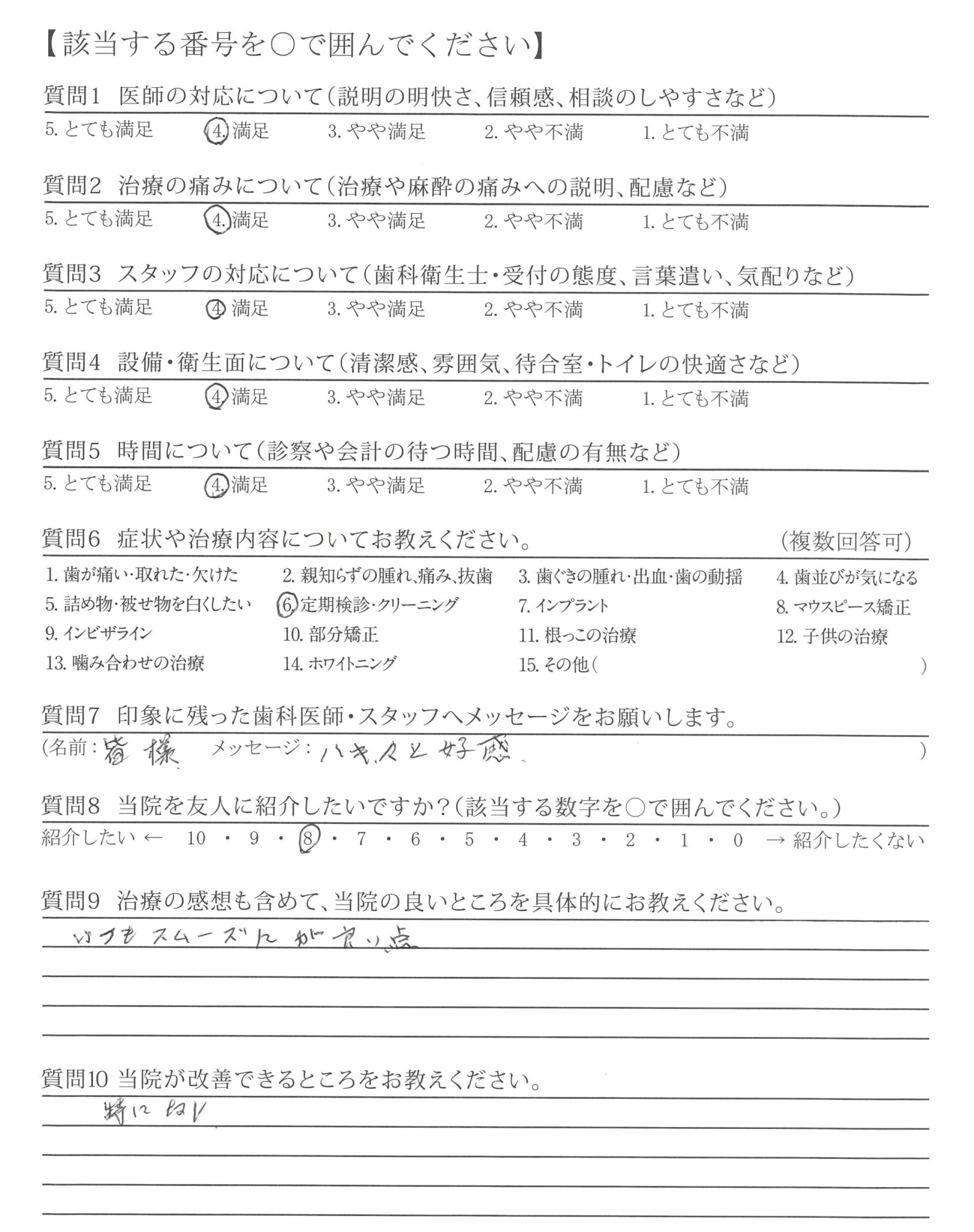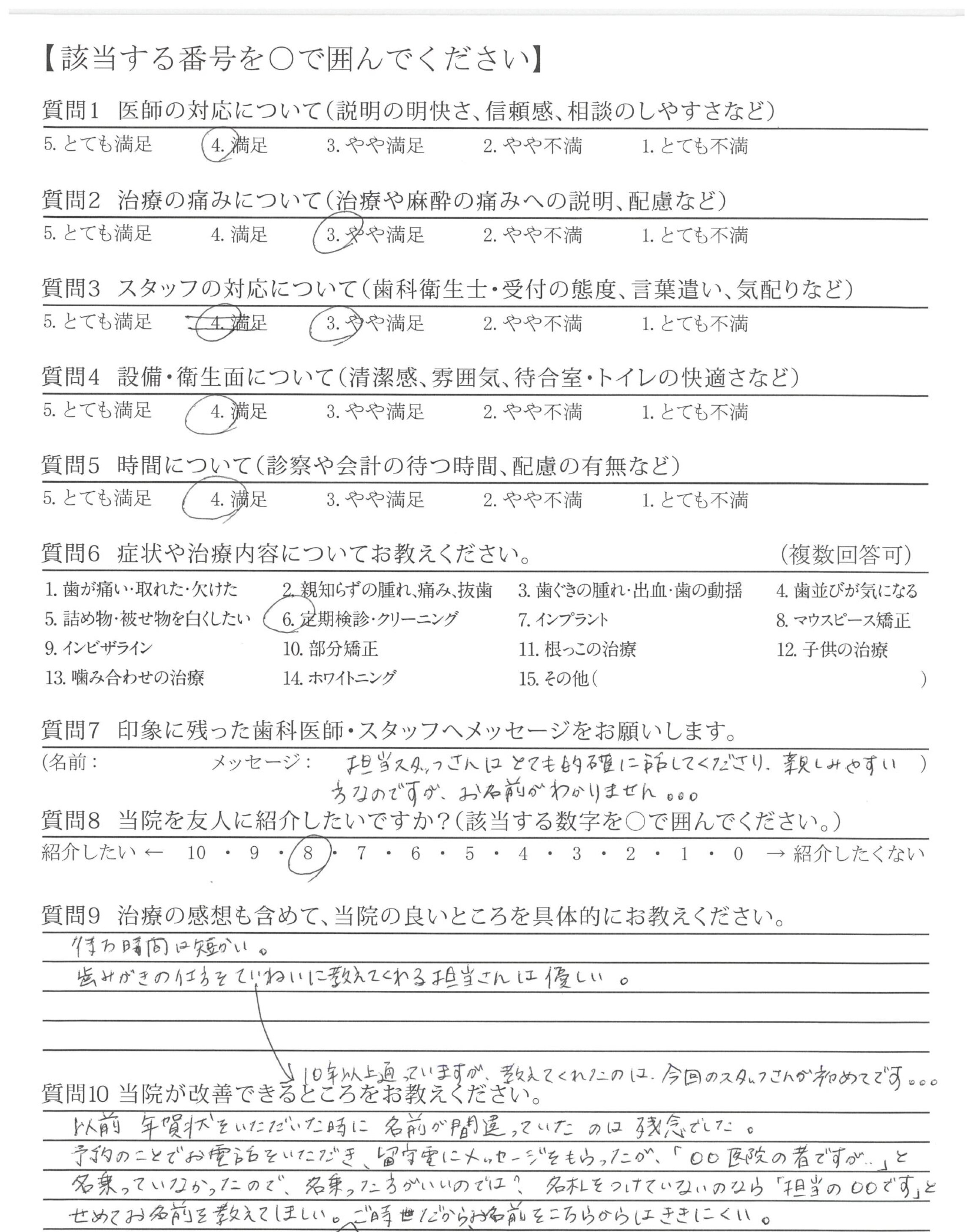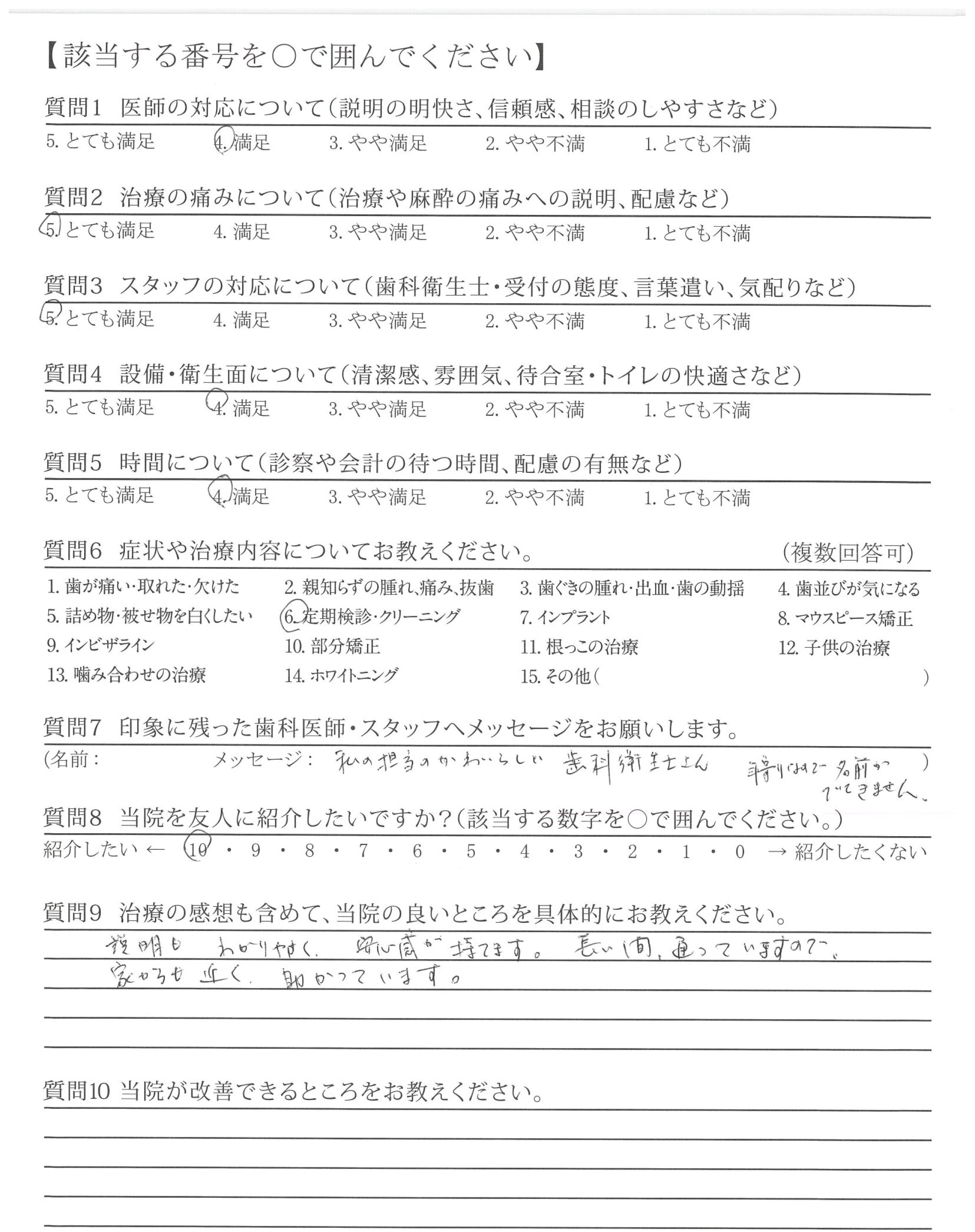 いつも、ご担当頂く接遇が素晴らしい歯科衛生士さんへ、前回、自費治療(エアフロー)を受けた時、患者さんの立場になって考えた、歯科衛生士さんの細かな気配り・心配りは素晴らしく印象的でした。これからもよろしくお願い致します。