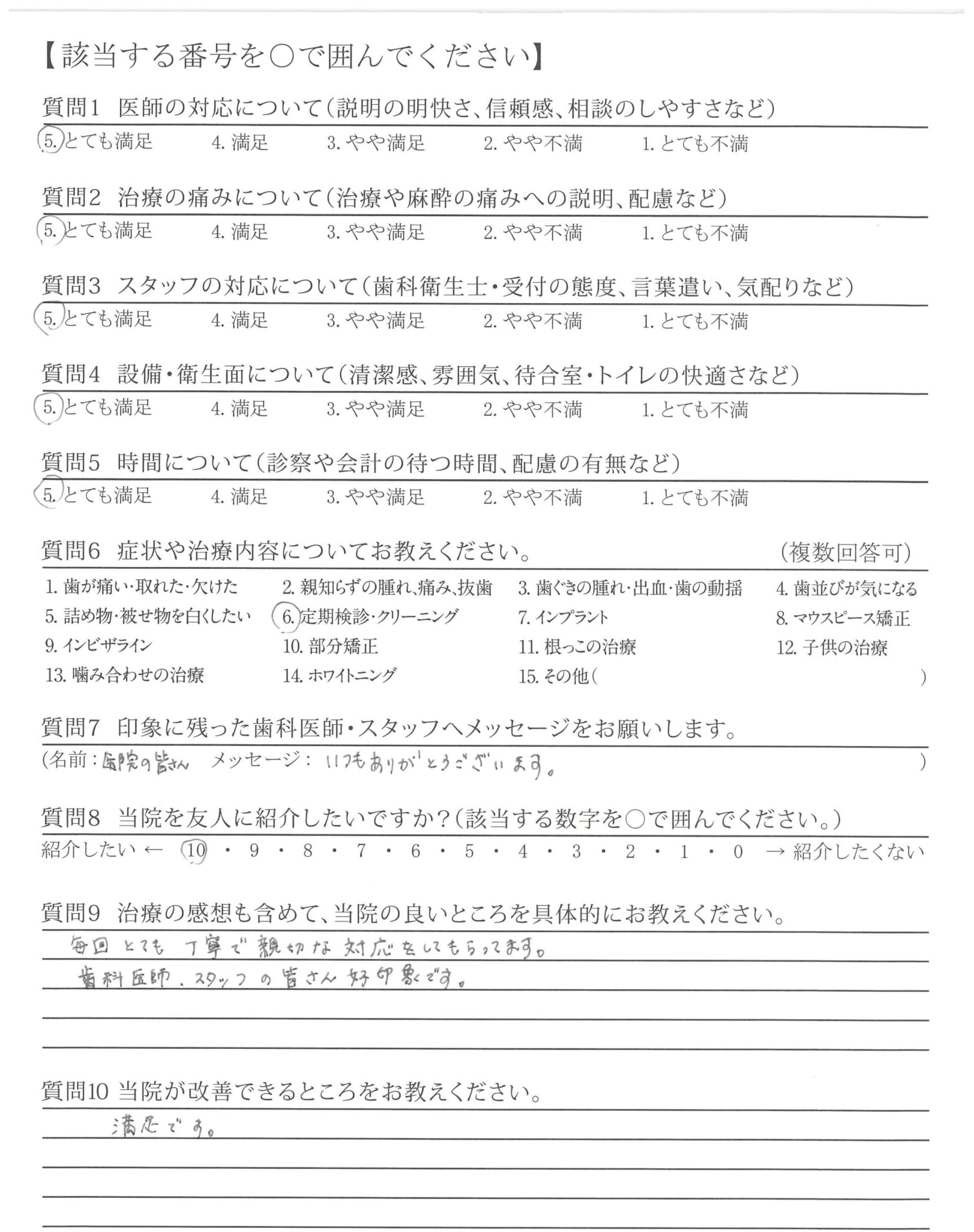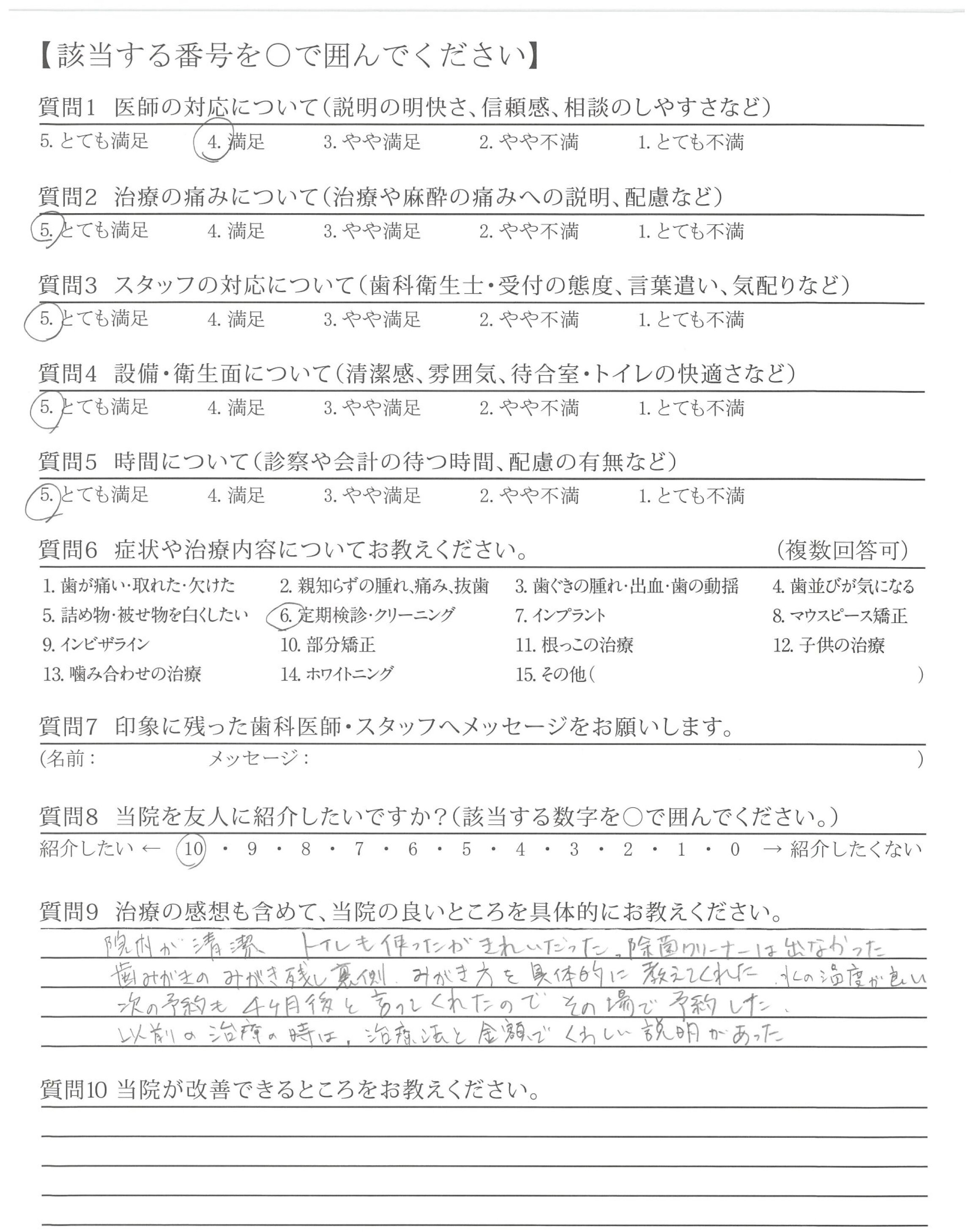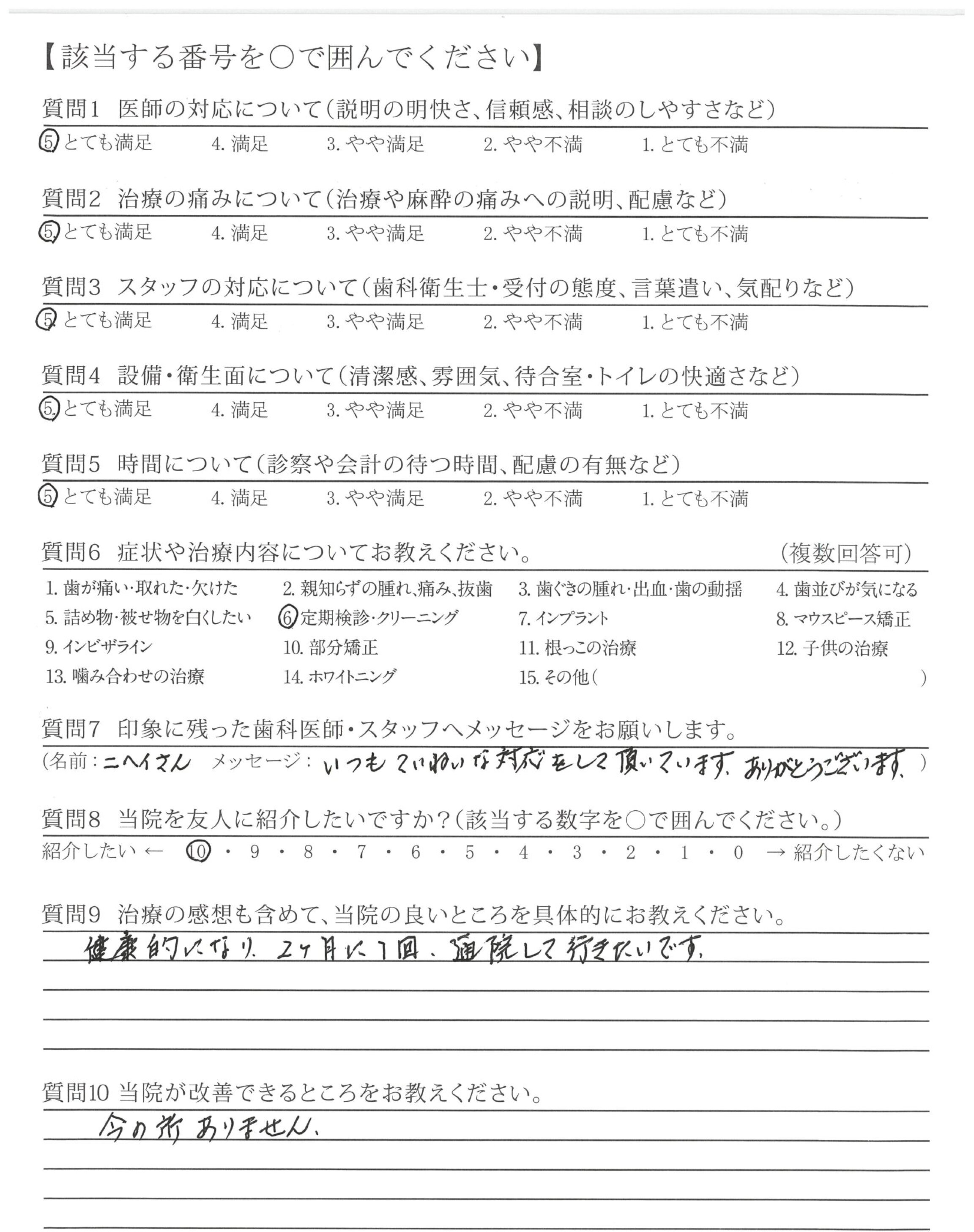 いつも、ご担当頂く接遇が素晴らしい歯科衛生士さんへ、前回、自費治療(エアフロー)を受けた時、患者さんの立場になって考えた、歯科衛生士さんの細かな気配り・心配りは素晴らしく印象的でした。これからもよろしくお願い致します。